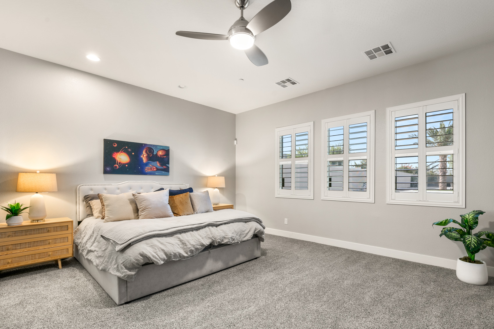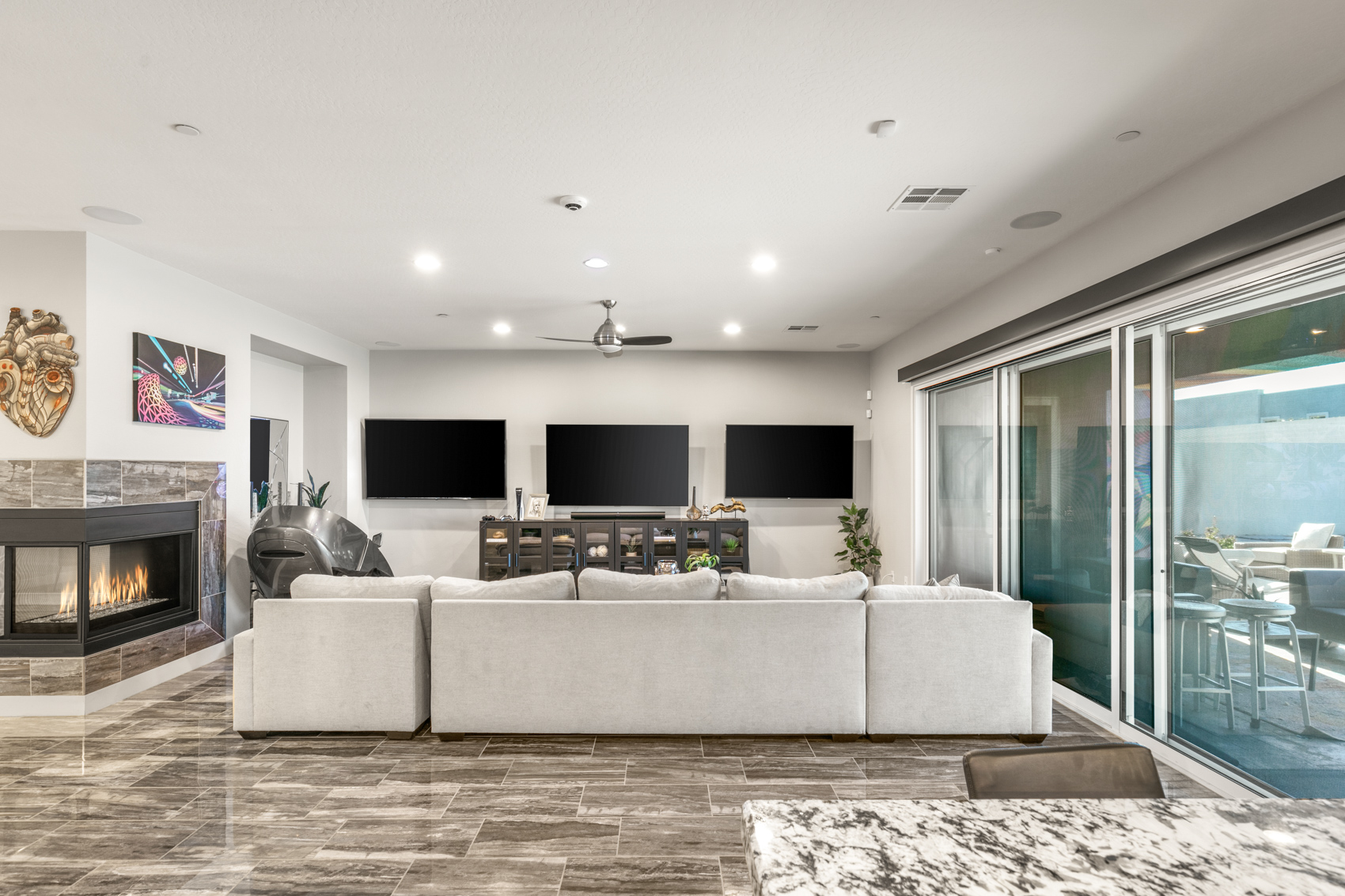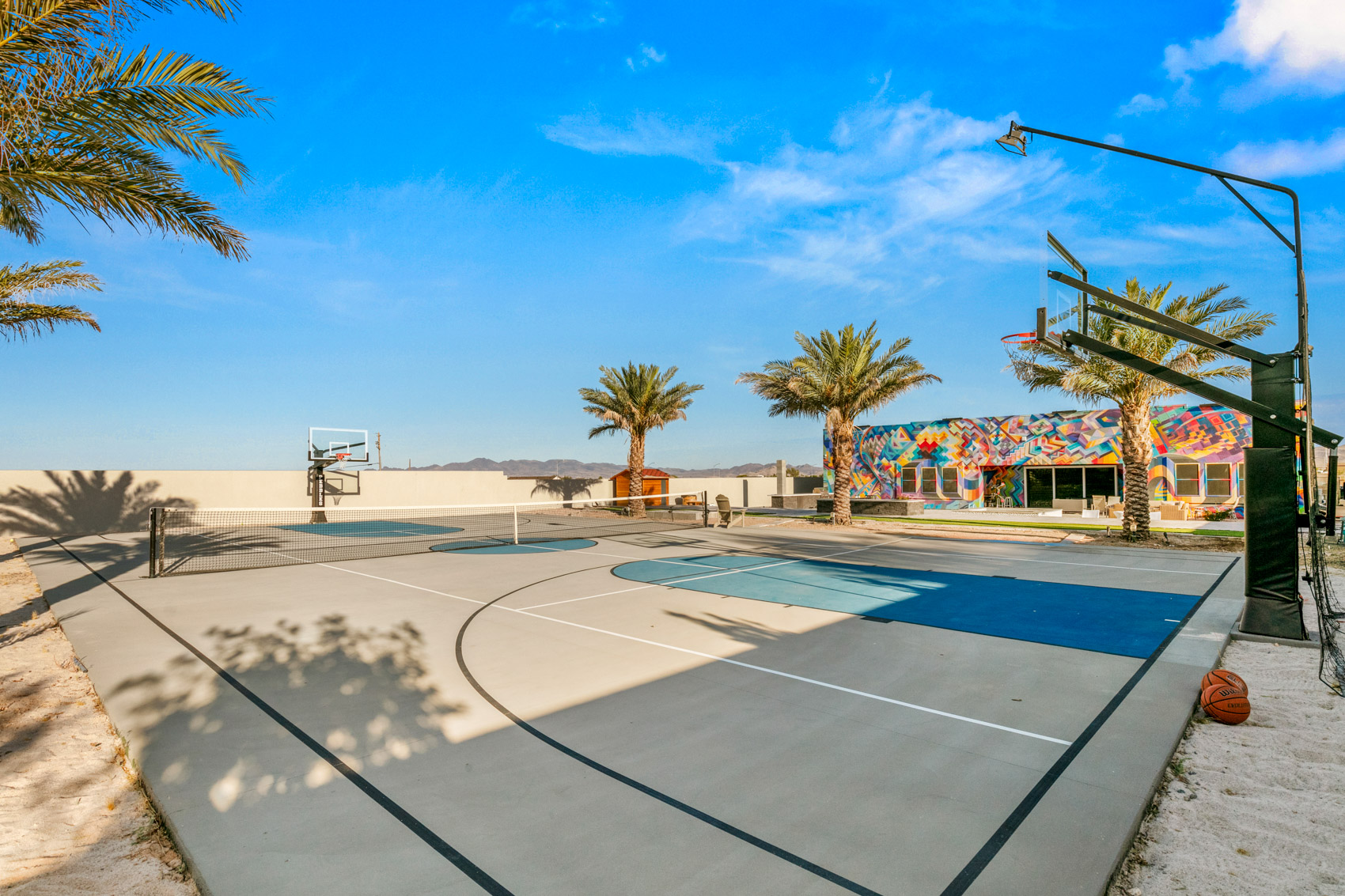 The living room, great room, and dining room are connected by a striking double fireplace, creating a warm and inviting atmosphere. The chefās kitchen is a culinary dream, equipped with an oversized island, upgraded stainless steel appliances, custom ribbed cabinets, and a separate eat-at breakfast counter. The primary suite is a private retreat, featuring a huge custom walk-in closet, en-suite bath, and a luxurious soaking tub. Each secondary bedroom includes built-ins and en-suite baths, ensuring comfort and convenience for all. Large triple slide glass doors open to a sprawling backyard that spans over 2/3 of an acre. This outdoor paradise is perfect for entertaining, with a grandfathered-in 77ā pool, spa, sauna, trampoline, outdoor kitchen, and a built-in BBQ area. The ScreenLogic pool function allows you to control water features, RGBTW lights, water spouts, and waterfalls with ease. Enjoy the fire feature alongside the pool as you relax under the stars. For sports enthusiasts, the property includes a full outdoor basketball court, sand volleyball court, and a tennis/pickleball court. The home is powered by owned solar panels, ensuring energy efficiency and sustainability. One of the most unique aspects of this property is its location. The Southwest Las Vegas area is known for its vibrant community, excellent schools, and proximity to the new Durango Resort, UNCOMMONS, shopping, dining, and entertainment options. Homes like this are a rare find in today's market. Don't miss the opportunity to own a piece of paradise in one of Las Vegas' most sought-after neighborhoods. Schedule your private tour today and experience the luxury and tranquility of 7852 West Torino Avenue.