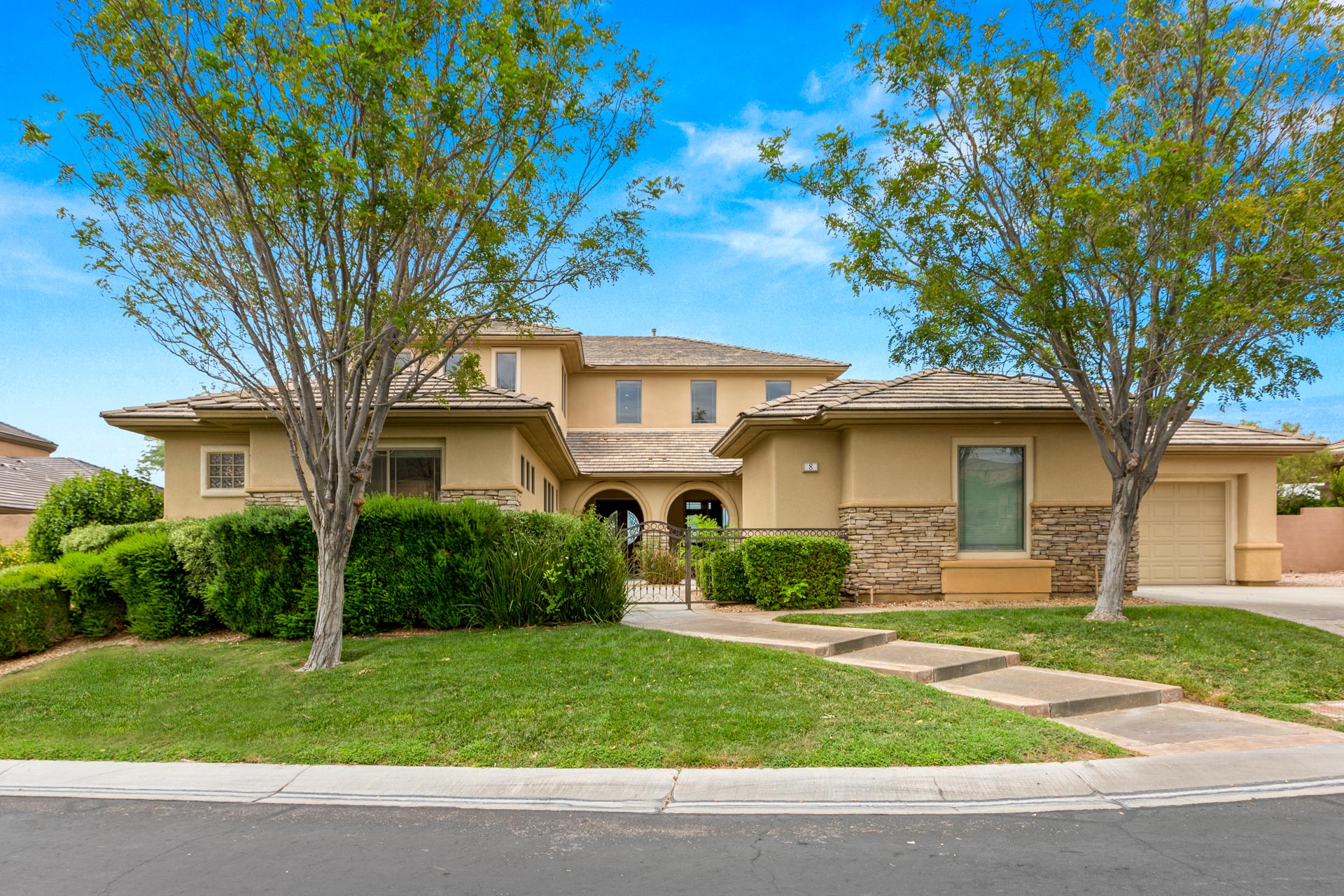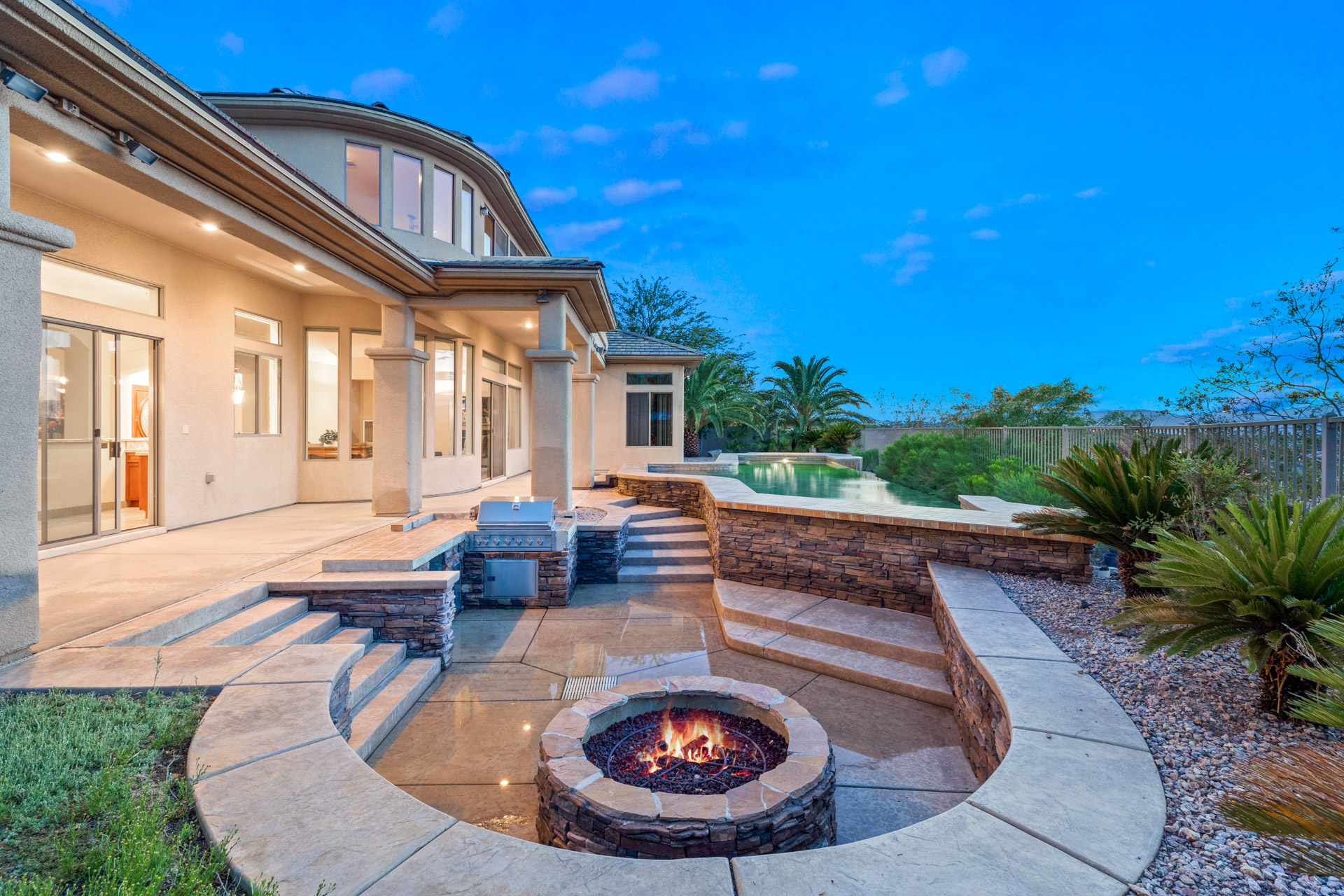 Just outdoors, a sparkling pool and spa adjoin the covered patio. A full outdoor kitchen will serve outdoor entertainment needs, and a massive fire pit with built-in seating is situated just down a few steps from the home's patio. Spaces flow easily from one to another, and from indoors to out in this functionally designed home. In addition to the three private bedroom suites, there is a home office with a private entrance from the home's gated front courtyard. Upstairs, two additional bedrooms, both with ensuite baths and walk-in closets, round out the sleeping space, and there is a huge game room that also features a second convenient wet bar, as well as an outdoor balcony that overlooks the yard and is oriented towards the spectacular nighttime view.