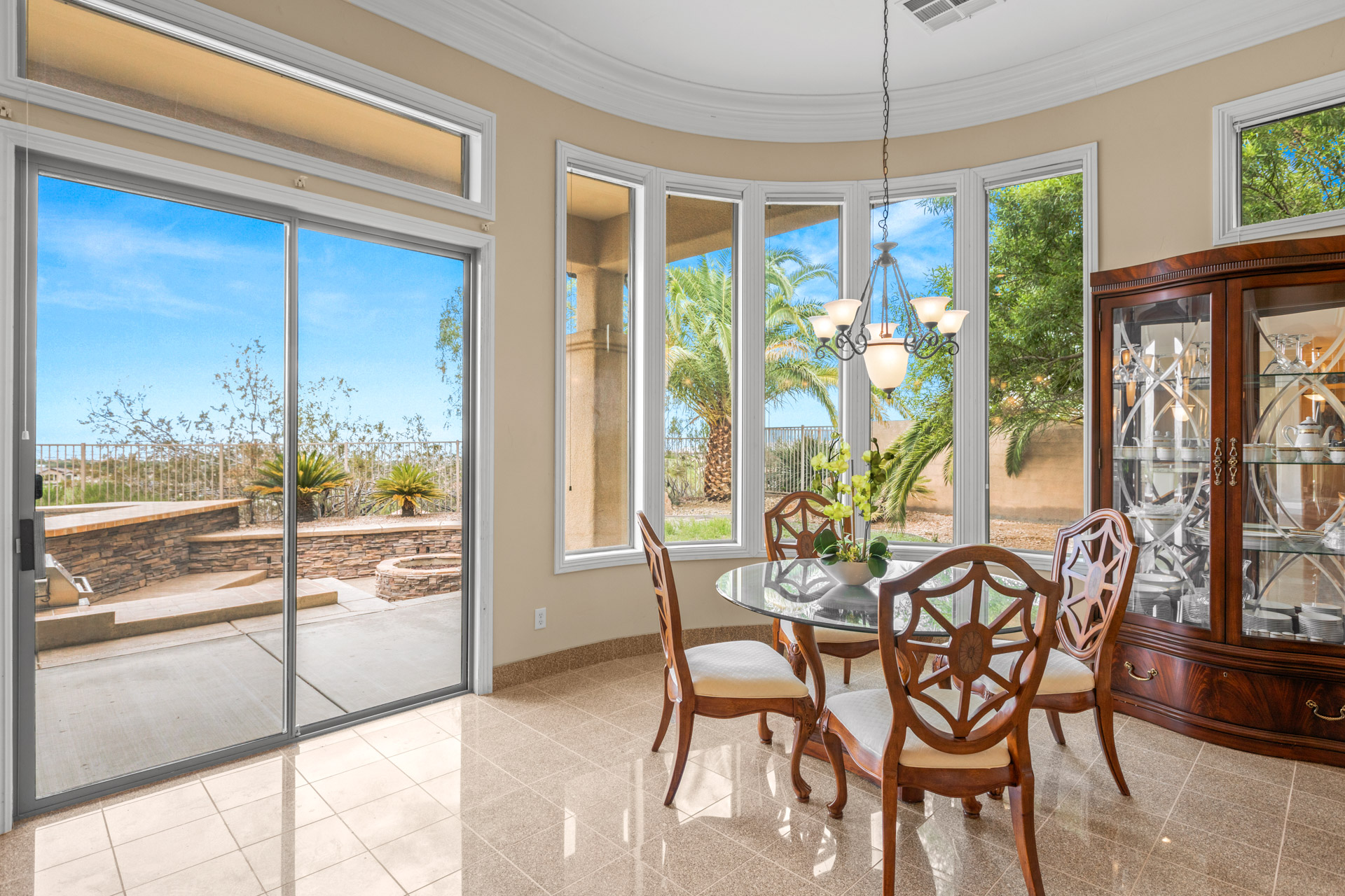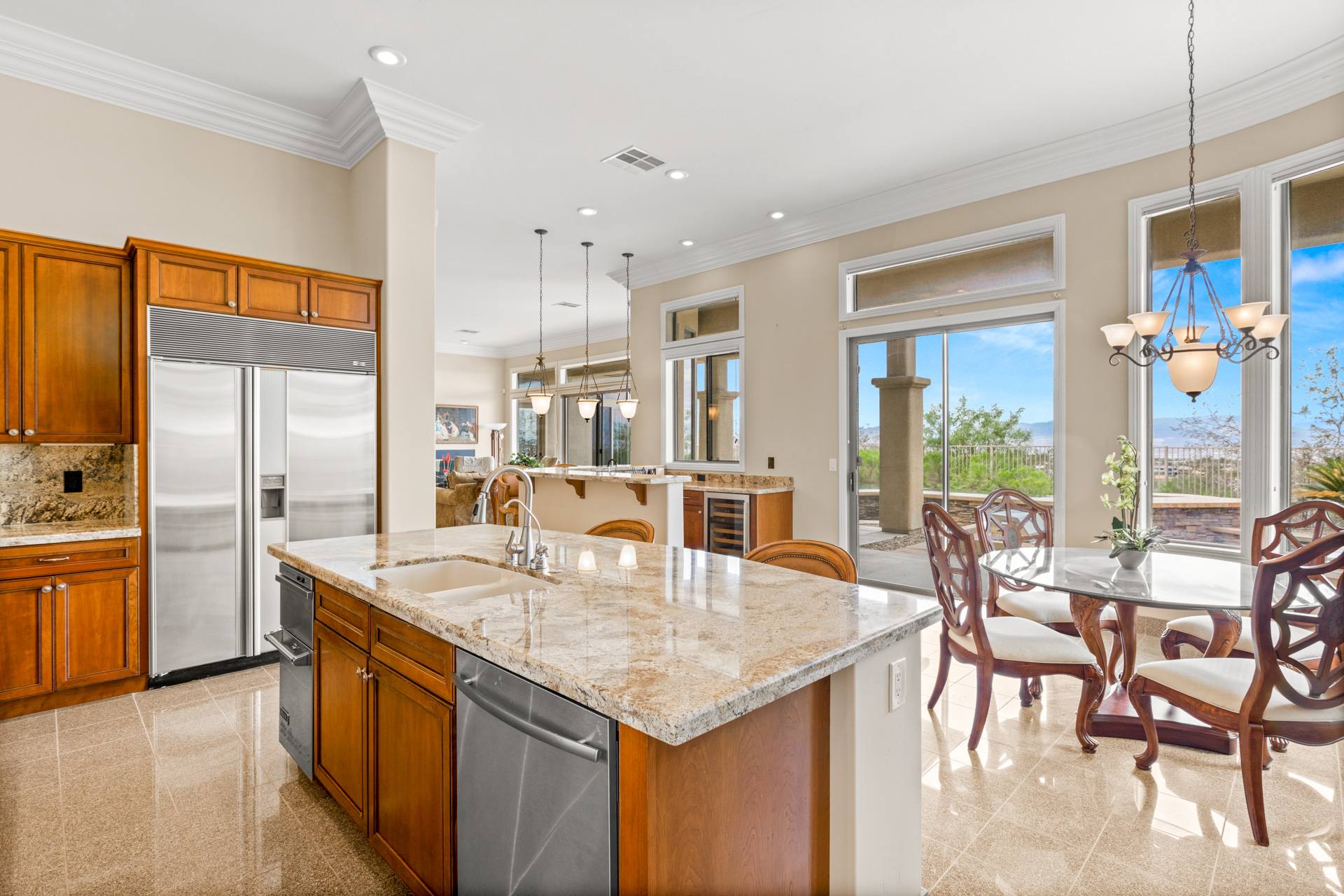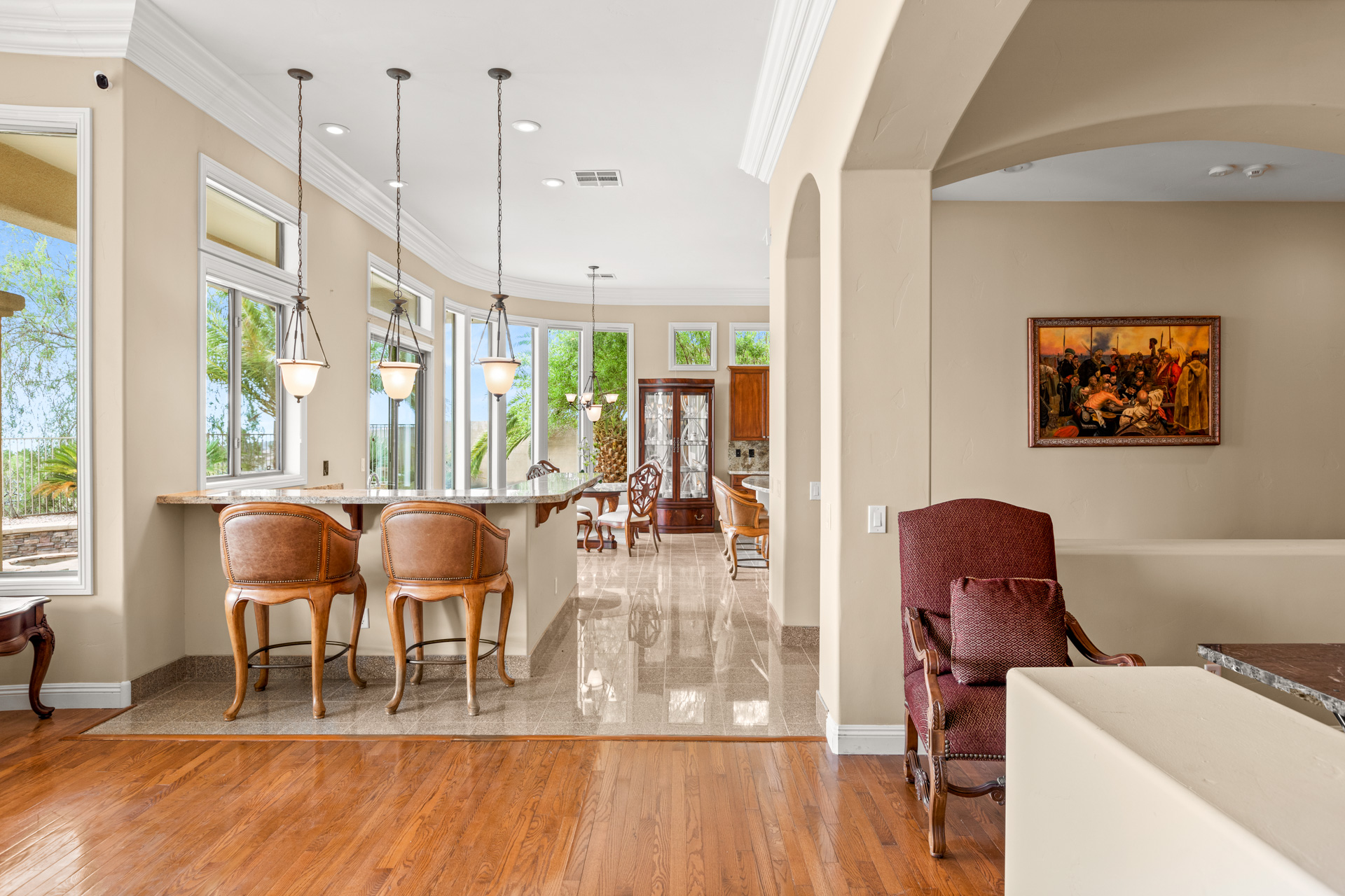 This home features breathtaking panoramic views of the city and The Strip from both levels. Windows overlook the backyard from the expansive great room and distinctive formal dining area. A sit-down wet bar separates the space from the beautiful open-plan kitchen and informal dining area. Stainless Viking and Subzero appliances are featured in the kitchen, with its beautiful custom cabinetry and granite counters