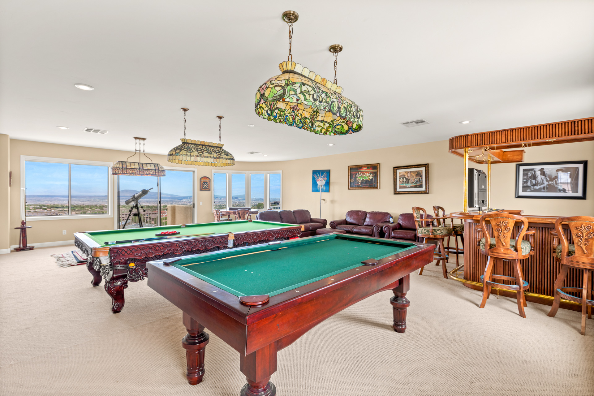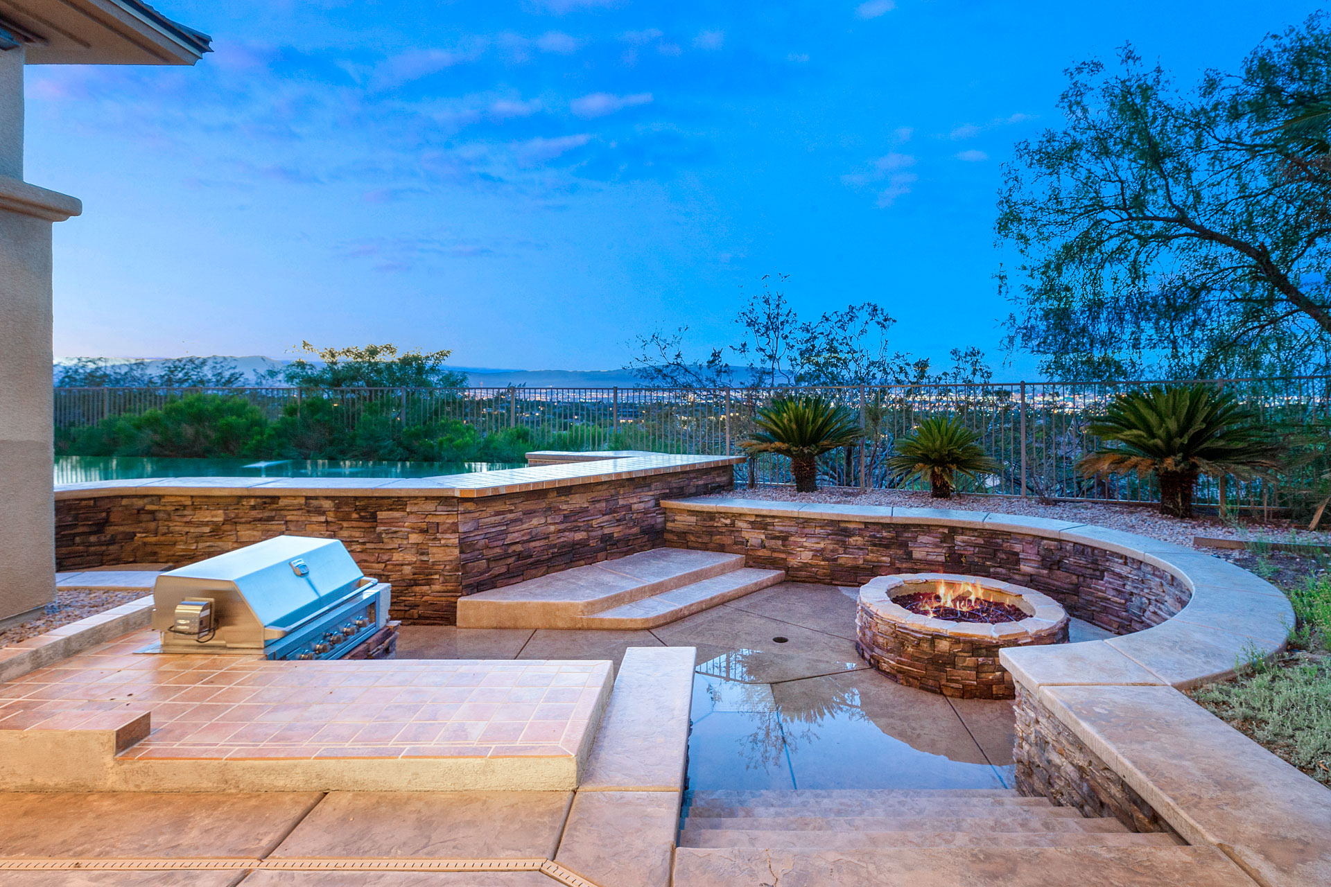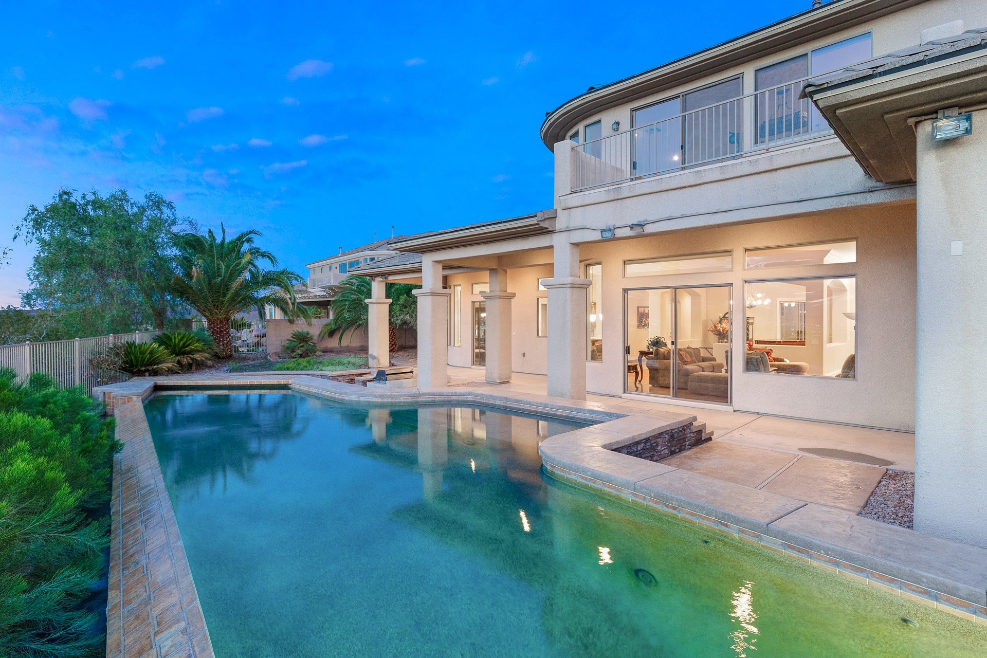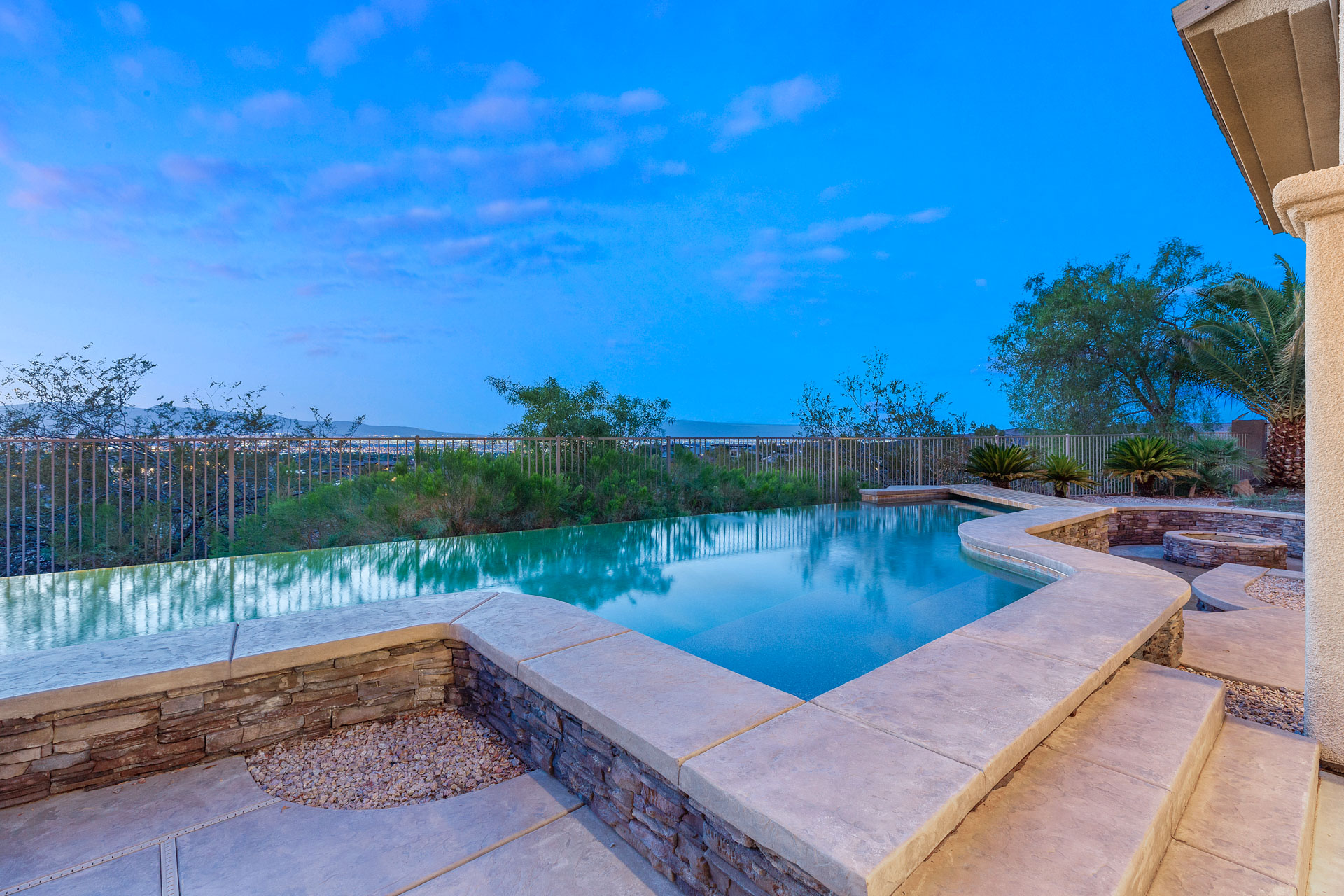 This home features breathtaking panoramic views of the city and The Strip from both levels. Windows overlook the backyard from the expansive great room and distinctive formal dining area. A sit-down wet bar separates the space from the beautiful open-plan kitchen and informal dining area. Stainless Viking and Subzero appliances are featured in the kitchen, with its beautiful custom cabinetry and granite counters