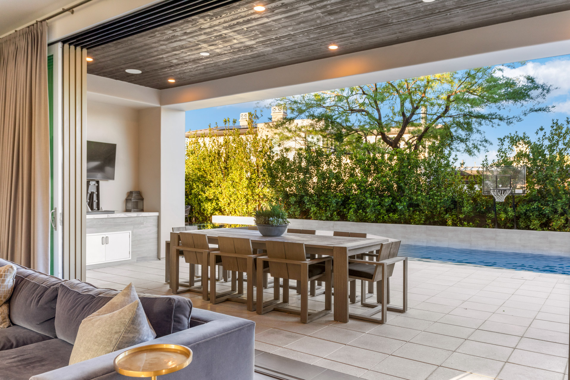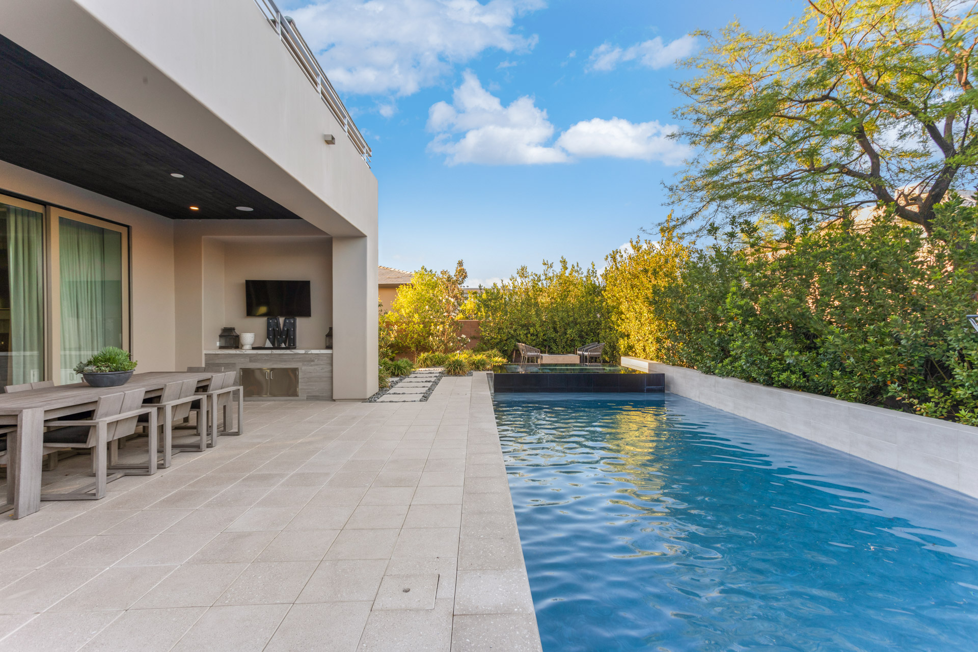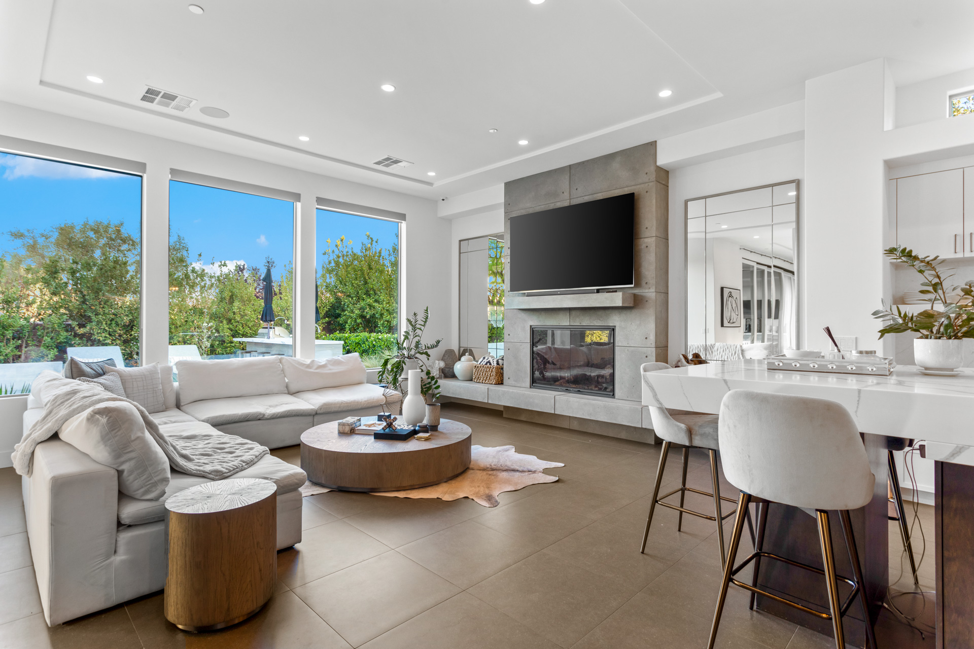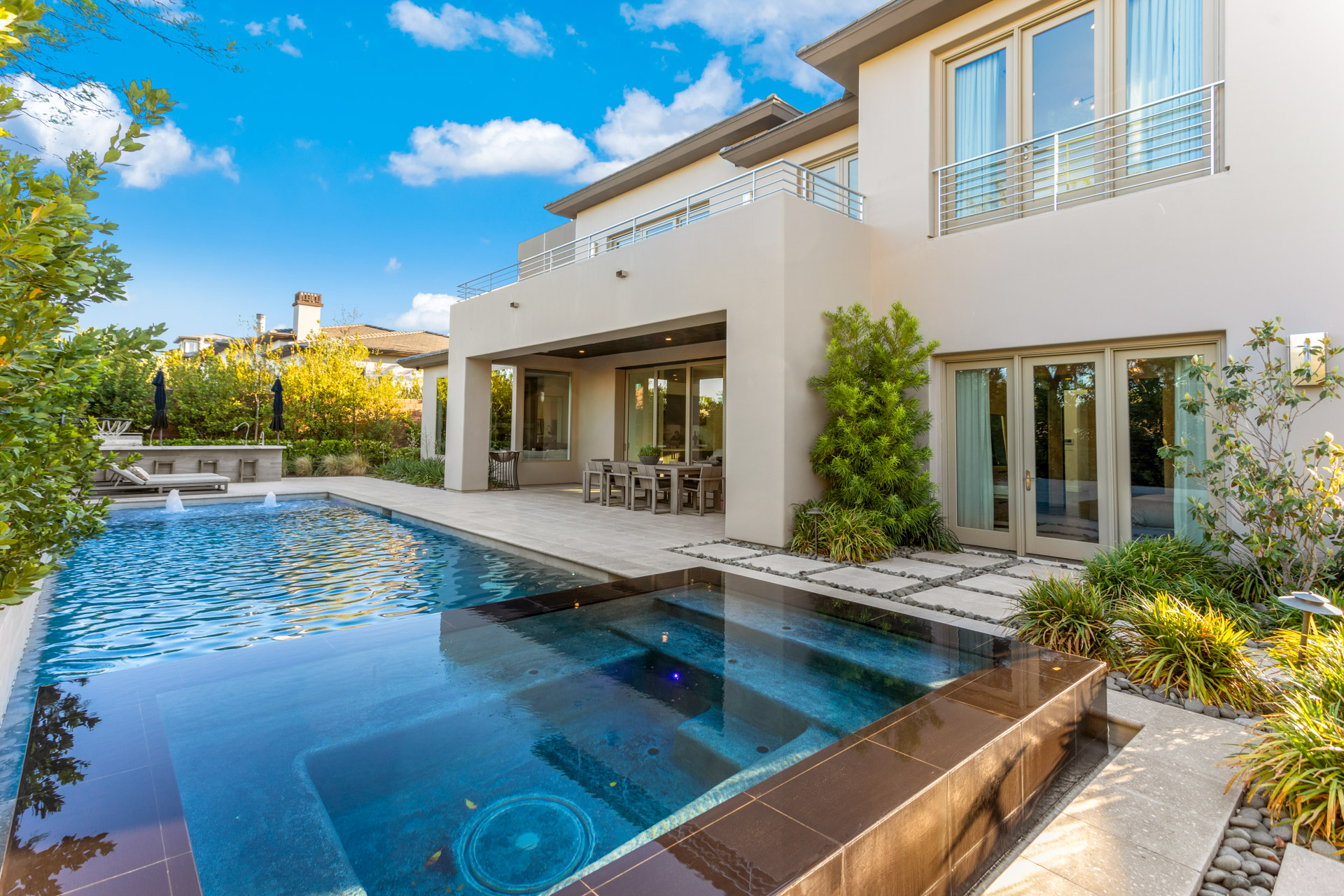 With high-end finishes throughout, the ambiance is dazzling. The living spaces open to outdoor spaces seamlessly. The primary suite includes a full office, a cozy fireplace, and expansive closet space. The primary bathroom enjoys a large soaking tub, his and hers counters, and a luxury walk-in shower. The kitchen features open shelving combined with custom cabinetry. Gas ovens and a gas stovetop make for great cooking, and the marble island is plenty large. The kitchen also features a built-in espresso machine. The modern pool and spa provide a beautiful focal point for the backyard space. An outdoor dining area, outdoor fireplace, and barbeque make for great entertainment.