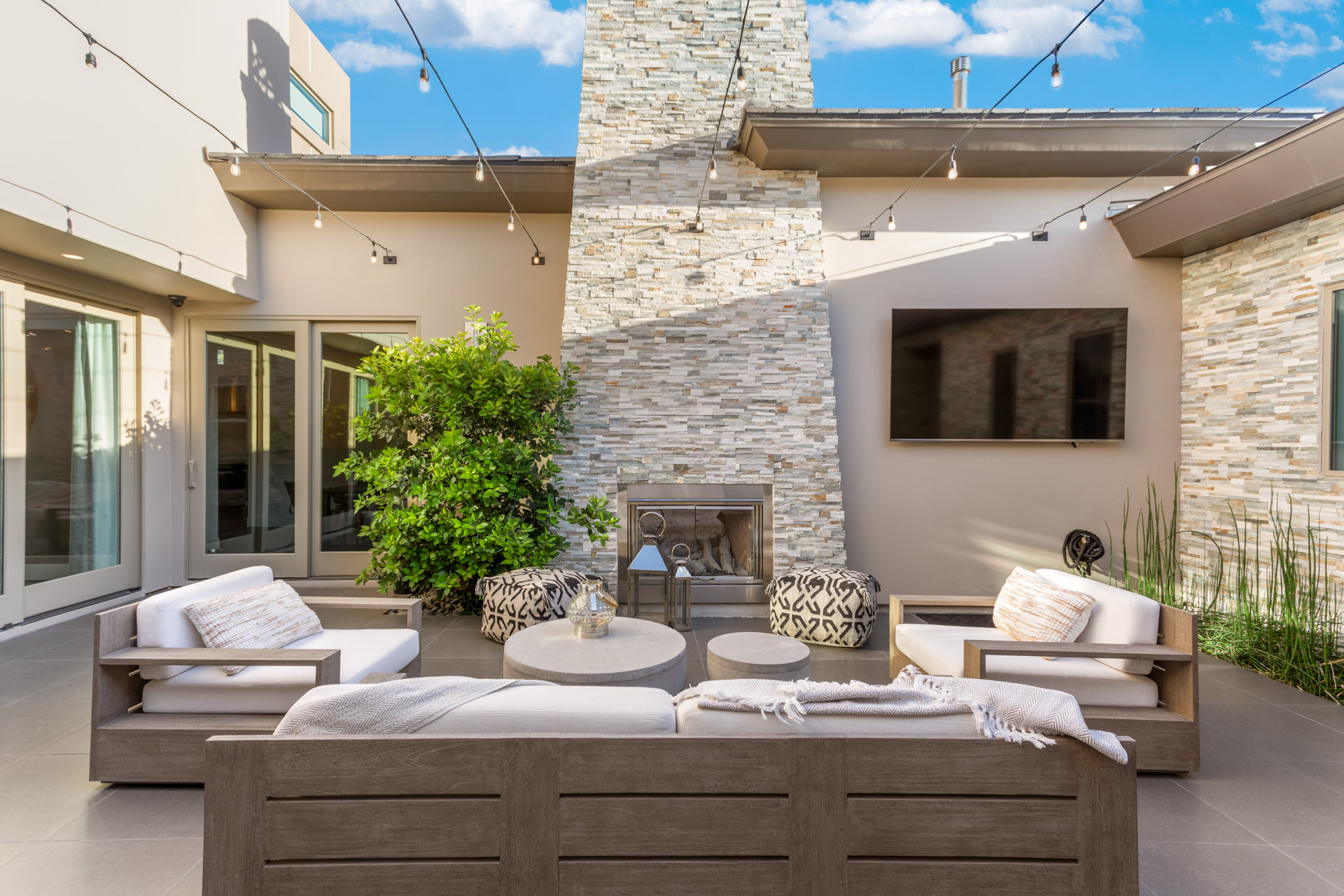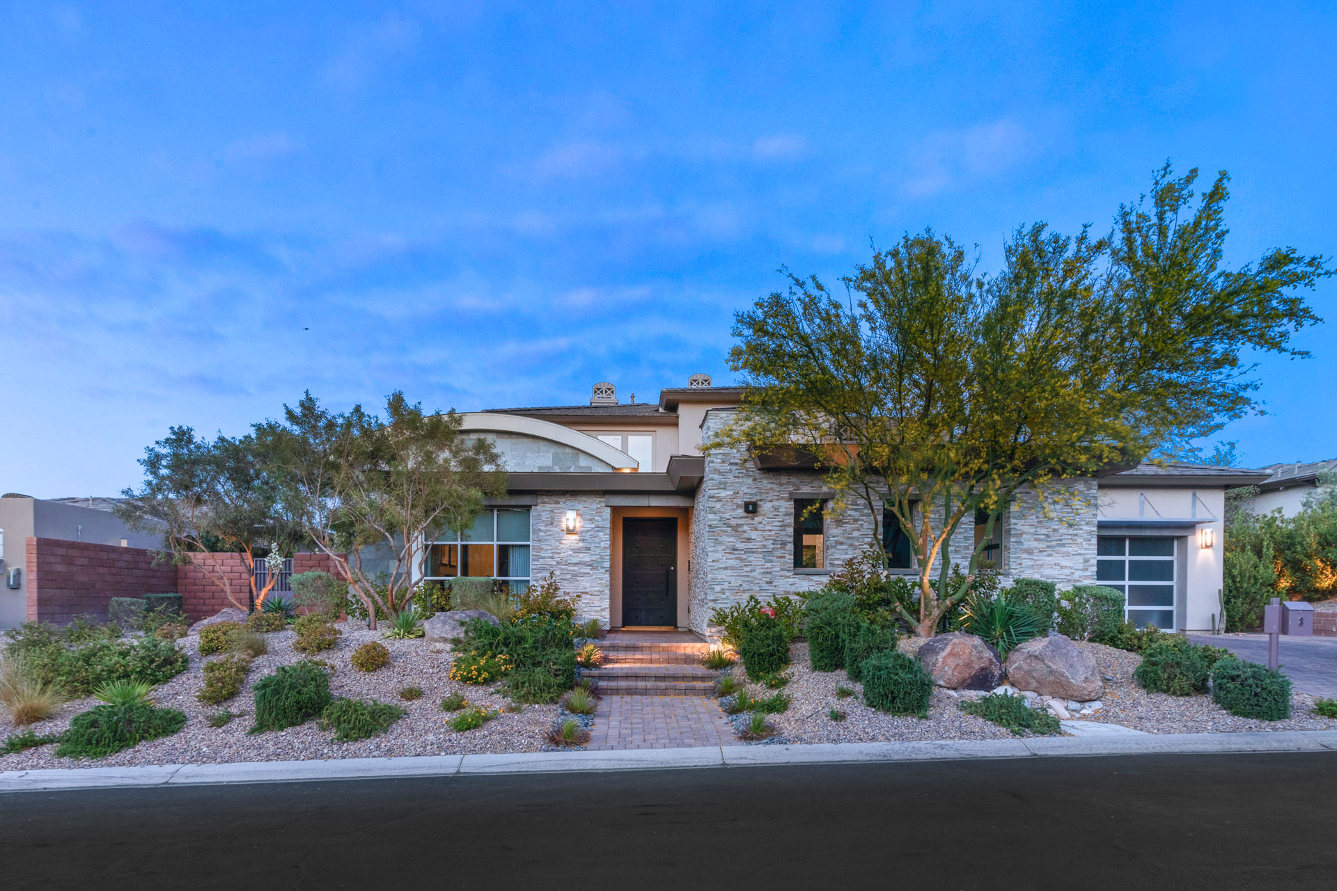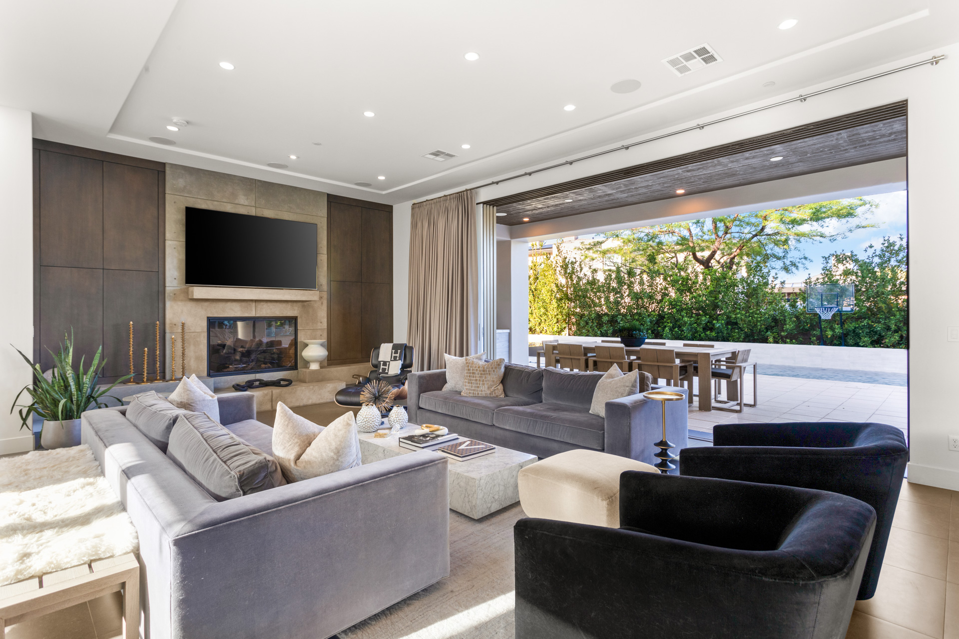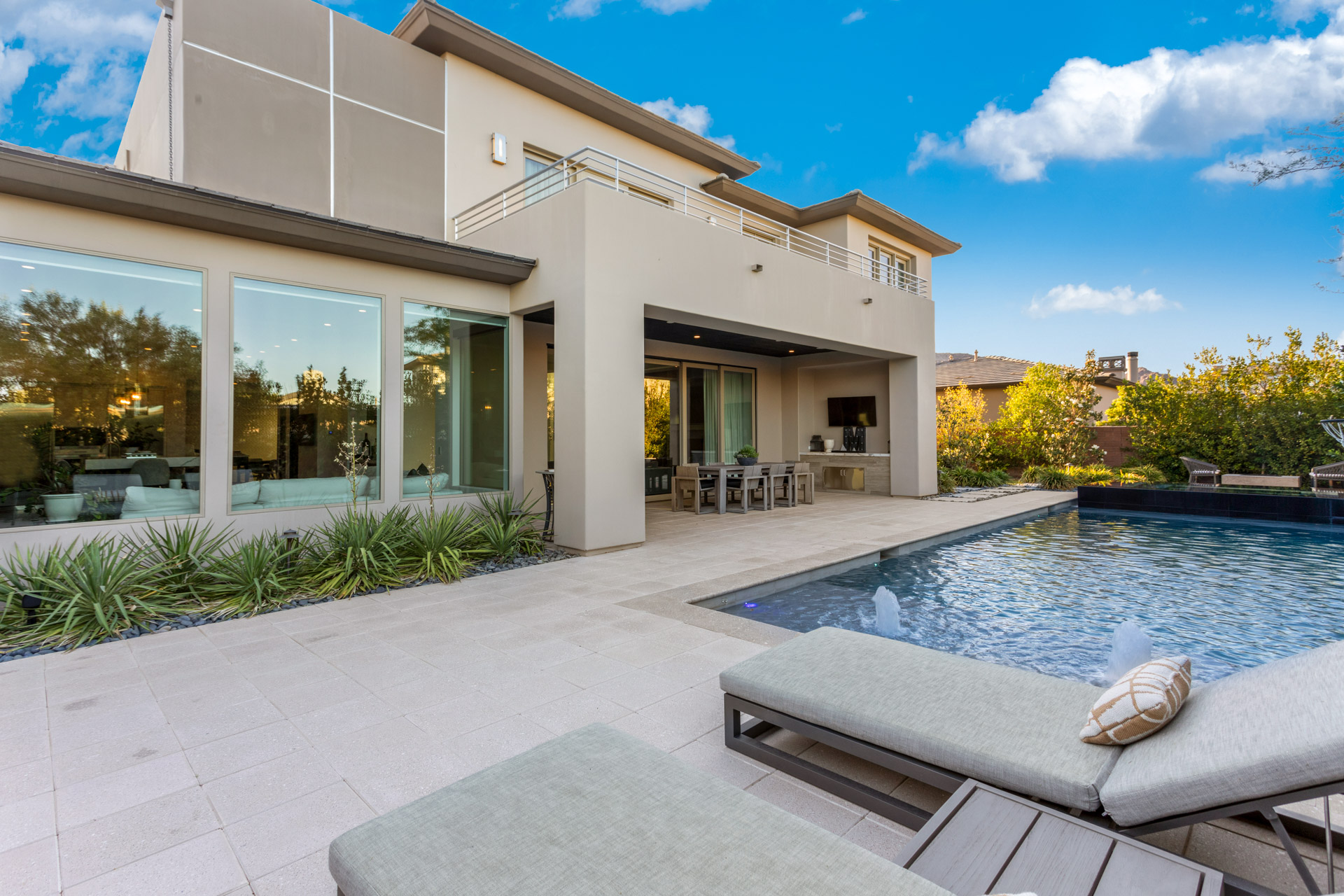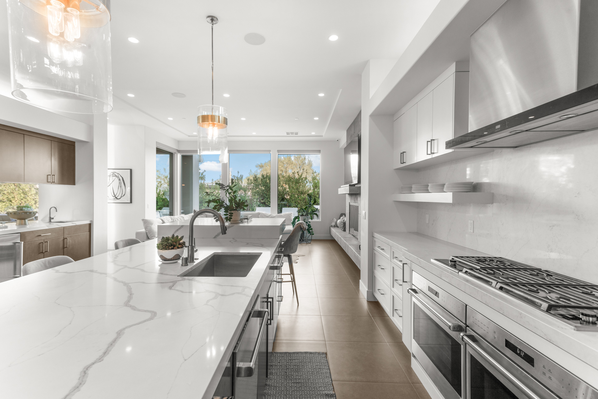 With high-end finishes throughout, the ambiance is dazzling. The living spaces open to outdoor spaces seamlessly. The primary suite includes a full office, a cozy fireplace, and expansive closet space. The primary bathroom enjoys a large soaking tub, his and hers counters, and a luxury walk-in shower. The kitchen features open shelving combined with custom cabinetry. Gas ovens and a gas stovetop make for great cooking, and the marble island is plenty large. The kitchen also features a built-in espresso machine. The modern pool and spa provide a beautiful focal point for the backyard space. An outdoor dining area, outdoor fireplace, and barbeque make for great entertainment.