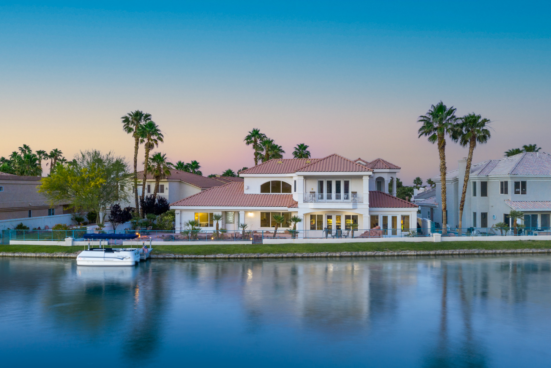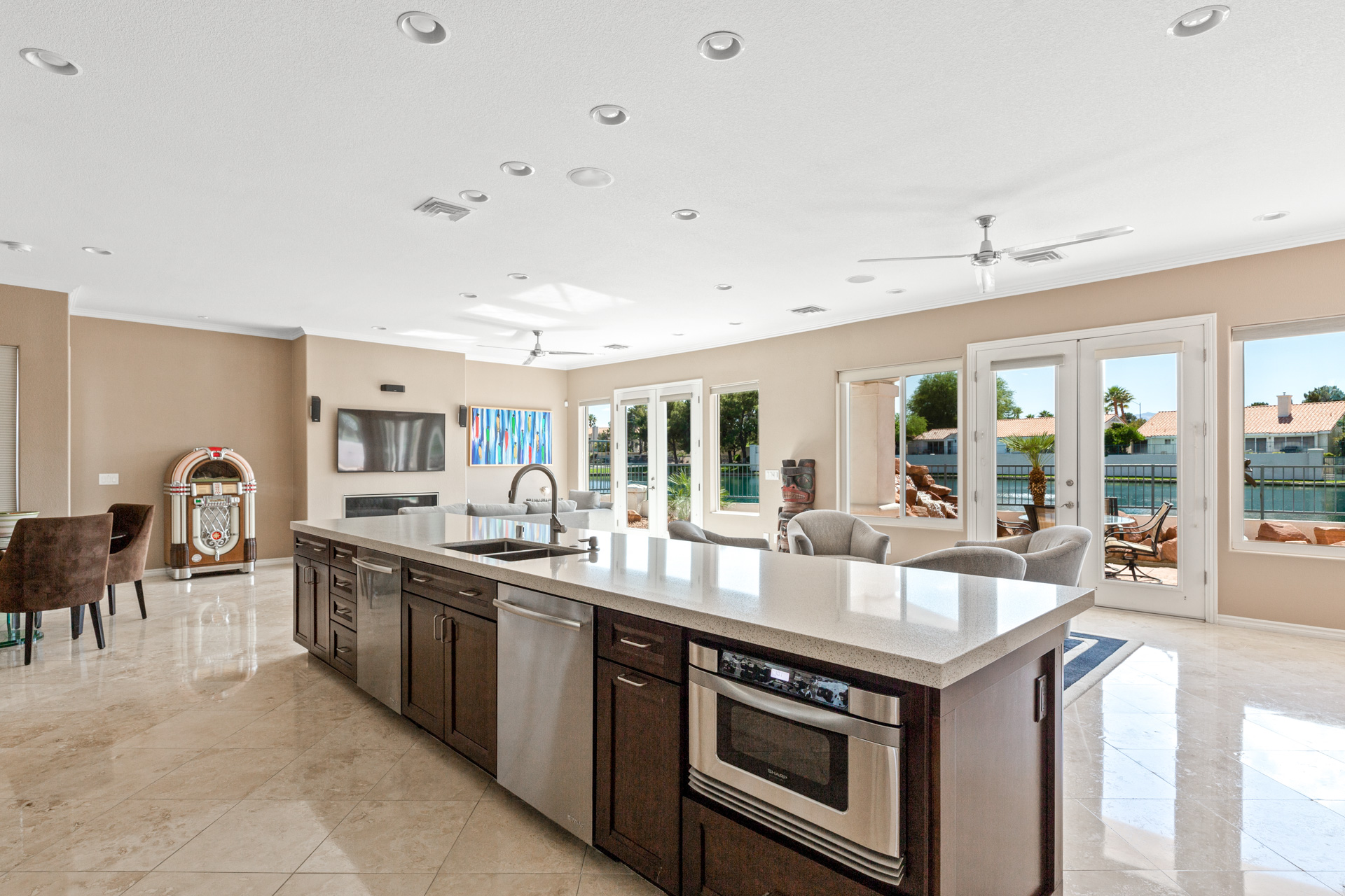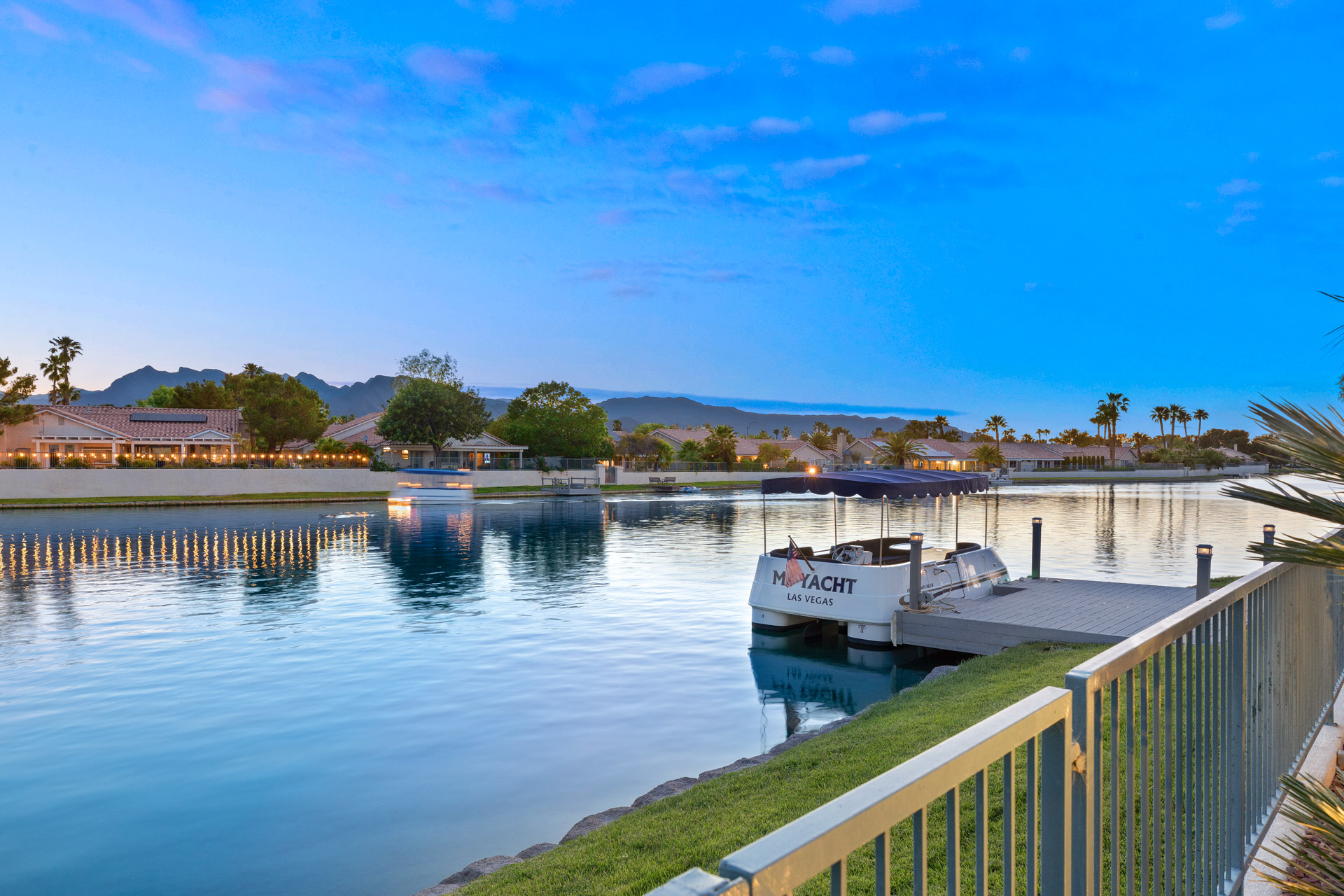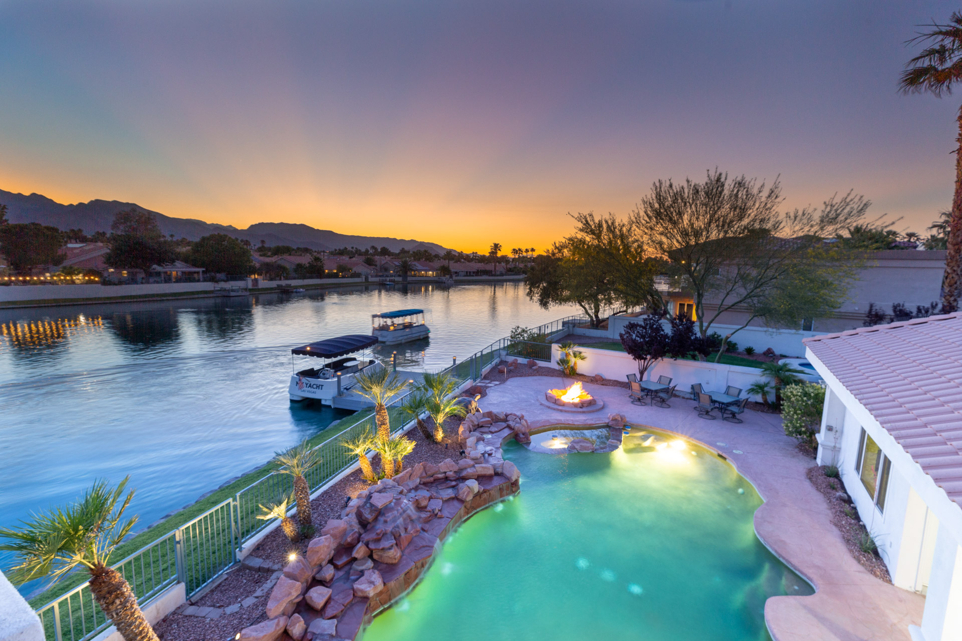 A private boat dock, great views, and a host of sought-after interior amenities, including three gas fireplaces and a dedicated office, highlight this two-story contemporary home in gated Desert Shores. With four bedrooms, three and a half baths, and a three-car garage, this home boasts a stunning backyard pool and spa, and the lake is only steps away from your personal landscaped entertainment center.