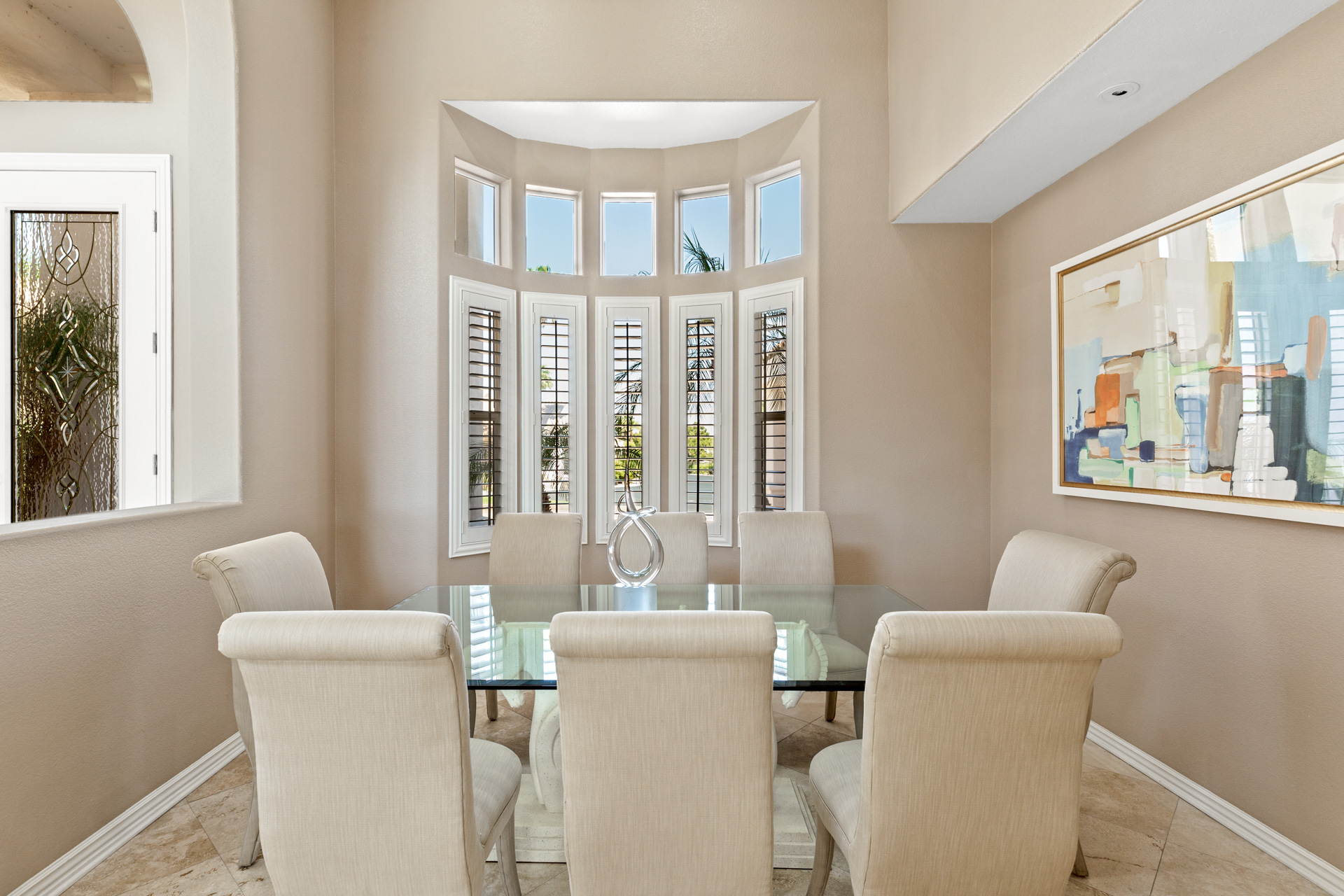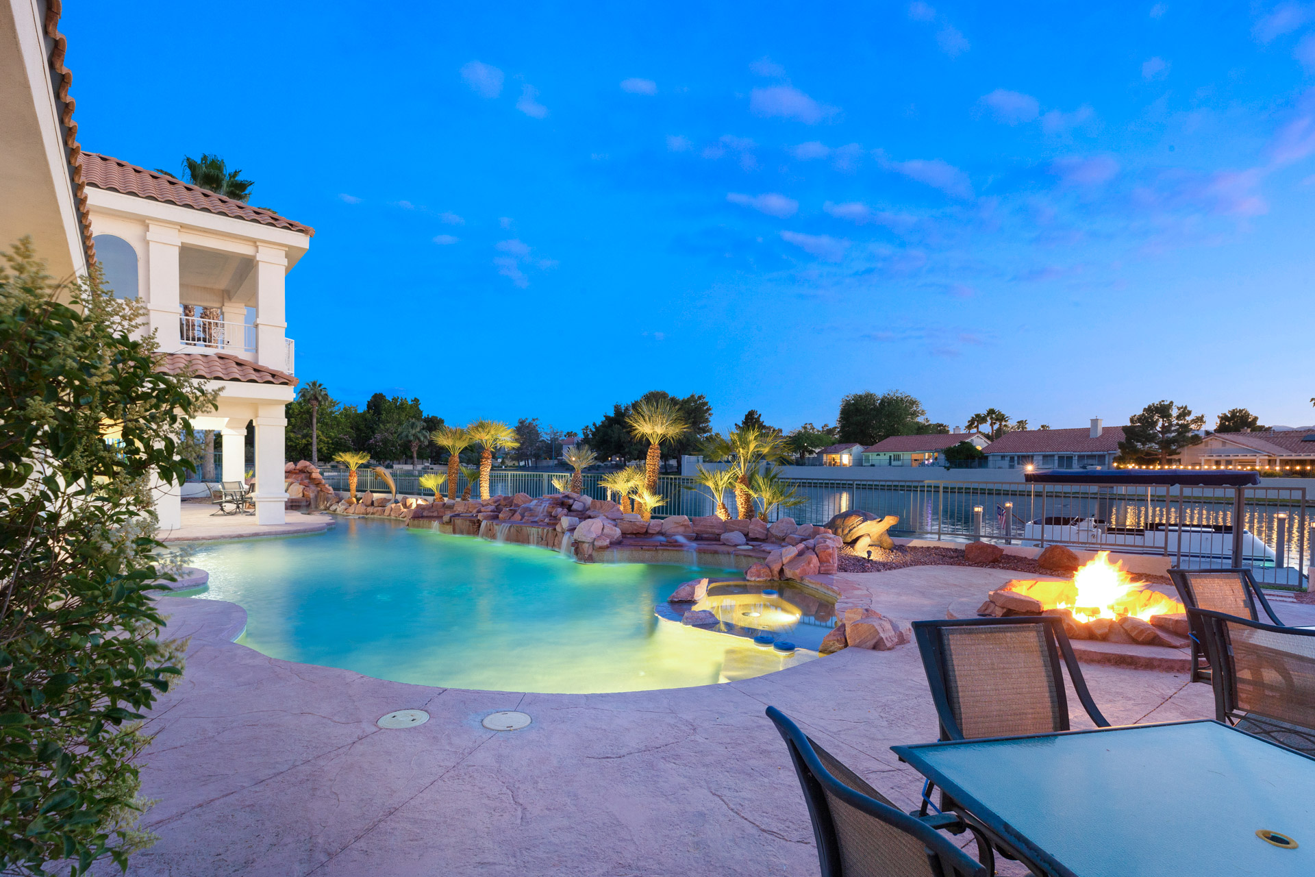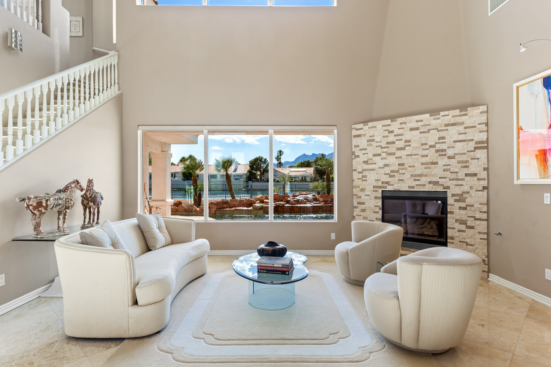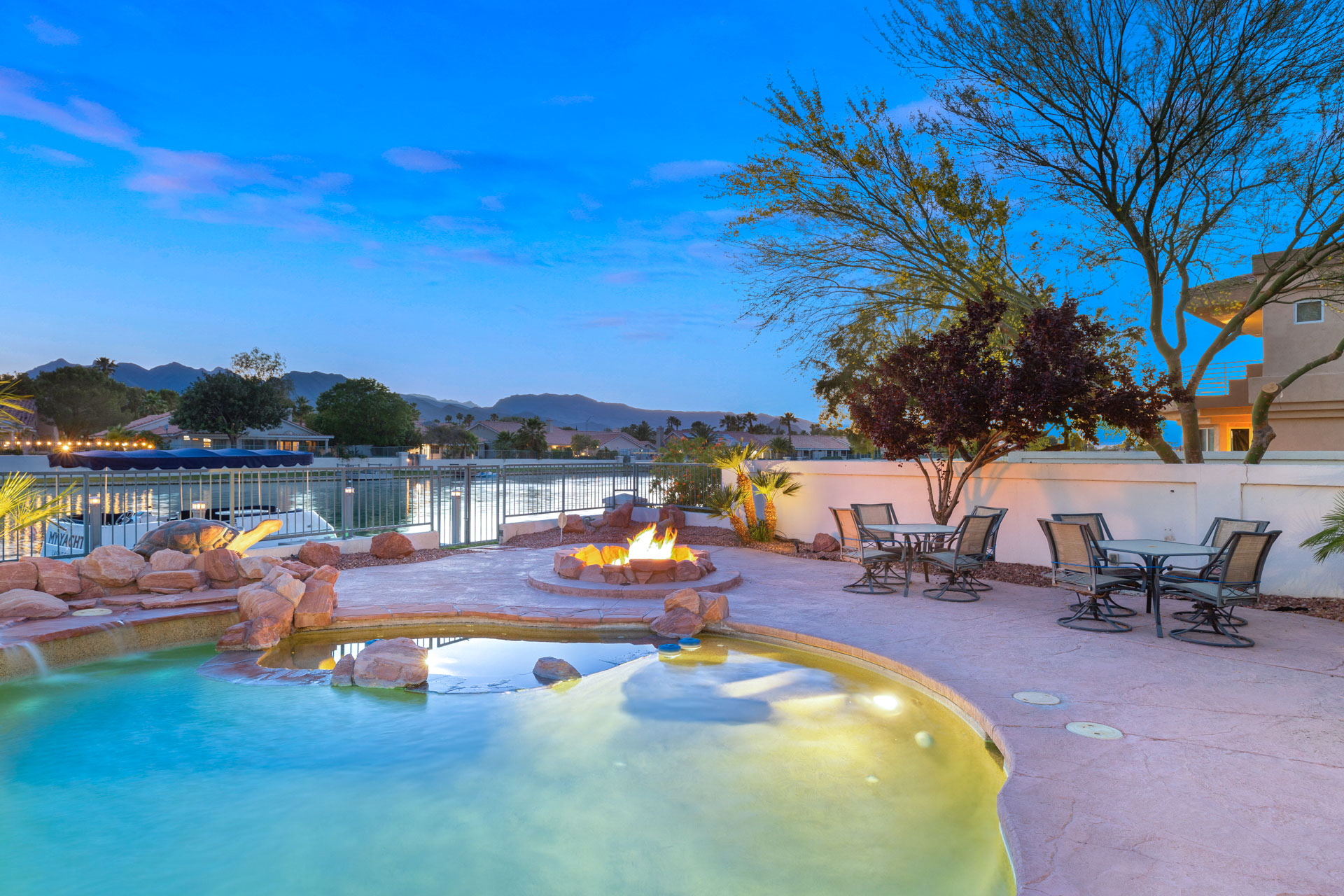 A private boat dock, great views, and a host of sought-after interior amenities, including three gas fireplaces and a dedicated office, highlight this two-story contemporary home in gated Desert Shores. With four bedrooms, three and a half baths, and a three-car garage, this home boasts a stunning backyard pool and spa, and the lake is only steps away from your personal landscaped entertainment center.