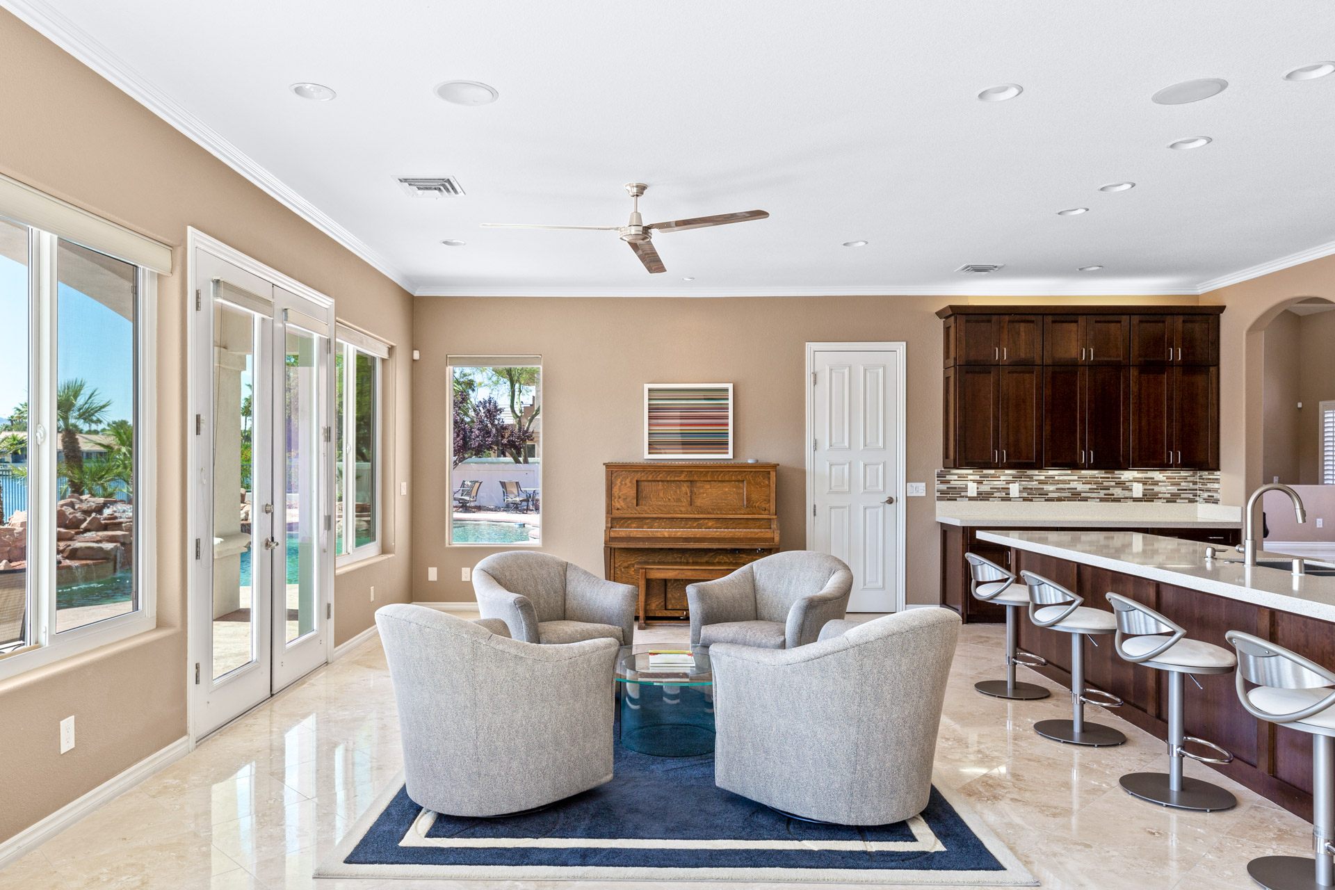 With 4,174 square feet of living space, the home includes formal living and dining rooms and a magnificent great room adjacent to the kitchen. The appealing space includes warm wood cabinets topped with crown molding that extend to the ceiling, quartz counters, and a raised serving bar that encourages lingering at comfortable stools. There is also an informal dining nook and cozy conversation area in addition to a crowd-sized family room with a modern gas fireplace and wall-hung television. Light streams through large window walls that frame views of distant mountains beyond the lake and incredible sunsets. The home's garage features epoxy flooring and custom floor-to-ceiling storage cabinets. In a community with low HOA fees, this is a remarkable find, with nearby access to walking paths, shops, and restaurants. This is a one-of-a-kind find and a distinctive lifestyle opportunity.
