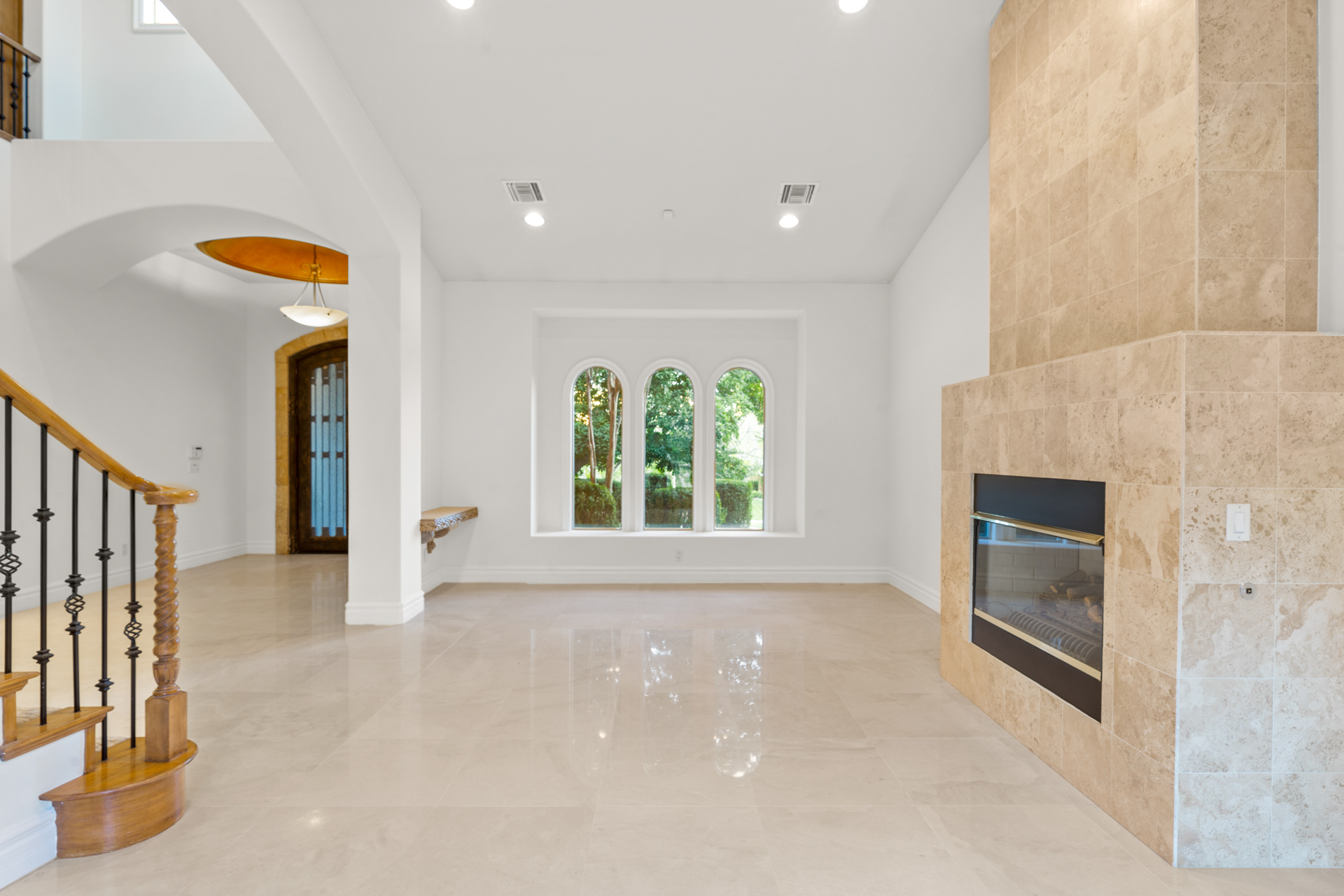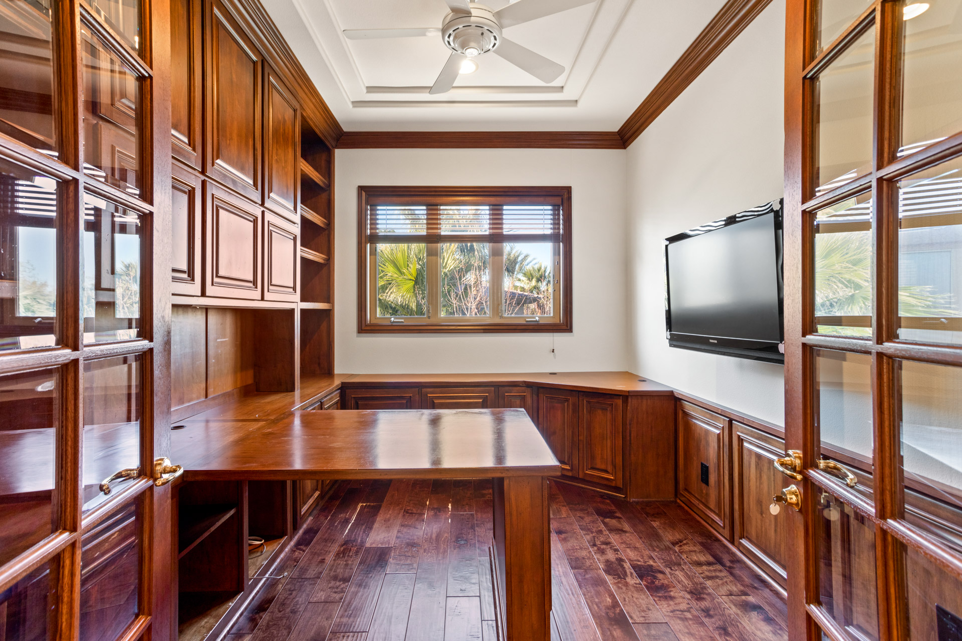 A well-appointed kitchen adorns the first floor, including a double-oven and island with gas cooktop and grill, along with spacious cabinet storage. The ownerās quarters also include a large soaking tub and walk-in spa, as well as a walk-in closet with a dressing area. The ensuite guest rooms also feature walk-in closets. Fireplaces in the family room and owner's suite add comfort, while archways throughout add architectural interest. Wall-to-wall custom cabinetry accents the family room and the second-level theater, adding unique beauty and warmth to the homeās living spaces. The executive home office also features custom cabinets and built-in desk, which complement its wood floors, adding warmth and beauty to the room. Many areas of the living space offer views of the pool area and feature abundant natural light.