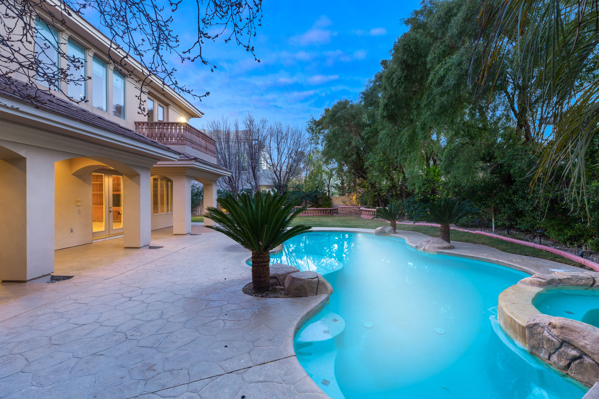 This custom home features 4 bedrooms and 5 bathrooms, with 5,209 square feet of living space, set on a 0.36-acre lot. Exquisite landscaping throughout the entirety of the property adds beauty and appeal. The two-story, stucco home features an outdoor entertainment area with an artistically designed pool and spa, as well as a full outdoor kitchen and expansive guest seating. The home also includes a three-bay garage. Inside, the home features double balconies on the upper level facing the front of the property, with the rear balcony overlooking the pool area from the ownerās suite.