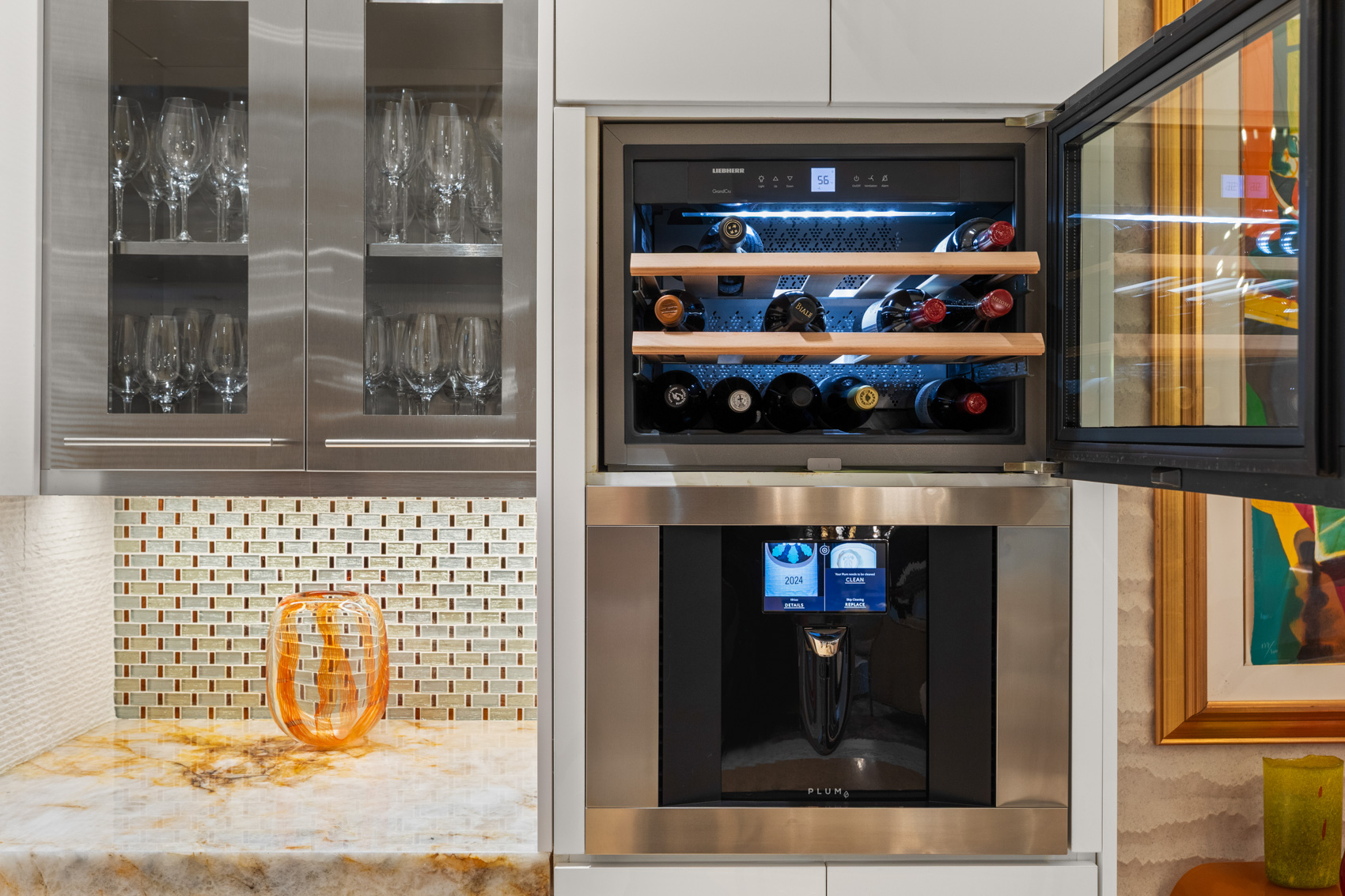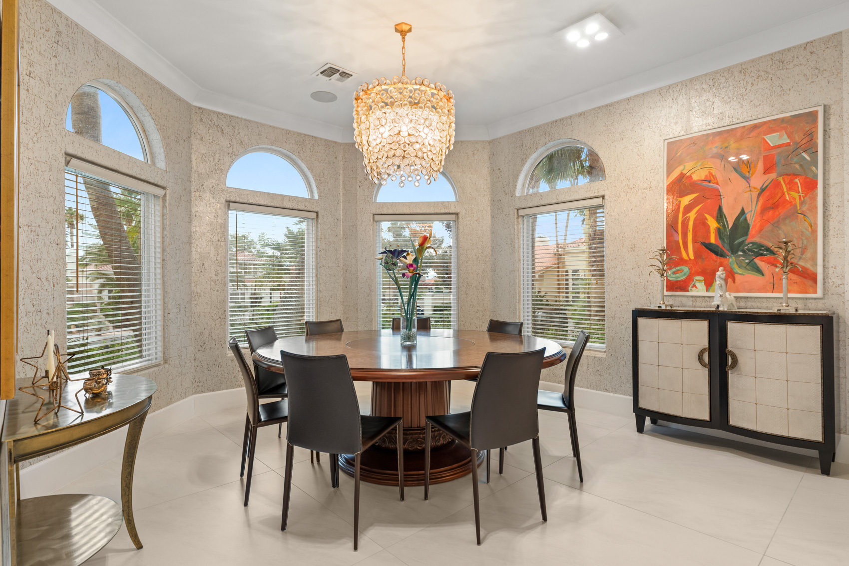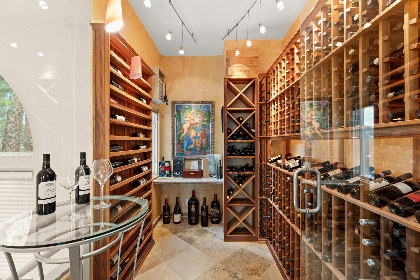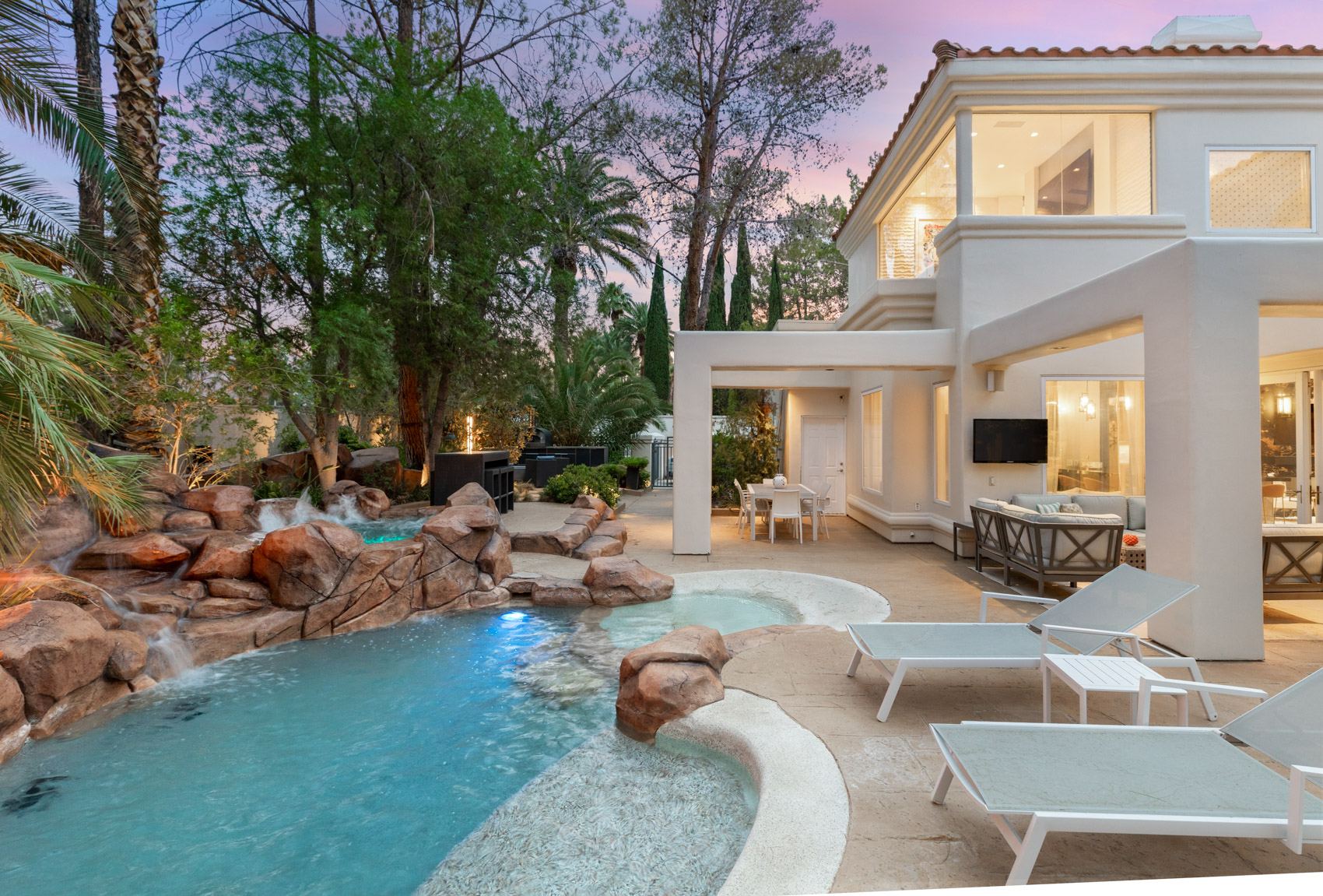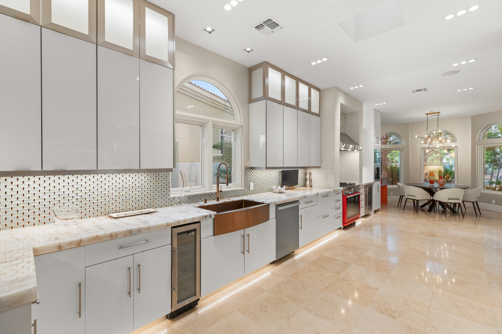 Inside, every detail has been thoughtfully reimagined with over $1 million in total upgrades. The home is fully equipped with Brilliant smart home automation, Dolby surround sound speakers, and integrated high-end tech throughoutāallowing you to control lighting, security, entertainment, and more with a simple touch. The chefās kitchen is a masterpiece of function and beauty, anchored by Cristallo quartzite countertops, chiseled stone, onyx, and Jerusalem limestone floors. Outfitted with top-tier Viking and Wolf appliancesāincluding five ovensāand a Fisher & Paykel built-in espresso system, this kitchen inspires culinary creativity on any scale. Adjacent to the kitchen, the great room offers multiple open gathering spaces, perfect for both intimate evenings and large-scale entertaining. A sleek, modern linear fireplace brings warmth to the living space, while a granite-topped wet bar adds sophistication to your hosting experience. Wine lovers will be captivated by the custom 1,200-bottle wine room, complete with five wine fridges and a state-of-the-art Plum wine dispenser that pours the perfect glass on command. Upstairs, the luxurious primary suite is a retreat within a retreat. A spacious sunroom bathed in natural light offers a serene place to relax, while the private onyx wet bar invites evening indulgence. The spa-inspired bathroom is outfitted with a frameless glass steam shower featuring a rain head and multiple body jets, as well as a freestanding soaking tubāall designed to rival any five-star hotel experience. Custom walk-in closets provide both form and function, with room for every wardrobe essential. Outside, your personal resort awaits. The lagoon-style pool and elevated spa are surrounded by tropical landscaping, creating a private oasis ideal for both relaxation and recreation. Entertain beneath the stars with your own SolĆ© pizza oven, built-in beer tap, and shaded lounge areasādesigned to accommodate both lively parties and peaceful sunset dinners. The four-car garage ensures ample storage for vehicles, recreational gear, and more, while the homeās prime location within Desert Shores offers access to private lakes, walking trails, community events, and clubhouse amenitiesābringing a lifestyle of serenity and sophistication together in one unforgettable address. Blending impeccable design, state-of-the-art technology, and luxe finishes throughout, 8109 Moonstone Circle is a one-of-a-kind residence built for those who appreciate the finer thingsāand know how to live well.