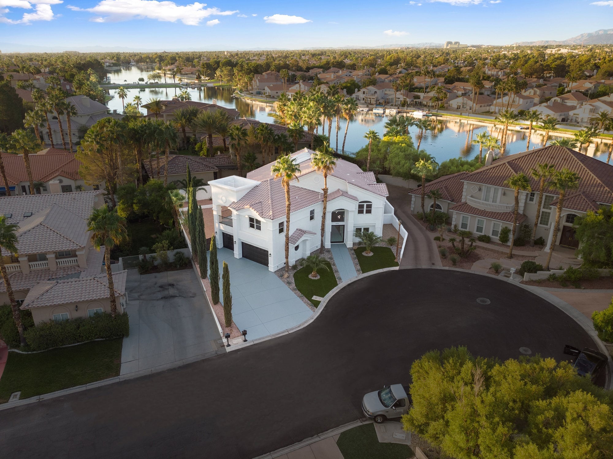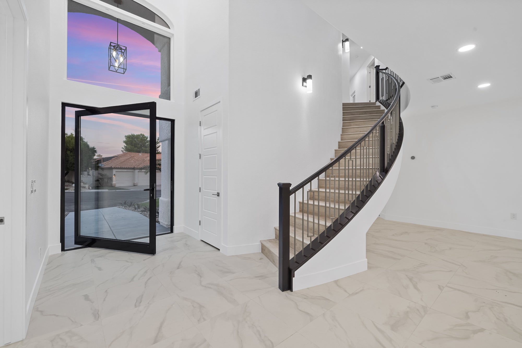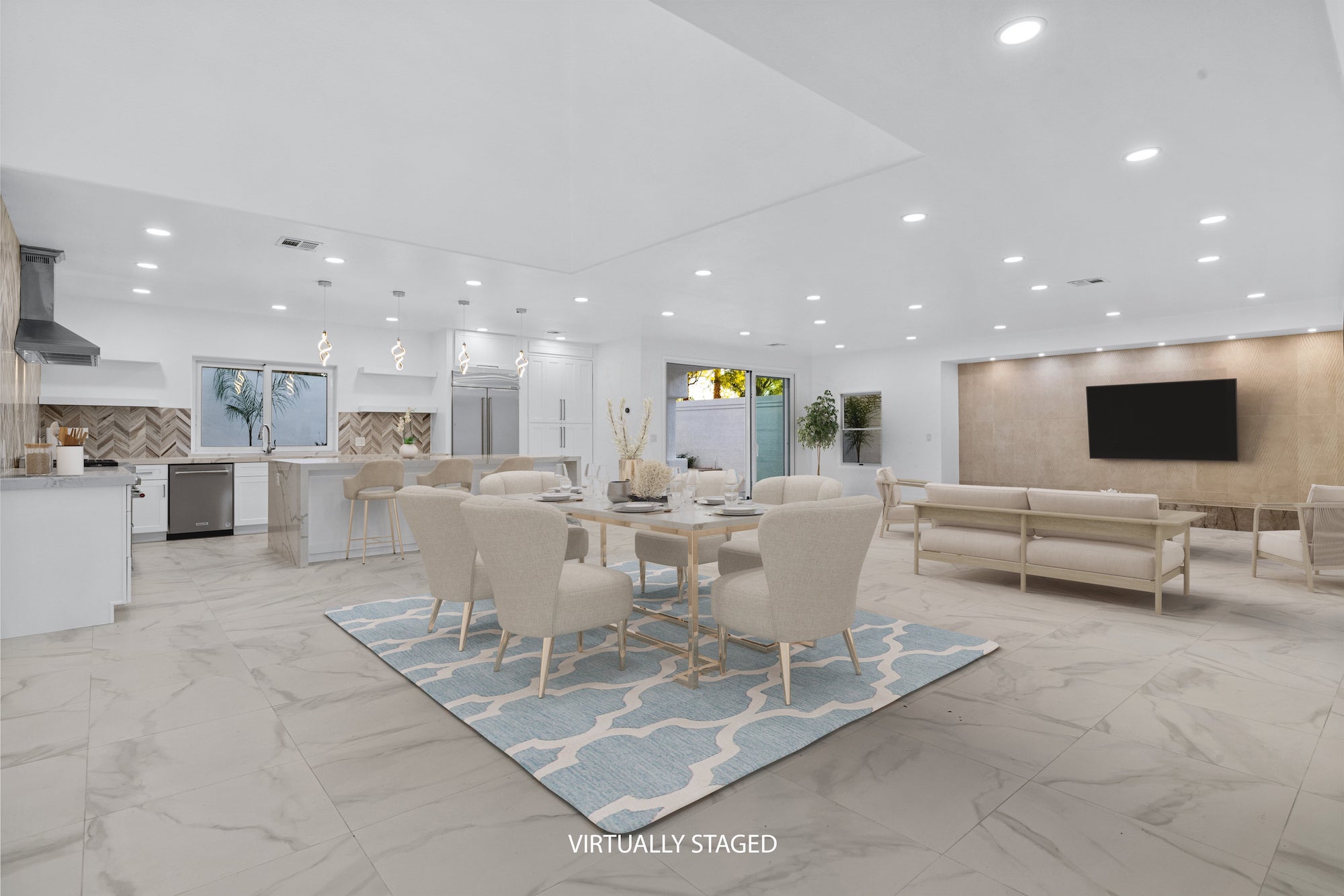 Sitting near the tranquil lakes of Desert Shores, this newly remodeled home in Diamond Bay is an absolute dream. The entry, highlighted by a large glass pivot door, impresses with vaulted ceilings, grand windows, skylights and an open floor plan. The kitchen features a waterfall edge, quartz island countertop, brand new appliances, & a stunning tile backsplash.