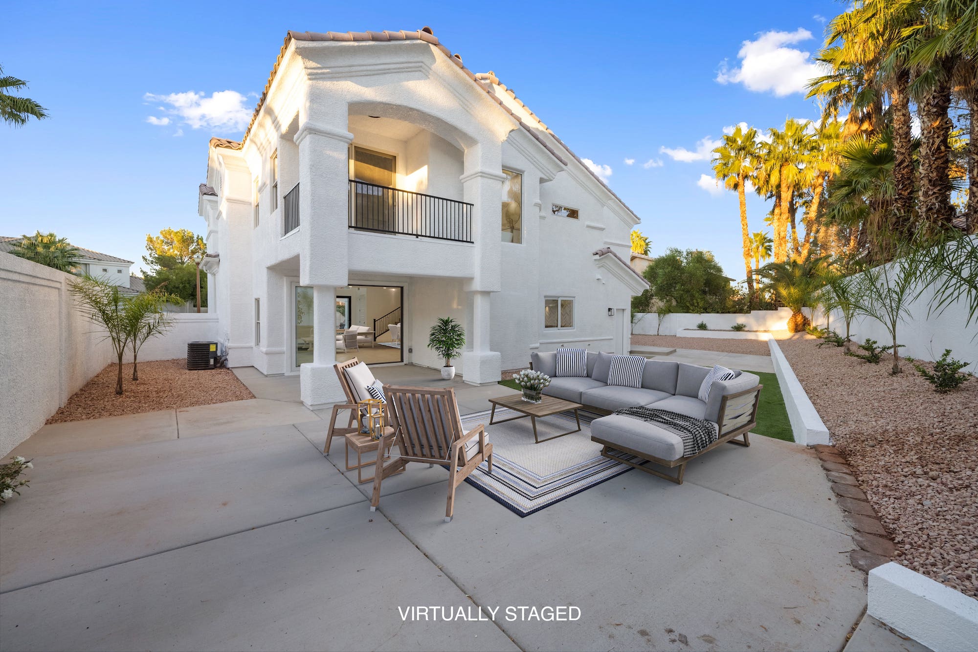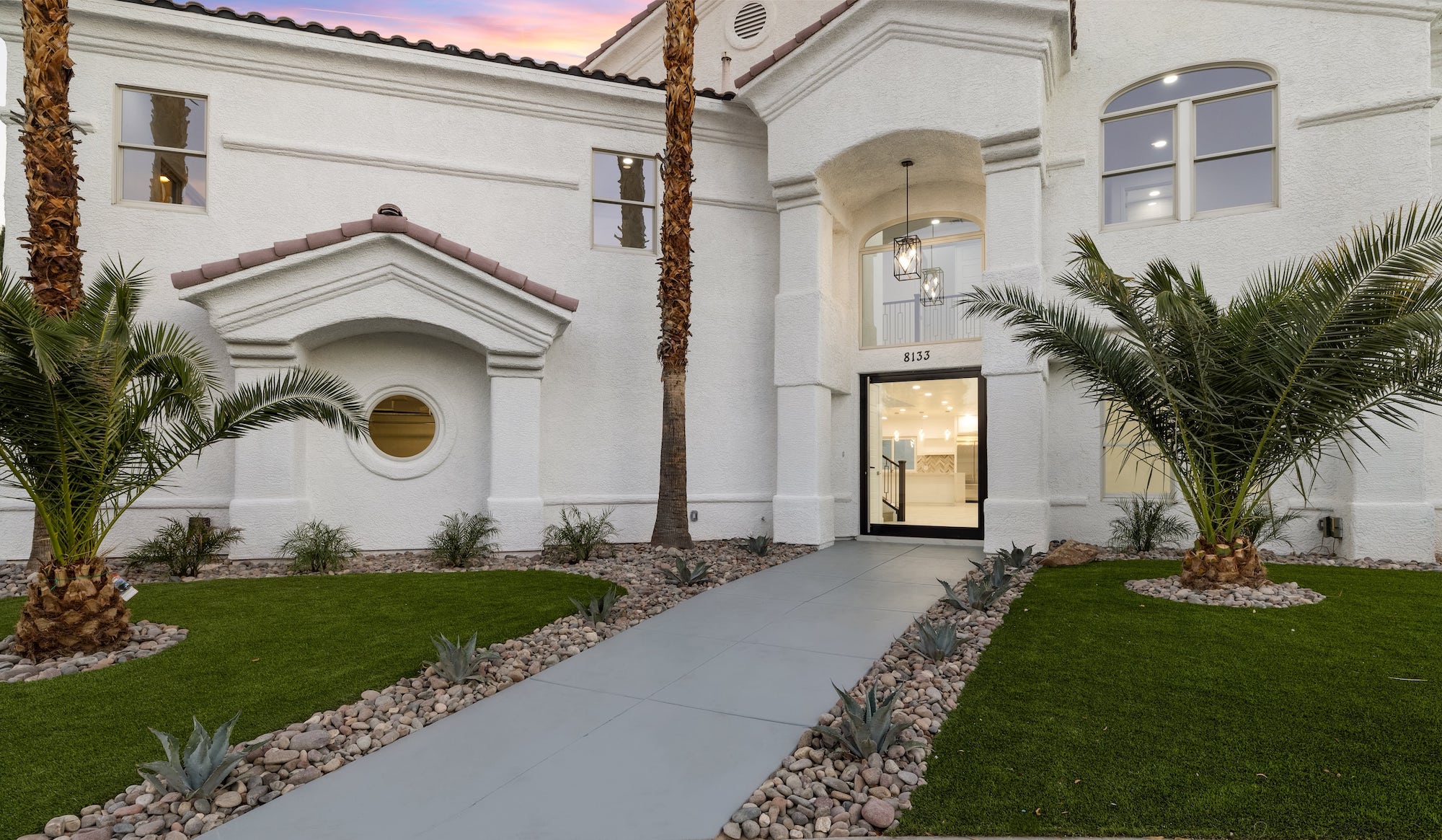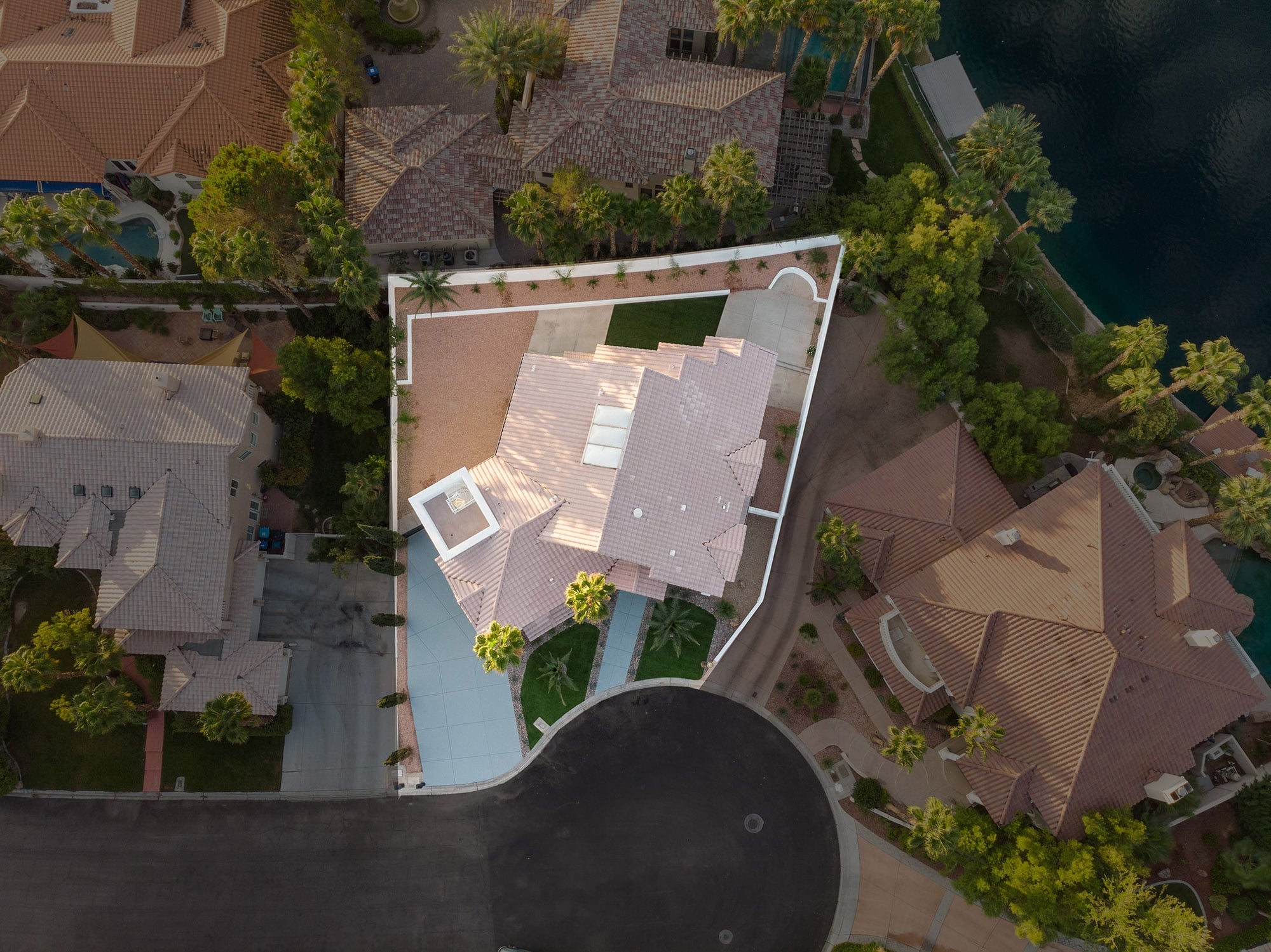 Sitting near the tranquil lakes of Desert Shores, this newly remodeled home in Diamond Bay is an absolute dream. The entry, highlighted by a large glass pivot door, impresses with vaulted ceilings, grand windows, skylights and an open floor plan. The kitchen features a waterfall edge, quartz island countertop, brand new appliances, & a stunning tile backsplash.