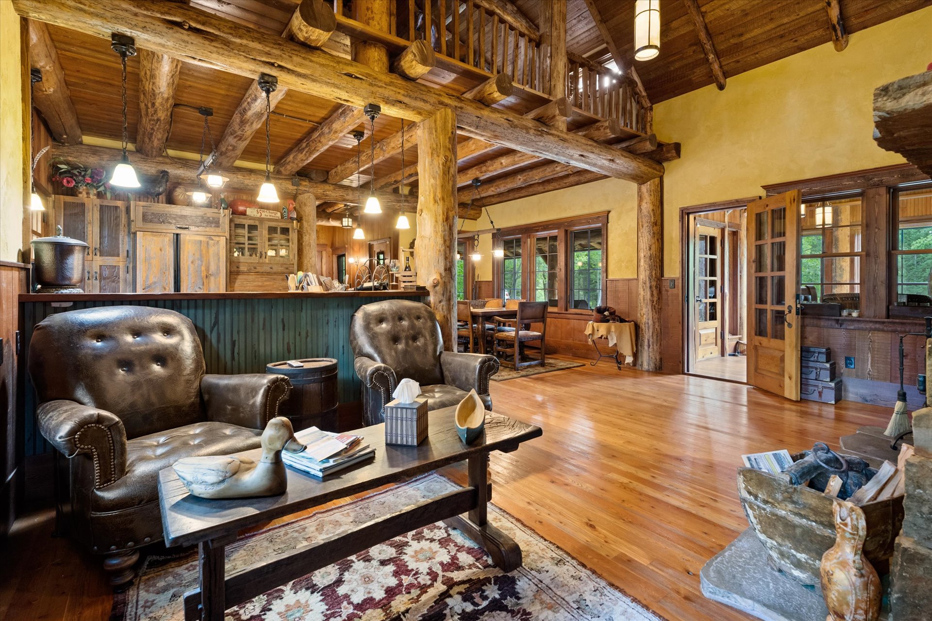 Six thoughtfully designed structures grace the property. The main residence exudes rustic elegance, featuring handcrafted details throughout. Additional structures include a guest house, carriage house, bunk house, gazebo, and barn. There is also a par 3 golf corse (6 tee boxes).