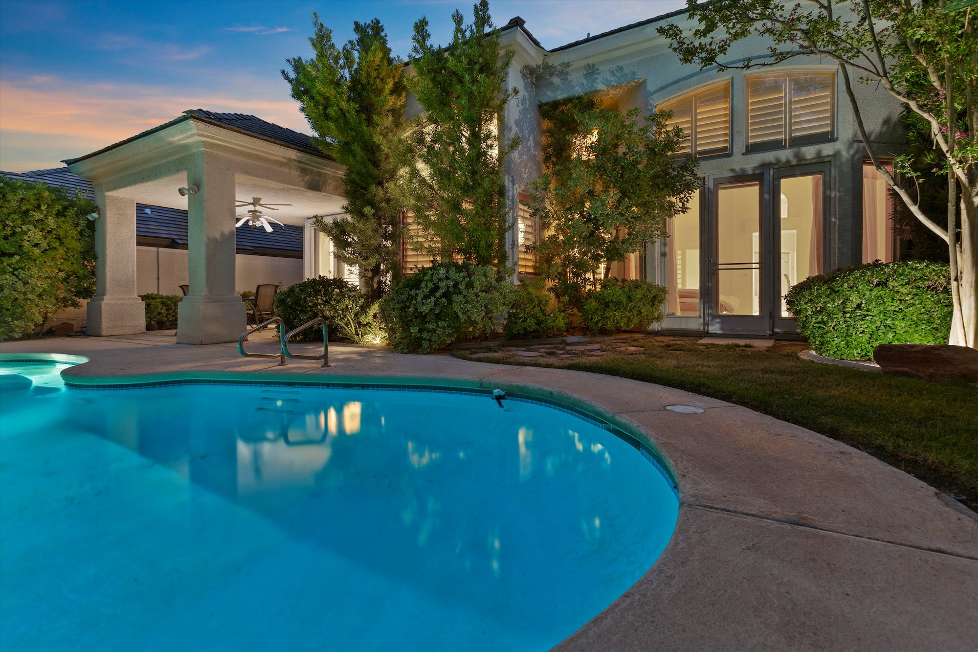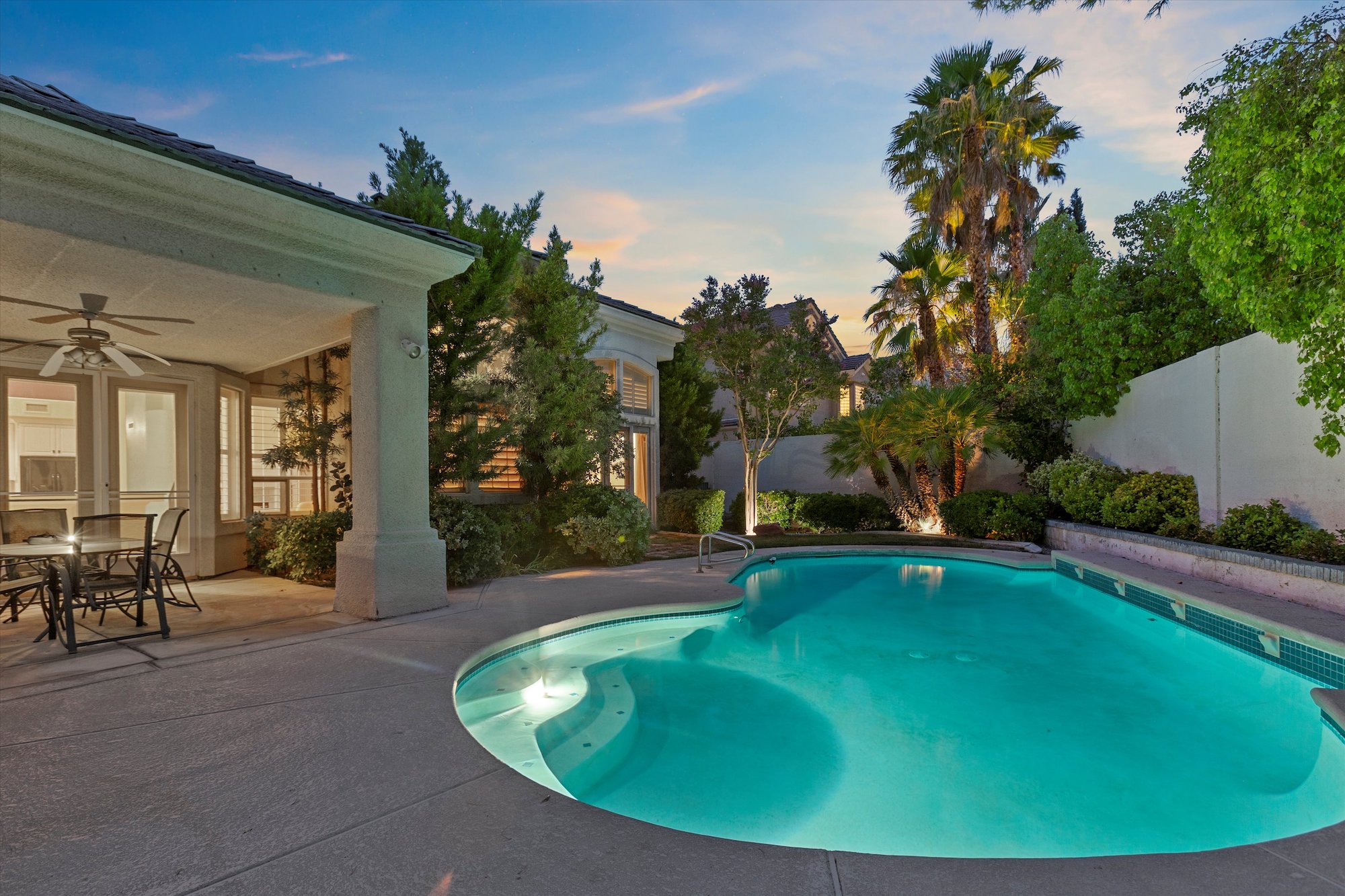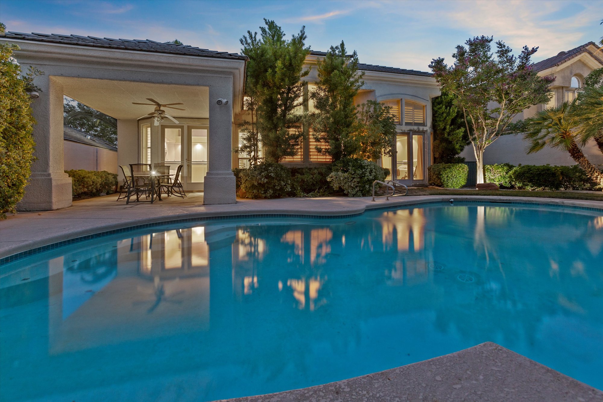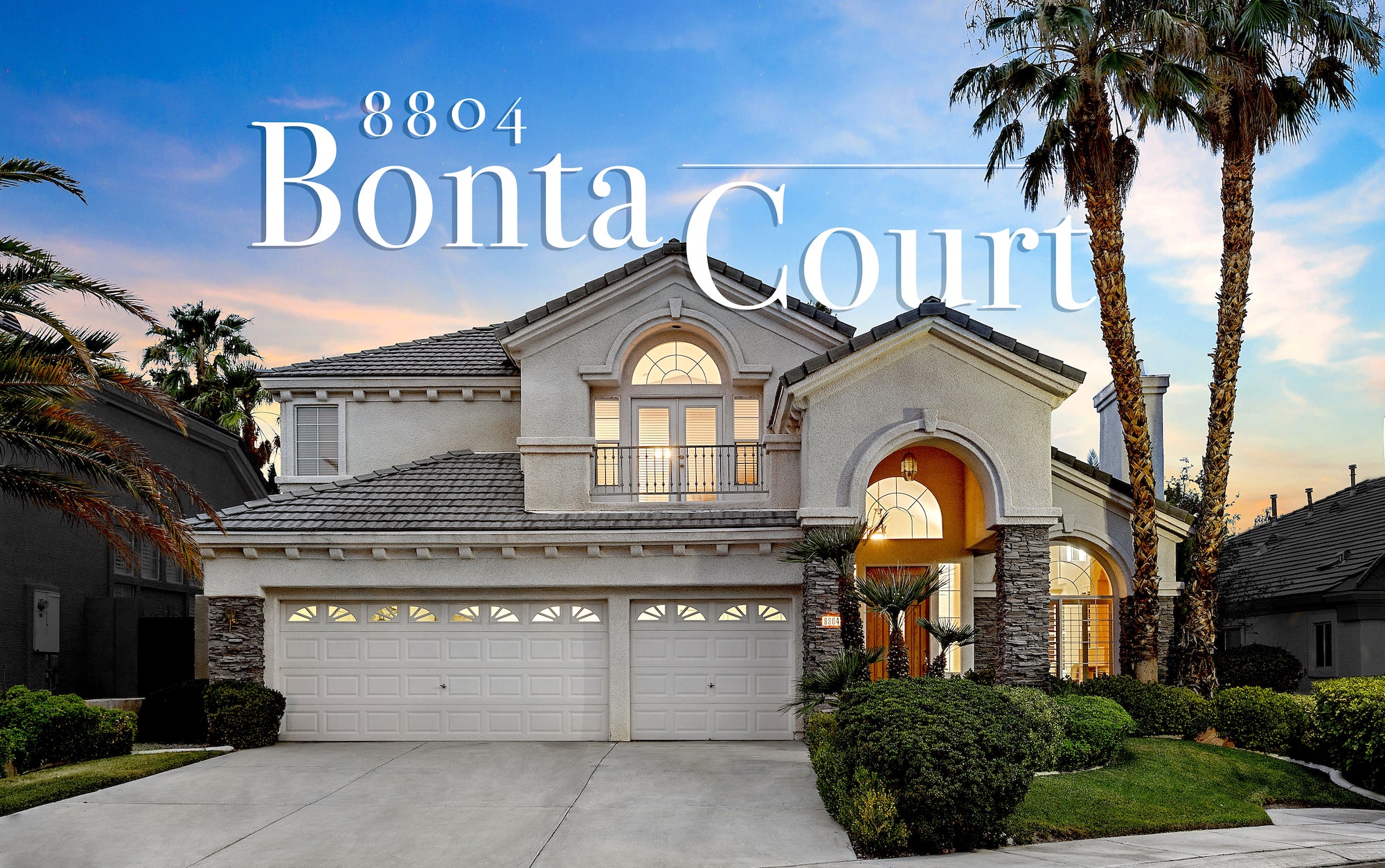 Classic architecture with stacked stone columns and arch-top windows and doors characterizes this well-priced home in the guard-gated Corta Bella community of Summerlin. With three bedrooms, four baths, a three-car garage, three fireplaces and a unique wet bar, the home features a main-level master suite that opens directly to the backyard pool and patio.