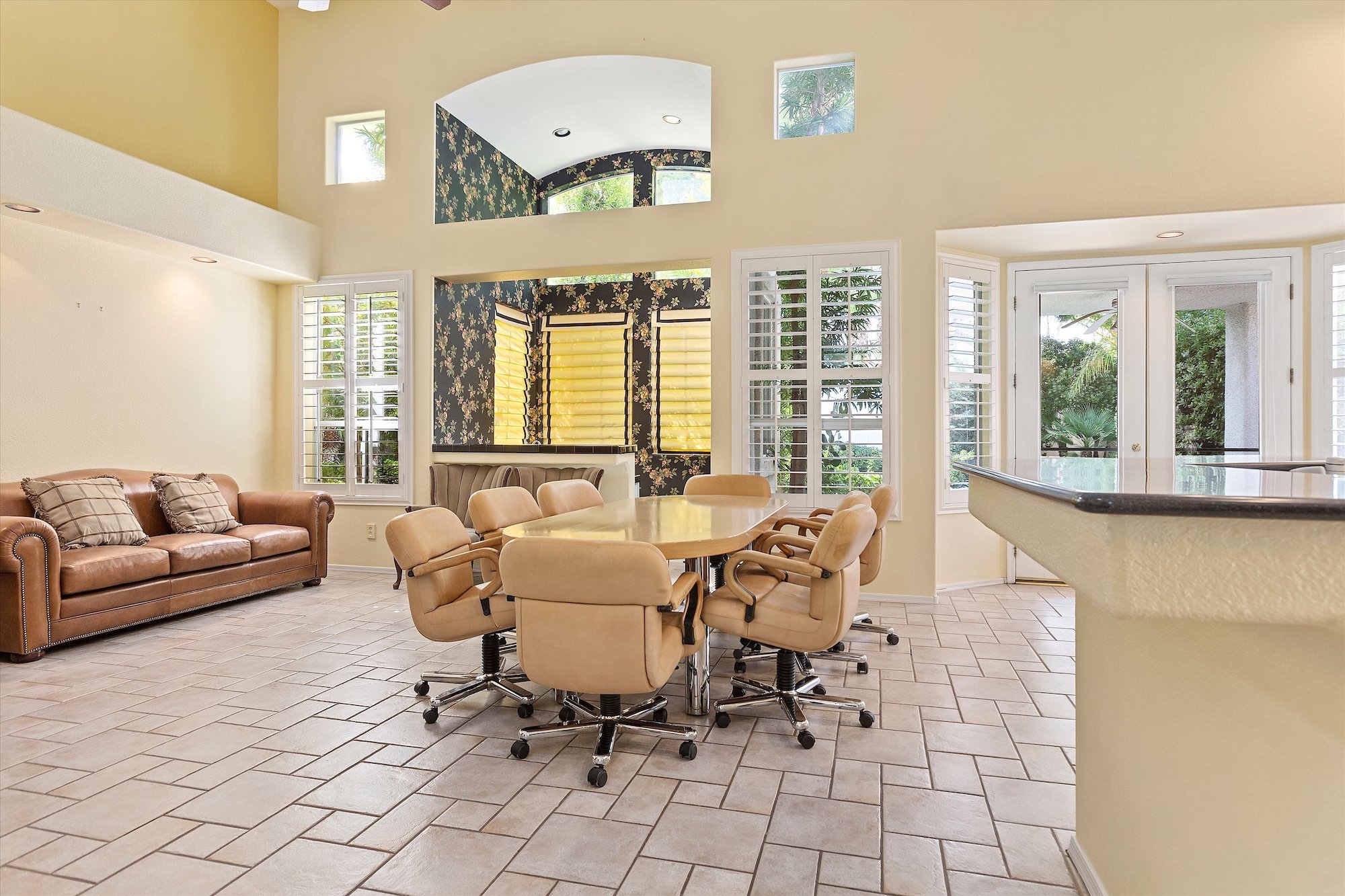 Soaring ceiling lines and abundant light are features of the main level formal living/dining space, as well as the kitchen/great room at the rear of the home. The great room features a partial wall of cabinets to accommodate audio/visual equipment adjacent to a corner fireplace. The adjacent kitchen work space, with dark solid-surface counters that contrast with white-painted cabinetry, has an island with a wraparound raised bar, perfect for quick meals or for serving a buffet, and a built-in planning desk. A windowed wet bar is also situated in this welcoming space, making it convenient for serving both indoor and outdoor guests. French doors lead to the spacious covered patio and free-form inground swimming pool. Originally constructed in 1995, this home is an example of timeless quality, and only awaits its new owners.