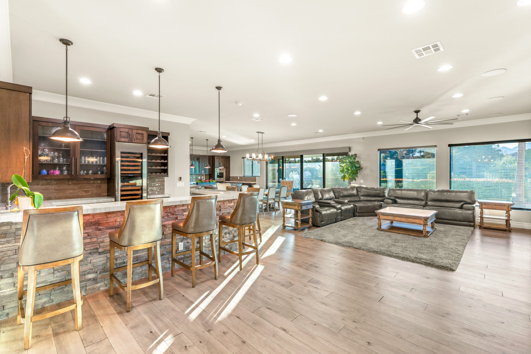 Upon arrival, the home makes a statement with its large pivoting front door, a prelude to the refined architectural and design elements that define its interior. Inside, an open-plan living space, adorned with rustic wood floors, seamlessly connects the living, dining, and kitchen areas, creating an environment designed for flow, functionality, and entertainment.