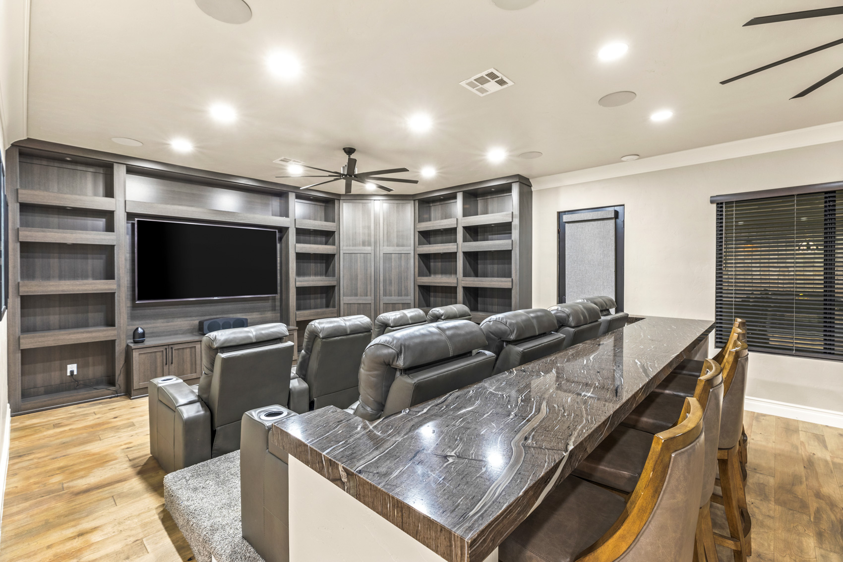 The heart of this home is the chefās kitchen, a marvel of modern design equipped with stainless steel upgraded appliances and flanked by a separate prep kitchen, ensuring that hosting gatherings is executed with ease and elegance. This home features four generously sized bedrooms, each with its own full bathroom, ensuring privacy and comfort for family and guests alike. Adding to its allure, the primary suite boasts not one, but two luxurious bathrooms, alongside dual walk-in closets with floor-to-ceiling built-ins, epitomizing the homeās dedication to comfort and convenience. The fully finished basement is an entertainment haven, complete with a game room, theater, and bar, all designed for enjoyment and leisure. Step outside to the expansive covered patio, and you're greeted with awe-inspiring views of the 17th green. This outdoor sanctuary is perfected with an upgraded built-in BBQ, griddle, and pizza oven, alongside a pool and spa, setting the stage for unforgettable alfresco dining and leisure. With a total of five bathrooms, this home is meticulously designed to accommodate and impress. The inclusion of a four-car garage underscores the property's blend of luxury and practicality, catering to the automotive enthusiast and providing ample storage. Living within Canyon Gate Country Club is an experience marked by luxury, privacy, and exclusivity. Double-gated security ensures peace of mind, while access to the communityās golf course, tennis courts, and clubhouse invites an active and social lifestyle. This is a community where leisure meets luxury, set against the backdrop of breathtaking landscapes and a vibrant social scene. The recent remodeling elevates this property, making it a unique opportunity to own a home that has been thoughtfully updated to enhance every aspect of the living experience. From the bespoke built-ins and luxurious finishes to the functional layout designed for entertaining, no detail has been overlooked in creating a home that is both elegant and comfortable. This property is not just a house; itās a lifestyle offering that combines the tranquility of golf course views, the comfort of expansive living spaces, and the security of a double-gated community. It represents a rare chance to enjoy a life of luxury, privacy, and comfort within the supportive and vibrant environment of Canyon Gate Country Club. Whether youāre drawn to the exquisite detailing, the entertainment possibilities, or the prestigious location, this home promises a quality of life that is truly exceptional.