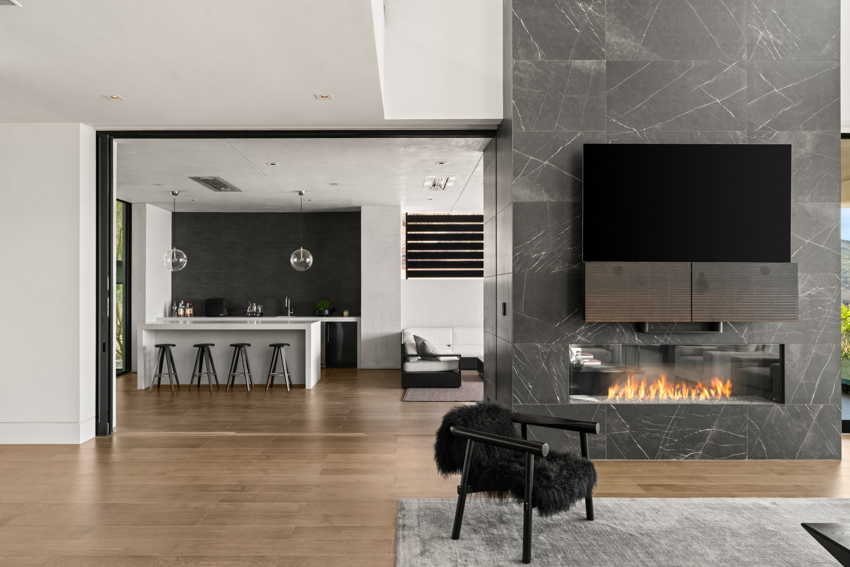 From the moment you arrive, the architectural elegance and intentional design are evident. A dramatic front courtyard welcomes you with tranquil water features that set the tone for the serene and organic materials found throughout the property. Clean modern lines are softened by a curated mix of natural stone and warm wood accents, creating an inviting aesthetic that complements the surrounding desert landscape.