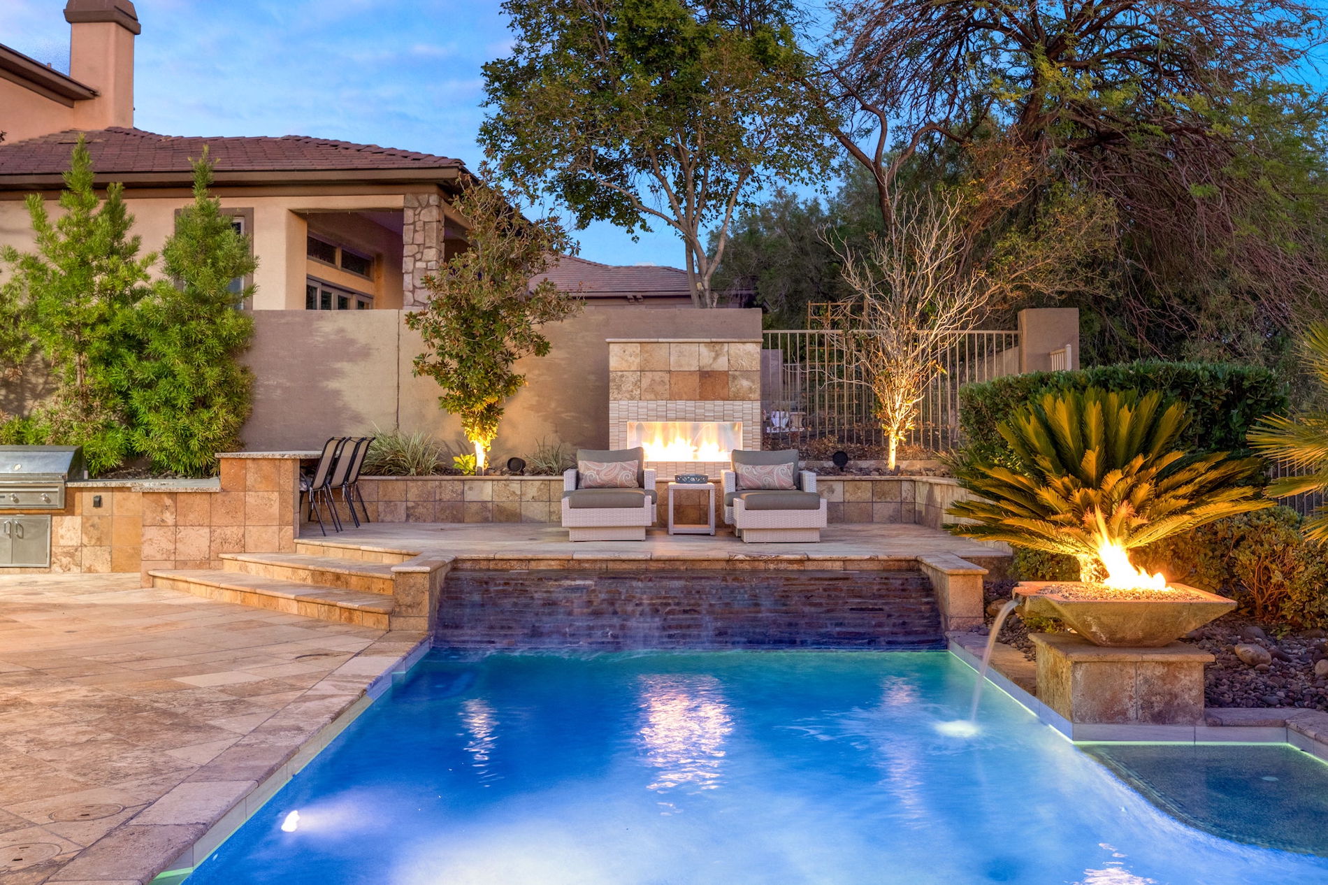 Step onto the gorgeous limestone flooring, and you'll find an open floor plan that creates a bright and inviting atmosphere. The chef's paradise kitchen is a dream come true with top-of-the-line Thermador appliances, a Subzero fridge, dual dishwashers, and even an espresso station in the butler's pantry. The sleek quartz island and countertops beautifully complement the dark custom cabinetry, giving you both style and functionality. The family room is a cozy haven with a stunning 74ā linear fireplace on a designer entertainment wall. The living room/bar area is perfect for hosting unforgettable gatherings, featuring a wine wall holding 800 bottles, a cigar humidifier, luxurious leathered granite, leather accent wallpaper, and rich wood beams on the ceiling. An artistic touch is added by the soothing waterfall feature, making every evening special. Get ready for an incredible entertainment experience in the theater room, boasting a grand 140ā screen and state-of-the-art B&W speakers for the ultimate cinematic bliss at home. The primary suite on the main level is a lavish retreat designed for comfort and indulgence. With a custom headboard, floating nightstands, and French doors leading to an outdoor spa, it's a perfect place for relaxation. The ensuite bathroom is a luxurious sanctuary with designer porcelain tiles and a steam shower that pampers you with delightful aromatherapy scents. Upstairs, you'll find three more bedrooms and a spacious loft, providing privacy from the primary suite. The fourth bedroom on the ground floor is currently being used as a stunning executive office with beautiful built-in features. The backyard is a true oasis, overlooking the 9th-10th fairways and majestic Red Rock mountains. Enjoy the sun-drenched pebble tech pool and spa, multiple fire features, Bocce ball court, and a putting greenāa golfer's paradise right at home. The outdoor BBQ kitchen is perfect for culinary enthusiasts to create delicious feasts under the open sky. Living in Anthem Country Club means you'll have access to world-class amenities, including a championship golf course, tennis courts, and a magnificent clubhouse and restaurants for grand social gatherings and cherished memories. Surrounded by stunning views and lush landscapes, this is a lifestyle beyond compare. Don't miss the chance to make 9 Clear Crossing Trail your own elegant, updated, and unique home that offers a truly distinctive living experience in a prestigious country club community!