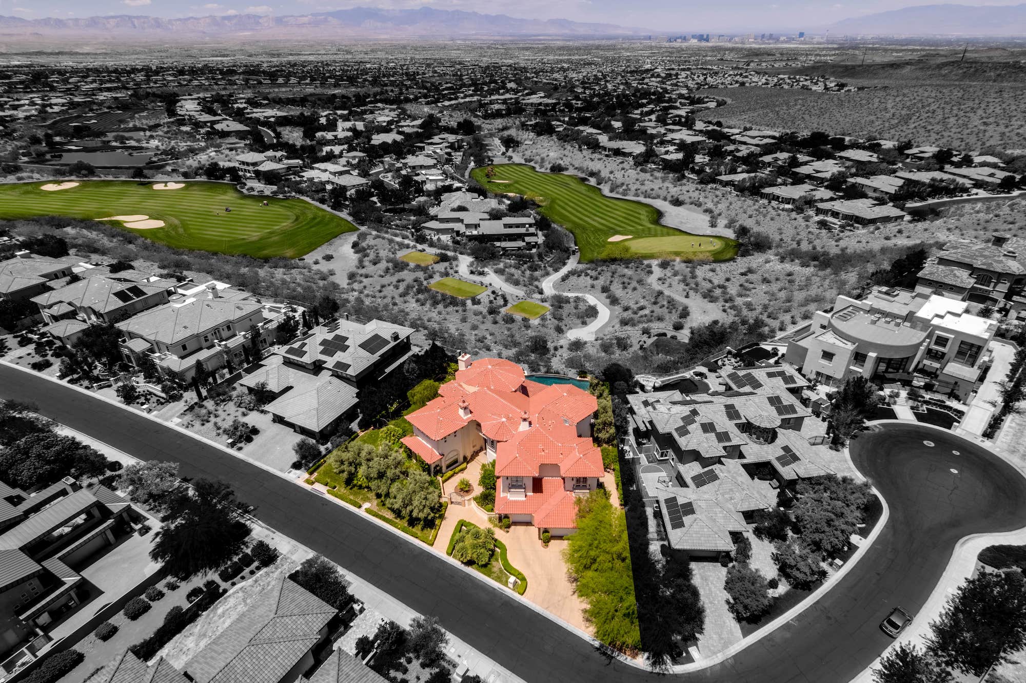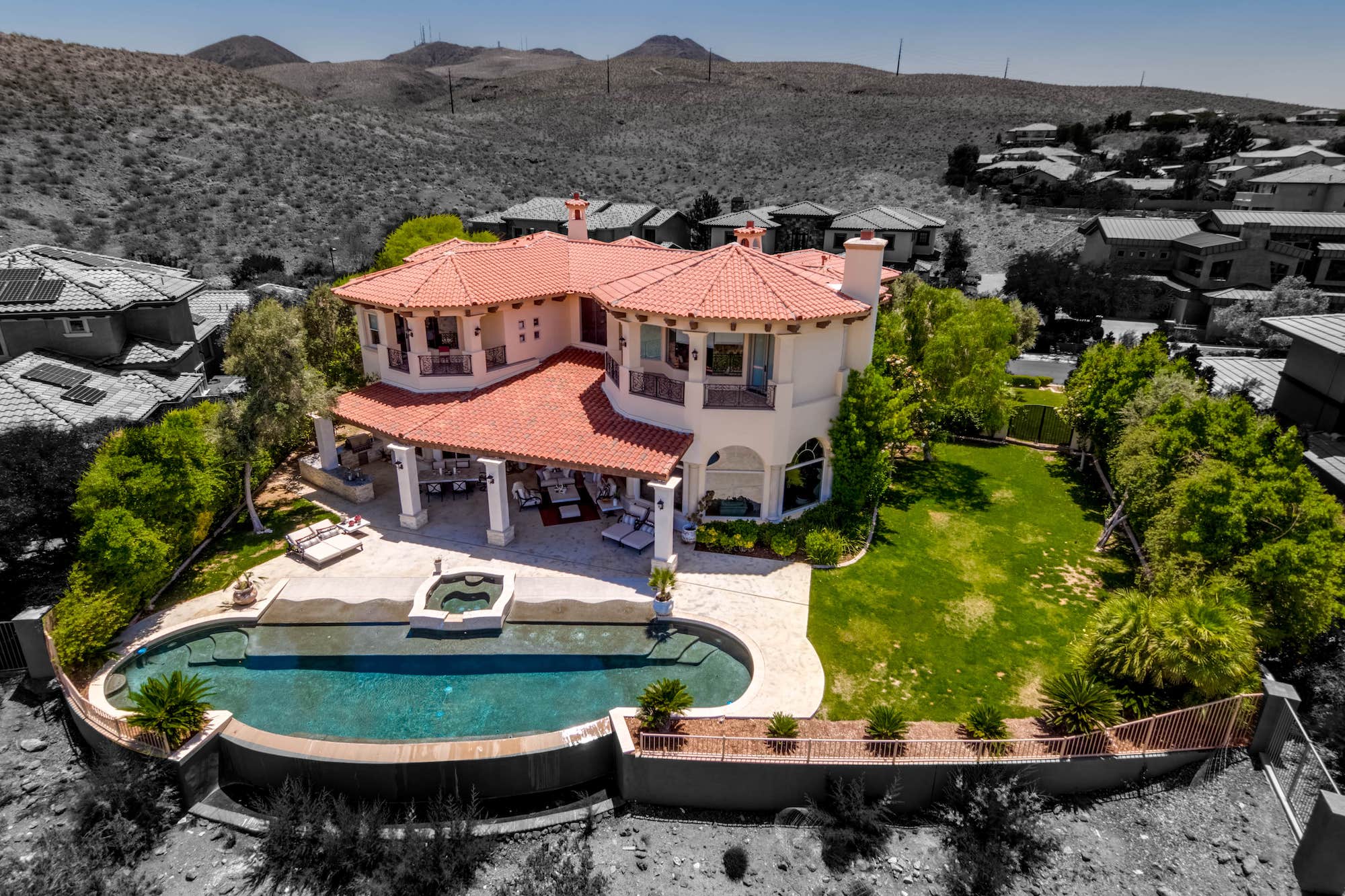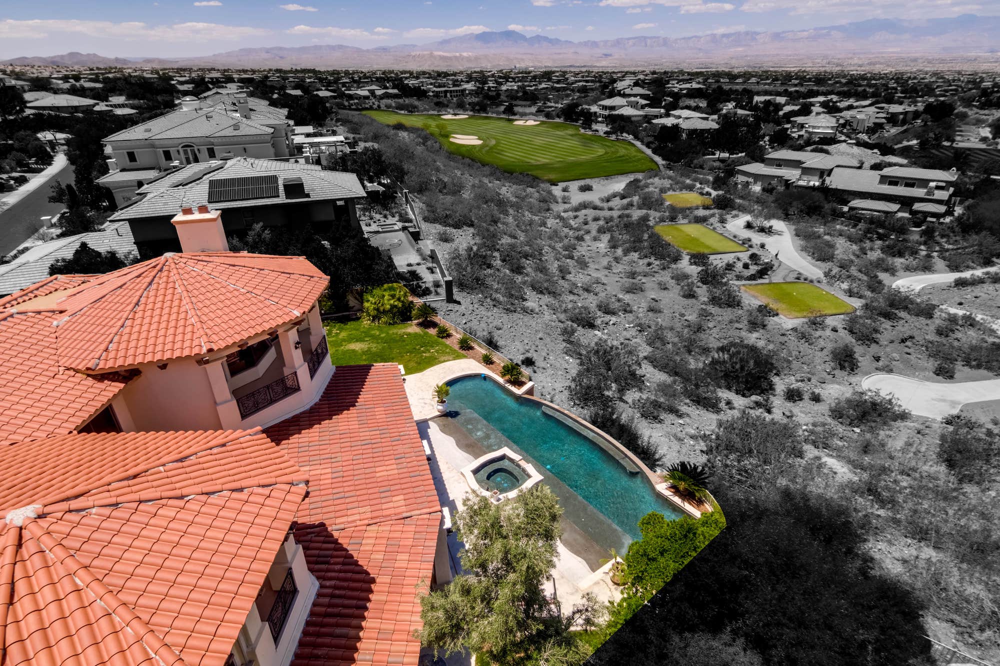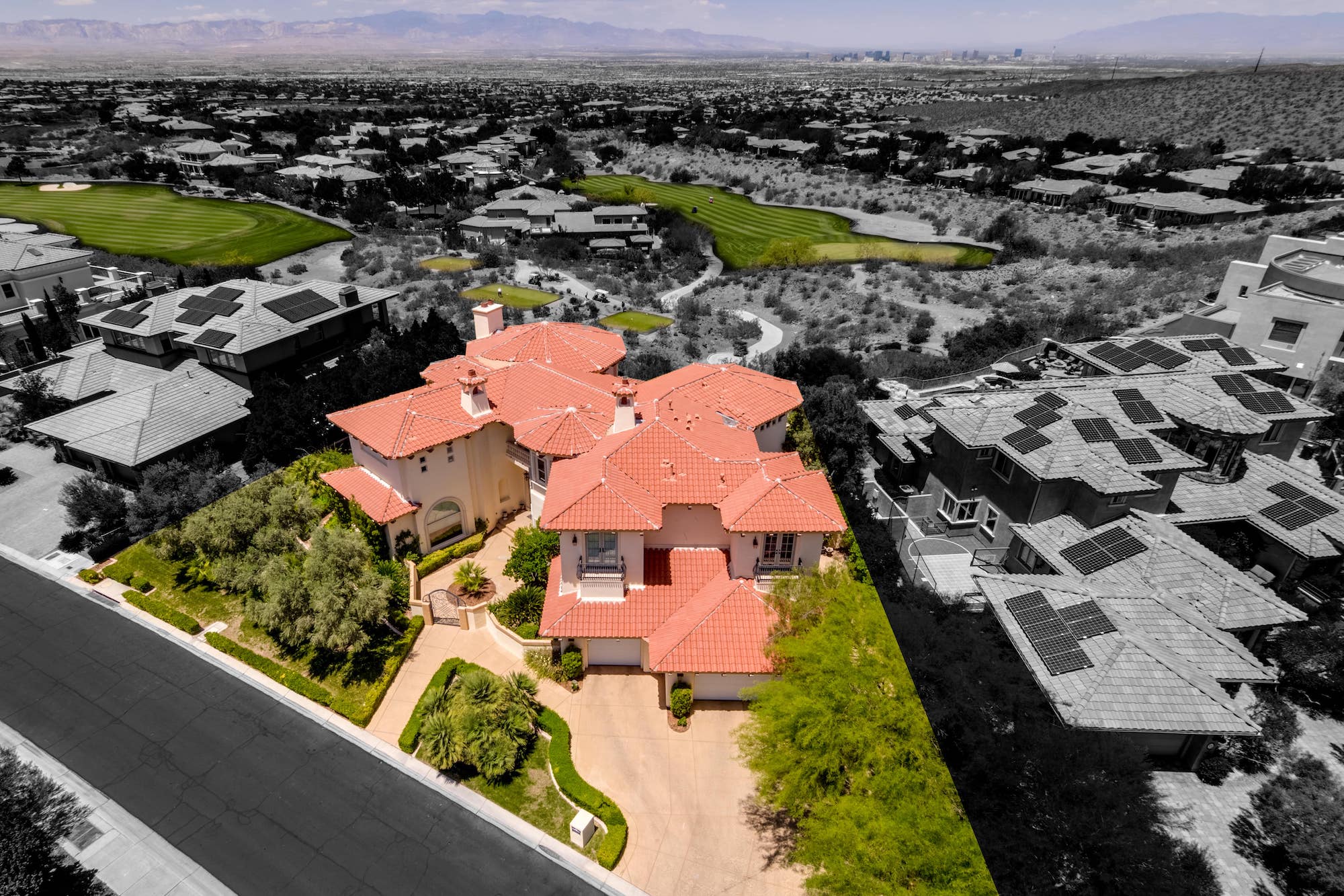 The hillside location offers an exceptional backyard setting with an infinity-edge pool, big yard, and tranquil outdoor living spaces. The covered patio includes an outdoor kitchen, ceiling fans, and plenty of space to entertain. Oversized windows brighten the home with natural light and showcase the spectacular Strip and golf course views. The beautiful entry features impressive iron doors and a grand staircase as it guides you to the large, open living room with a fully-equipped entertainersā bar.