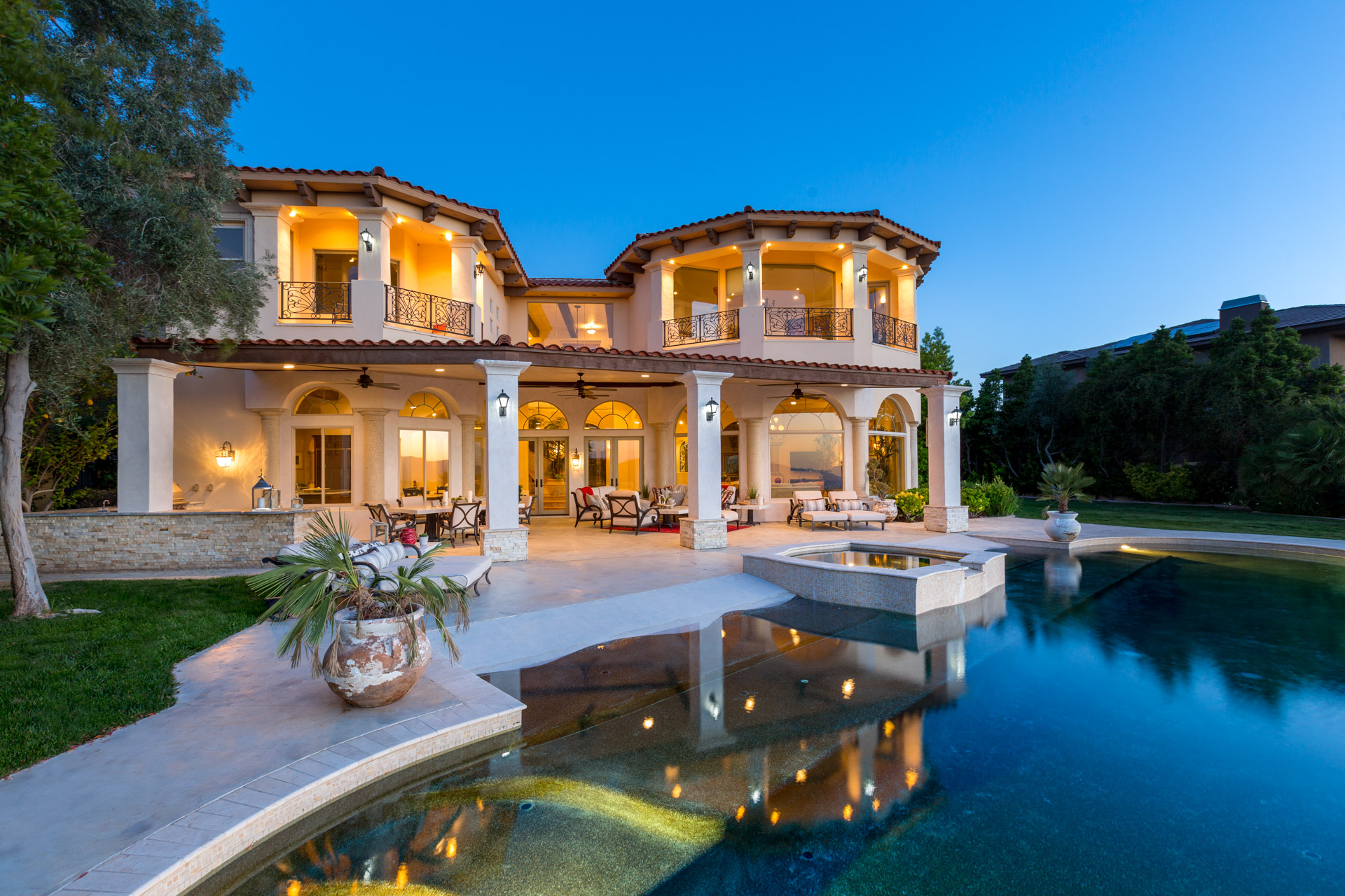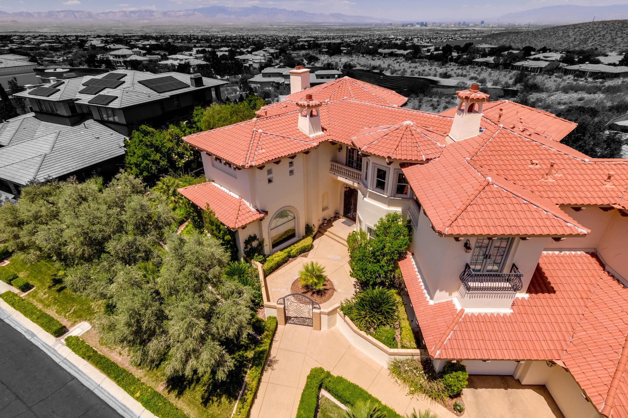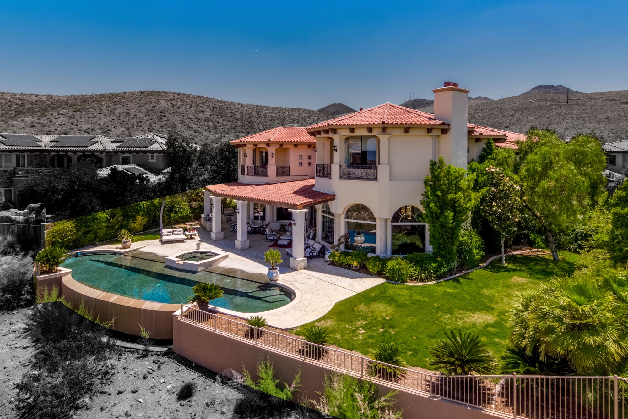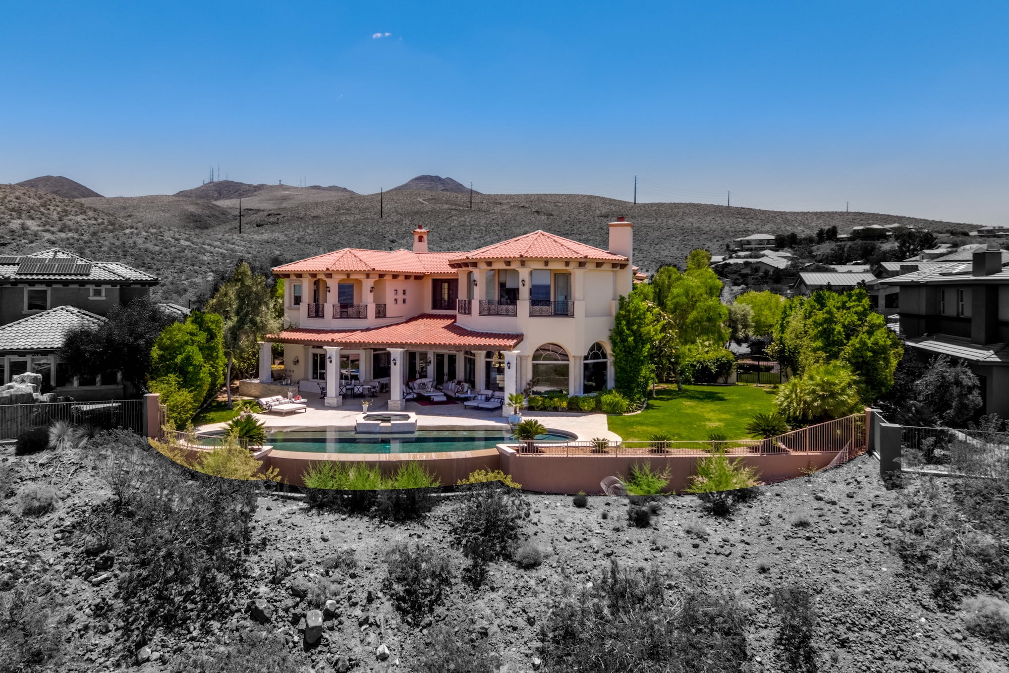 The hillside location offers an exceptional backyard setting with an infinity-edge pool, big yard, and tranquil outdoor living spaces. The covered patio includes an outdoor kitchen, ceiling fans, and plenty of space to entertain. Oversized windows brighten the home with natural light and showcase the spectacular Strip and golf course views. The beautiful entry features impressive iron doors and a grand staircase as it guides you to the large, open living room with a fully-equipped entertainersā bar.