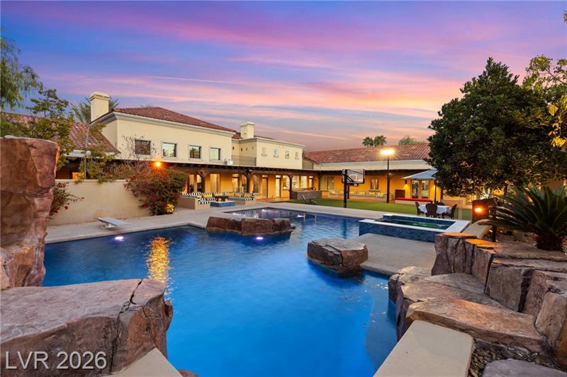 Designer touches and high-end craftsmanship are showcased throughout, creating a home that is both sophisticated and inviting. The resort-style backyard offers a sparkling pool and spa, covered patio, outdoor kitchen, and private sports court—ideal for gatherings of any size. Multiple courtyards enhance outdoor living, while additional amenities include a 4-car garage, home gym with sauna, custom 1950s-inspired diner, and dedicated media room. Optional Canyon Gate Country membership offers golf, tennis, Club house and dining.