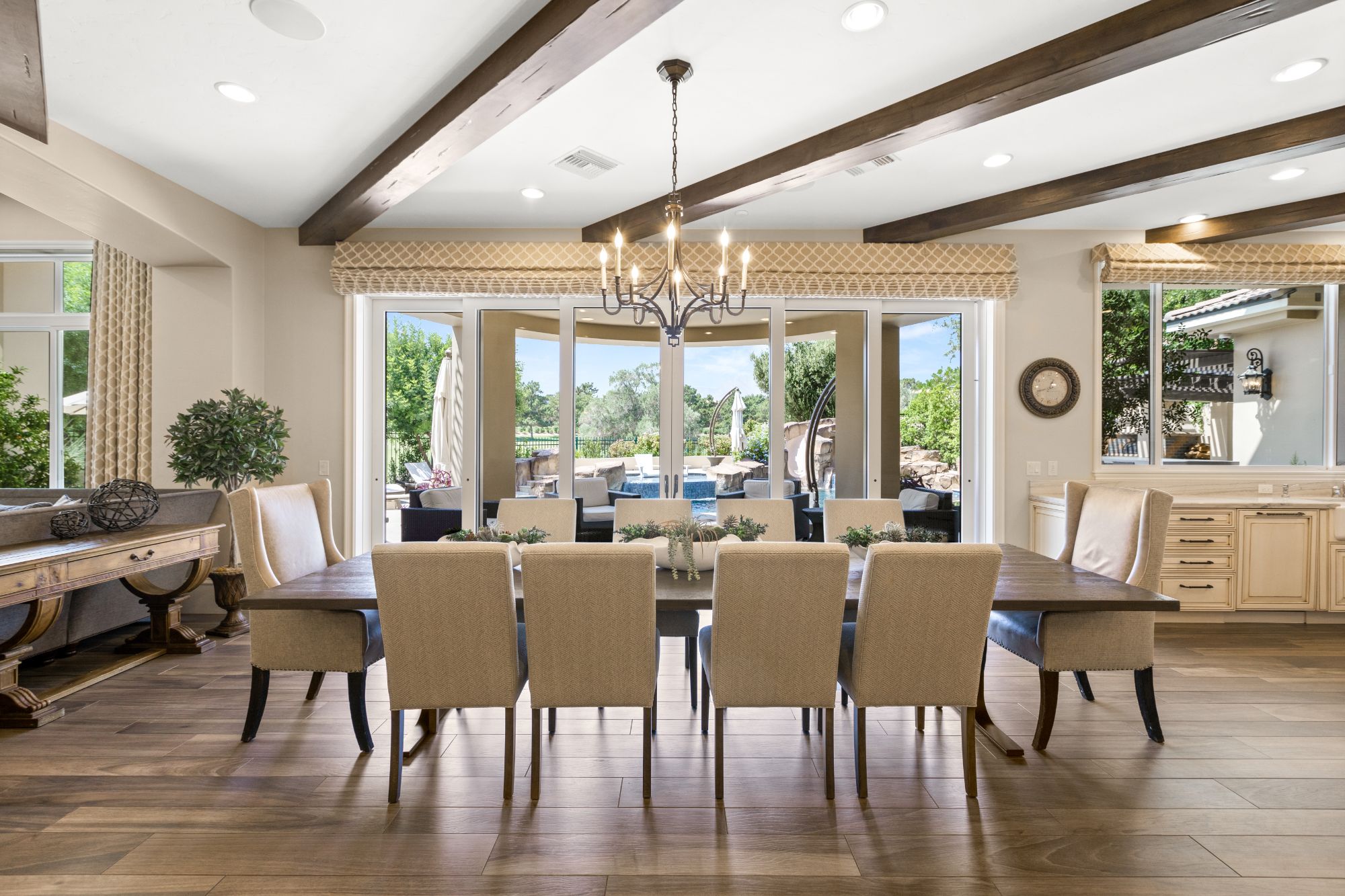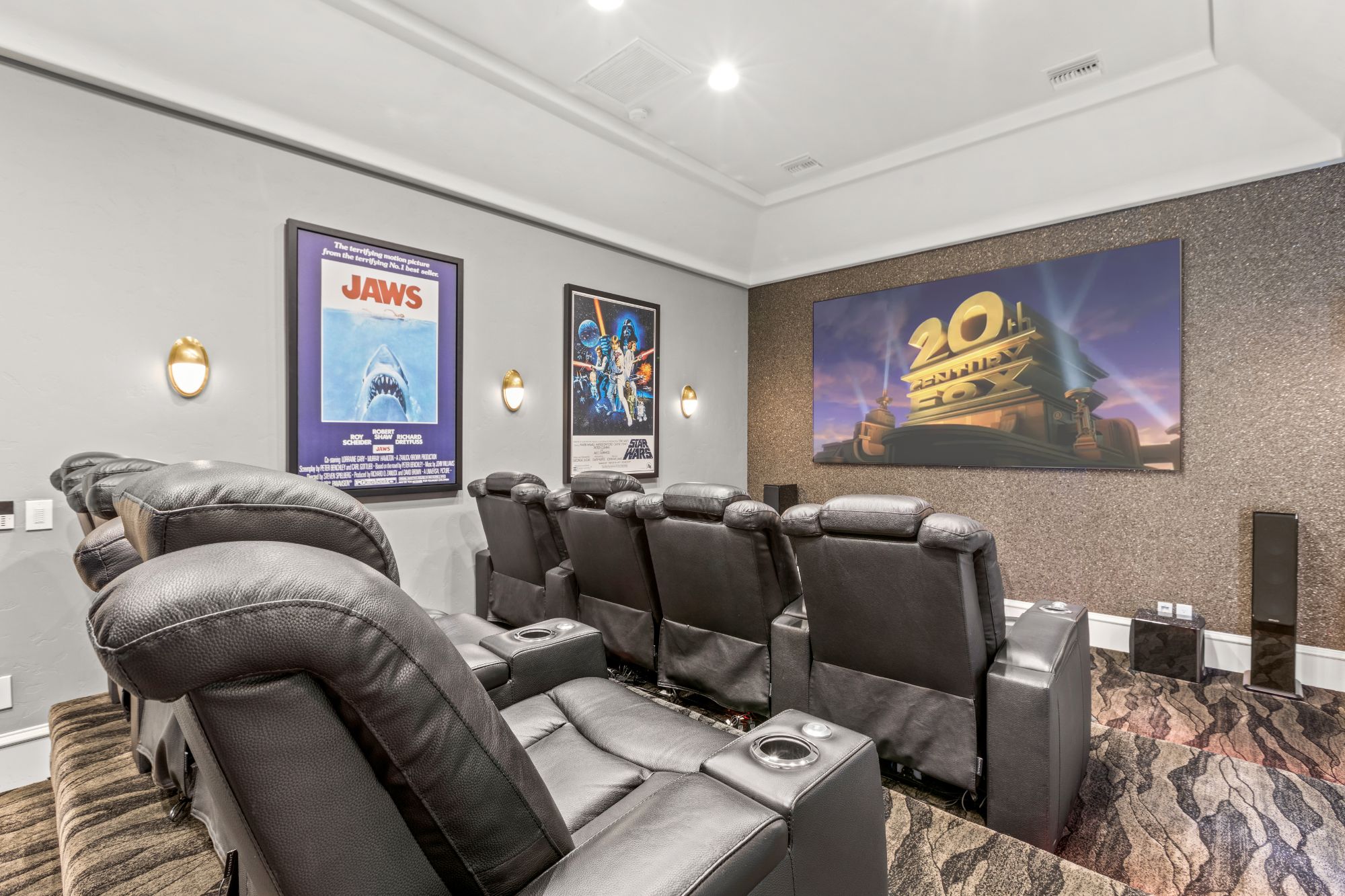 This home has a spectacular oversize glass and wrought-iron entry door, a custom-designed staircase and railing that dominate the foyer, a home theater, a wood-paneled office with built-in bookshelves, a gym that overlooks the golf course, a game room with a view of a private outdoor sitting area and laundry rooms both up and down. The open plan living, and dining areas are highlighted by distressed beams and custom ceiling treatments and lighting, and the expansive kitchen, with two islands, features a pantry with Subzero freezer, two dishwashers, four ovens, a coffee bar and a planning desk. The home also features a bar area with custom-designed wine refrigeration, a home theater, a gym overlooking the golf course, and a game room adjacent to a private outdoor sitting area. There are six bedrooms and nine baths. A palatial second-floor owners' suite, with a private sitting area and spacious balcony, also features a private staircase to the home's main floor. The ensuite bath/dressing room includes his and her walk-in closets as well as dual lavatories and water closets, a steam shower and freestanding soaking tub.