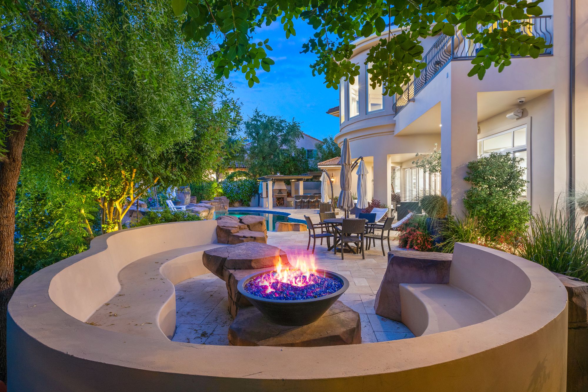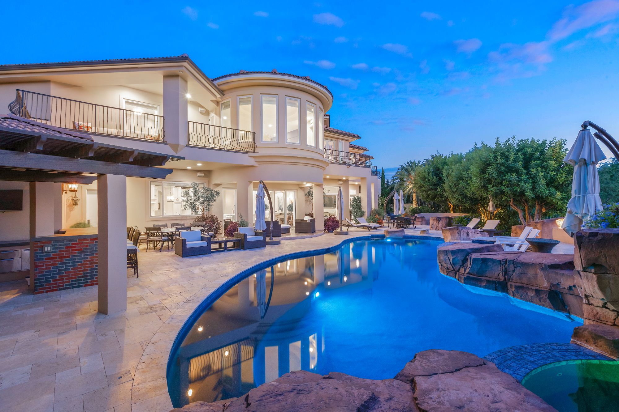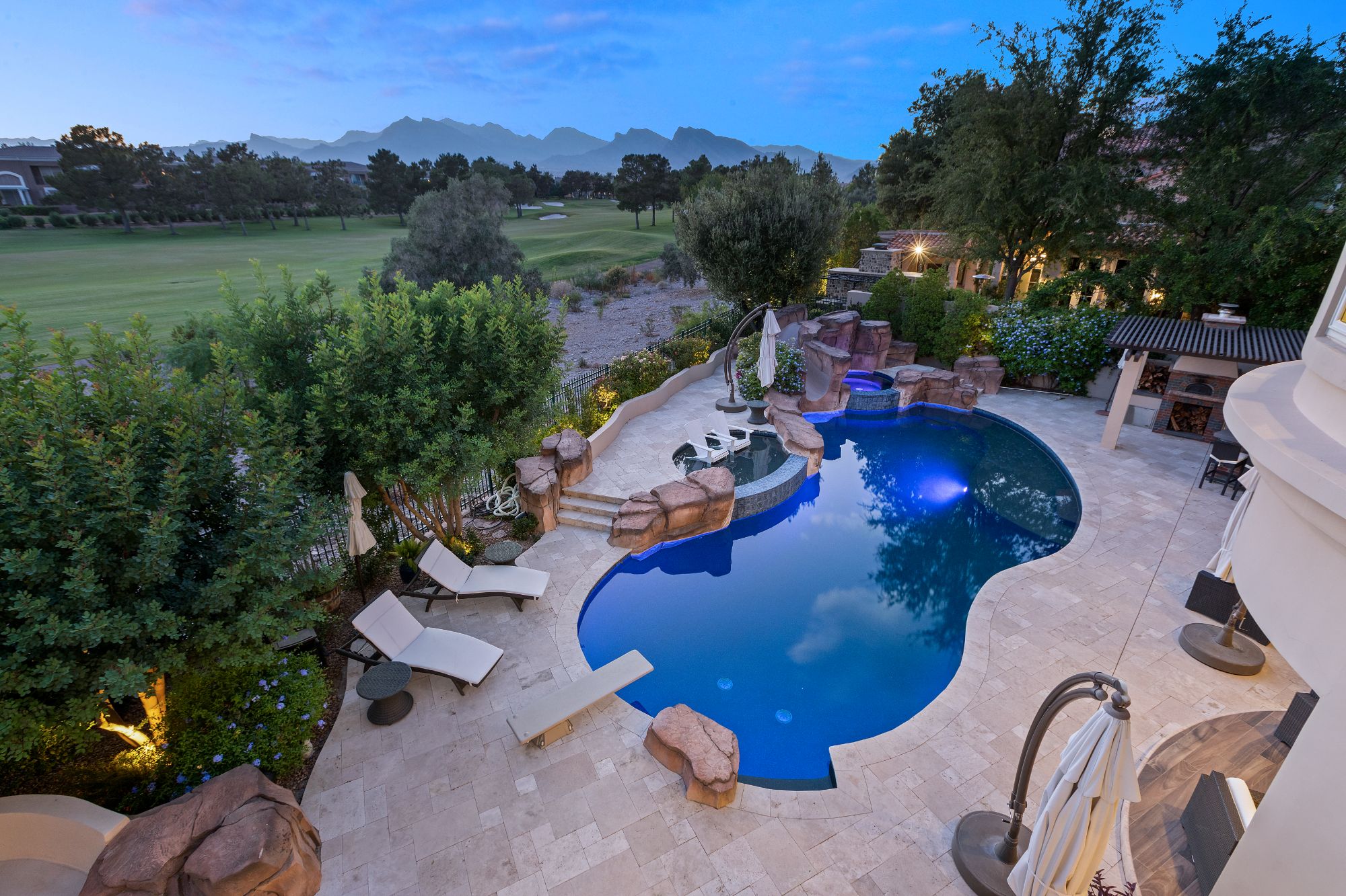 Sited on a half-acre lot with 7th-hole golf course frontage and amazing sunset views, the home has six bedrooms and nine baths, several outdoor entertainment areas, in addition to an outdoor kitchen, pizza oven and firepit, and a pool with a fountain, slide and spa.