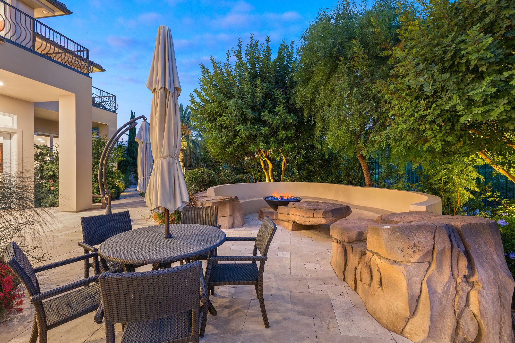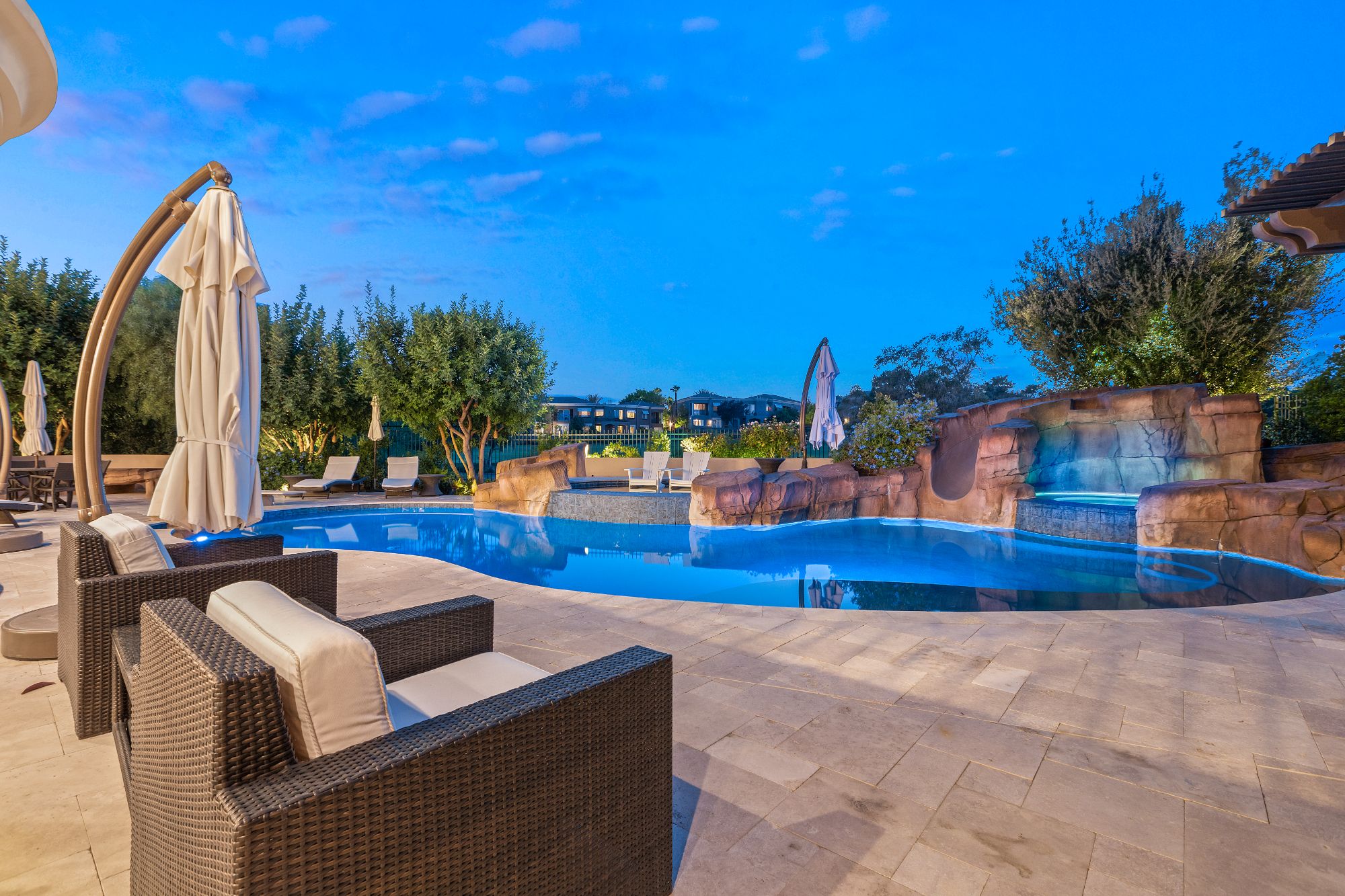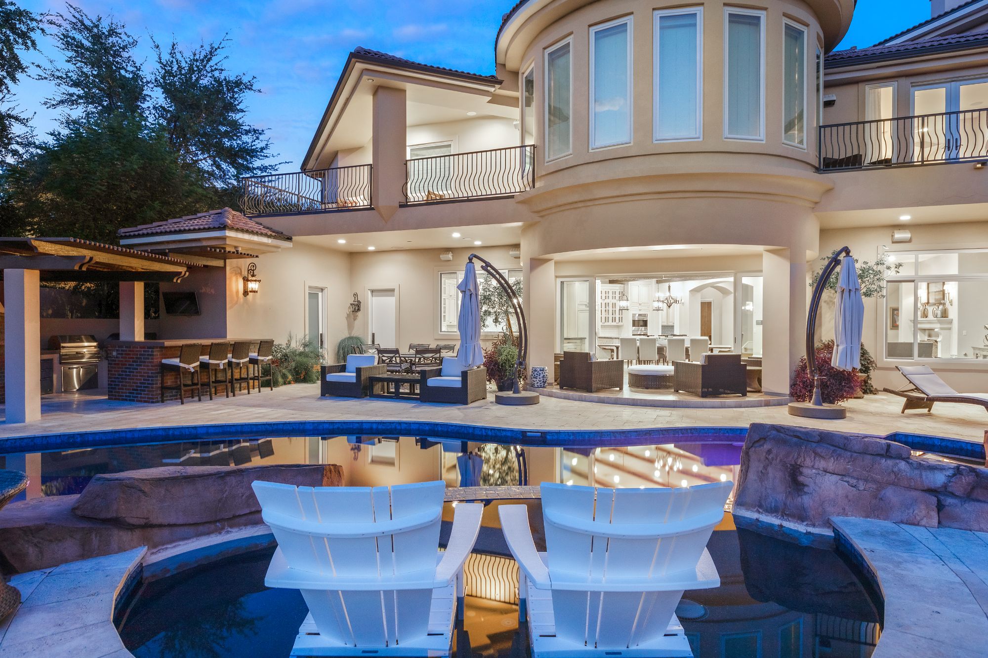 Sited on a half-acre lot with 7th-hole golf course frontage and amazing sunset views, the home has six bedrooms and nine baths, several outdoor entertainment areas, in addition to an outdoor kitchen, pizza oven and firepit, and a pool with a fountain, slide and spa.