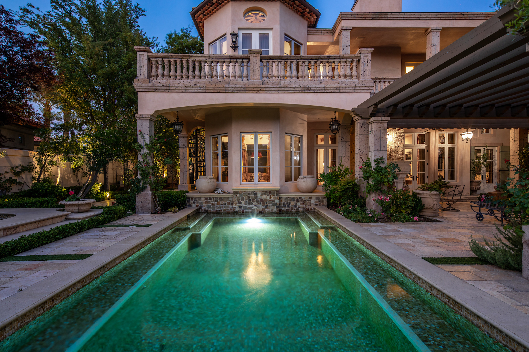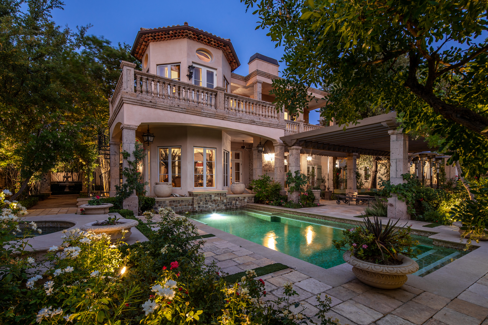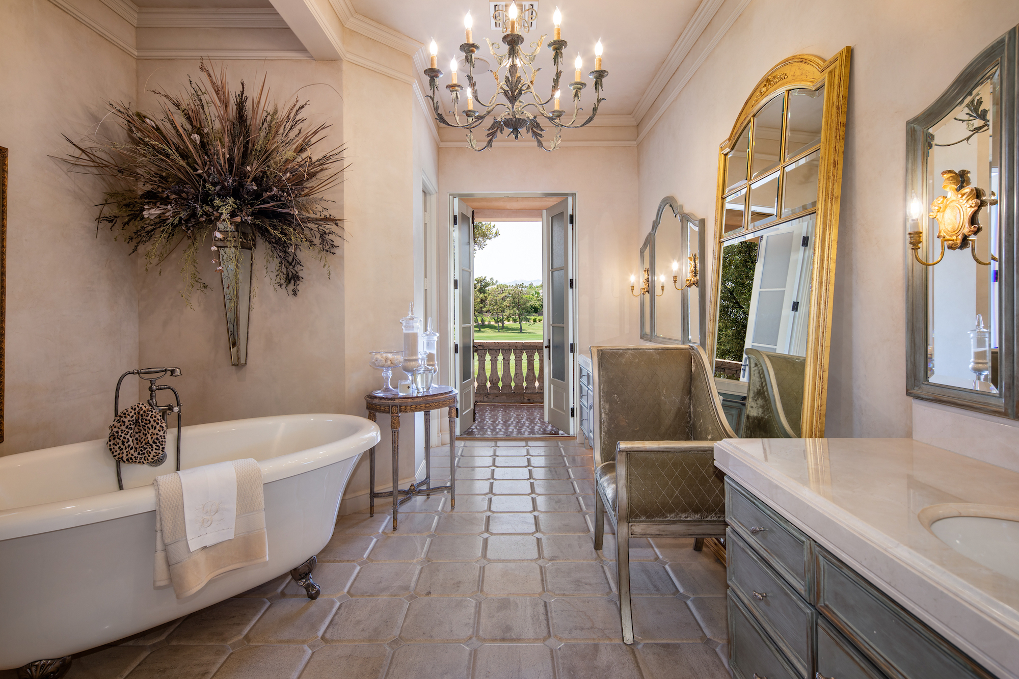 The primary living areas and kitchen of the Mediterranean-style home all feature French-door access to the surrounding gardens. Angled beamed ceilings add to the cozy appeal of the kitchen, breakfast area, and den, and mellow tones of gold and russet floor and accent tiles add warmth. Brighter gold enlivens the dark wood cabinetry of an adjacent butler's pantry. The rear yard with its classic rectangular pool and adjacent trellises and roofed pavilions, also has a circular staircase to a second-floor balcony, allowing easy access to the yard from upstairs bedrooms. The second-floor master suite boasts double French doors from the hall, as well as a set of glass doors to a wraparound balcony with stunning views of the gold course and distant mountains. Its private bath, with a distinctive clawfoot tub and separate shower, also opens to the private balcony. This home is a treasure, with high-quality finishes and design elements to recommend it.