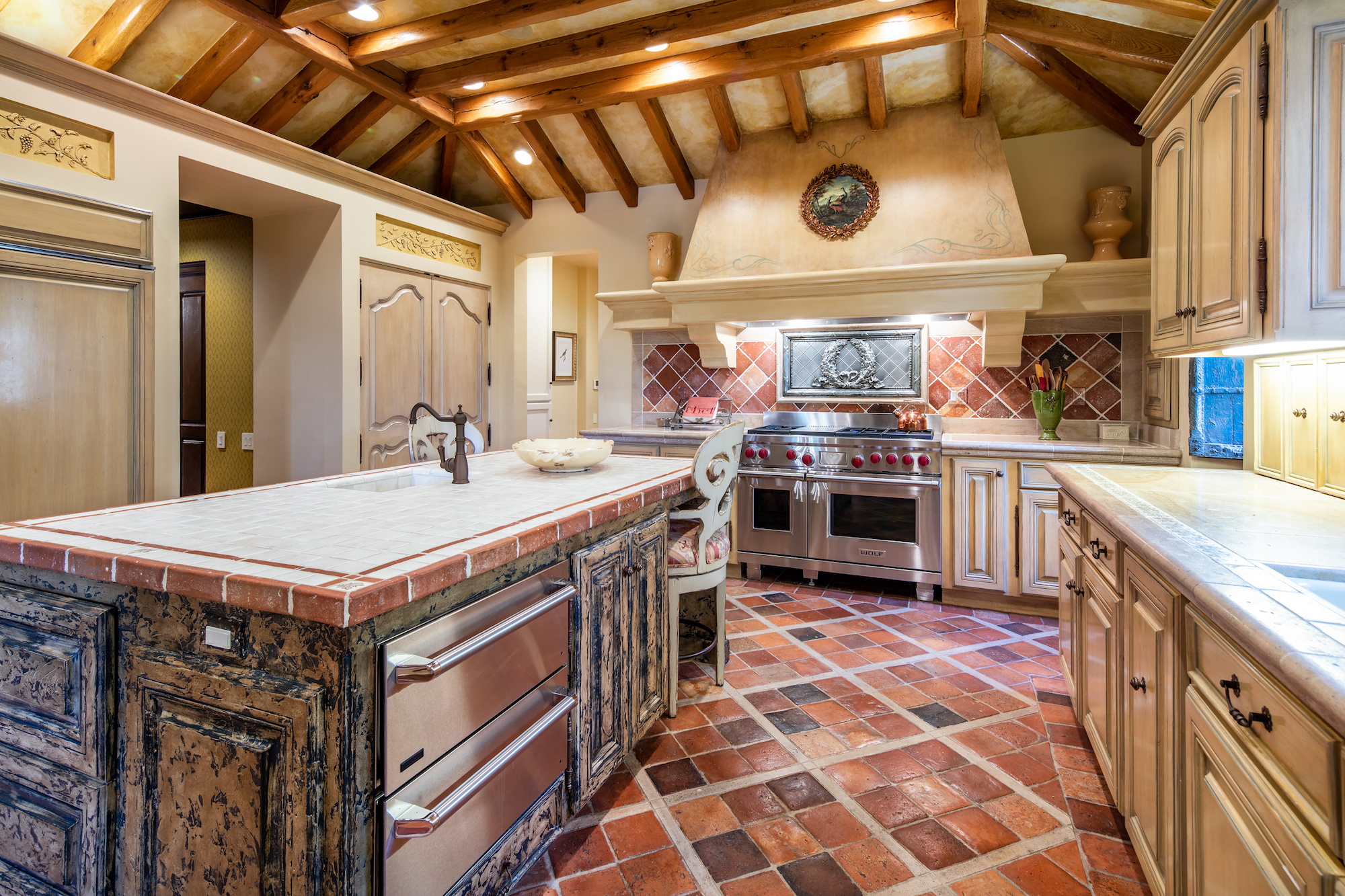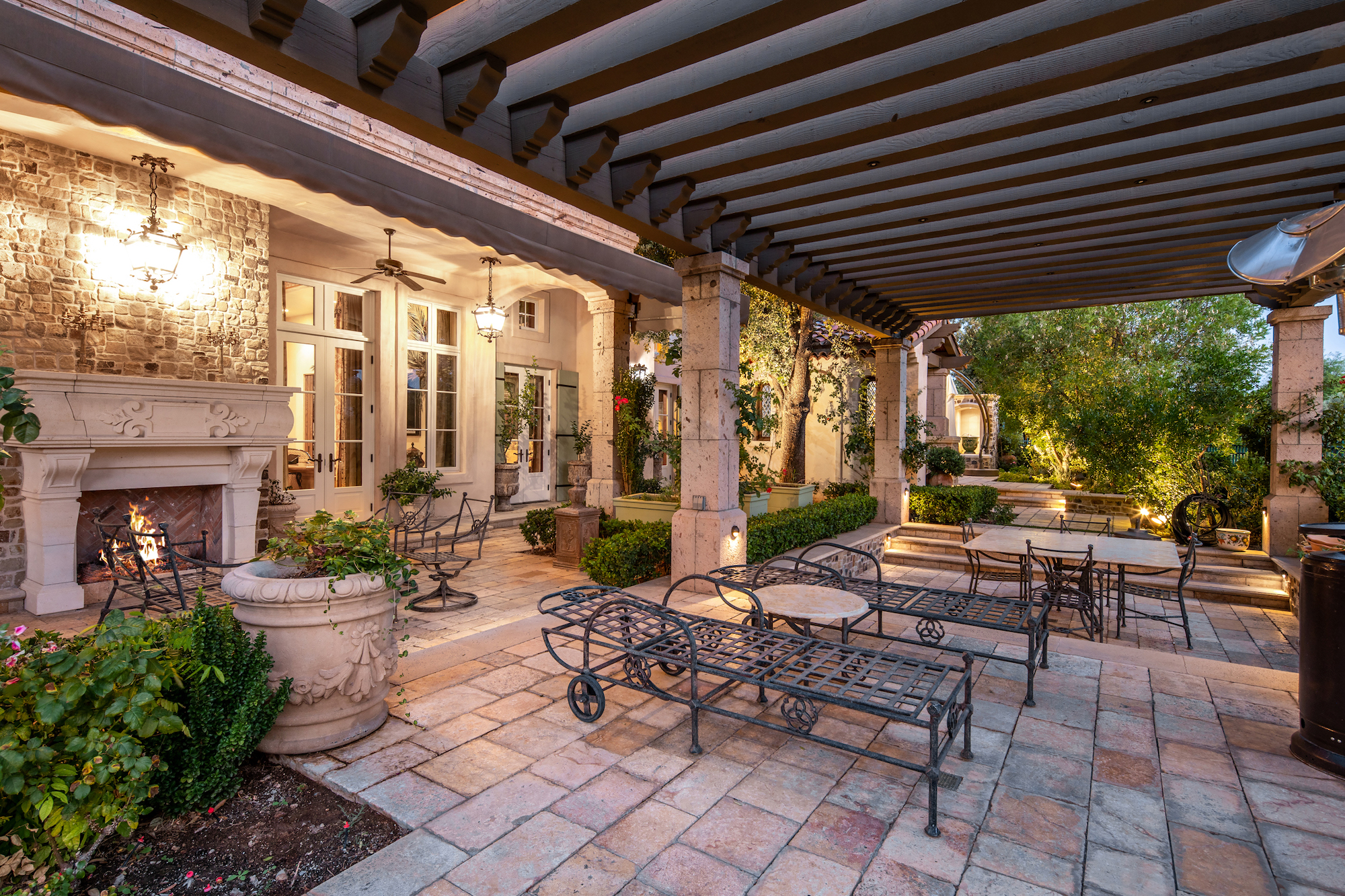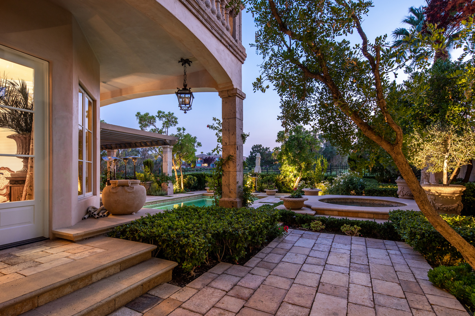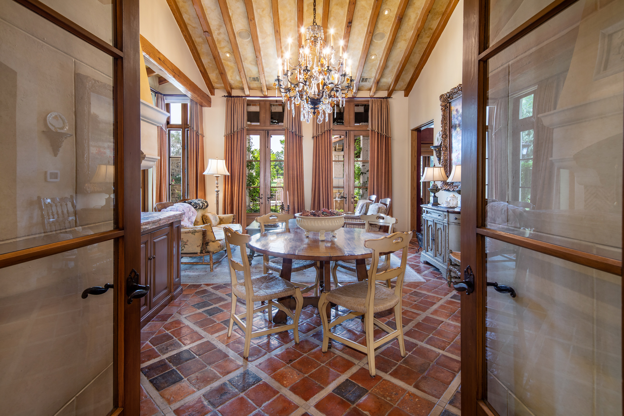 The primary living areas and kitchen of the Mediterranean-style home all feature French-door access to the surrounding gardens. Angled beamed ceilings add to the cozy appeal of the kitchen, breakfast area, and den, and mellow tones of gold and russet floor and accent tiles add warmth. Brighter gold enlivens the dark wood cabinetry of an adjacent butler's pantry. The rear yard with its classic rectangular pool and adjacent trellises and roofed pavilions, also has a circular staircase to a second-floor balcony, allowing easy access to the yard from upstairs bedrooms. The second-floor master suite boasts double French doors from the hall, as well as a set of glass doors to a wraparound balcony with stunning views of the gold course and distant mountains. Its private bath, with a distinctive clawfoot tub and separate shower, also opens to the private balcony. This home is a treasure, with high-quality finishes and design elements to recommend it.