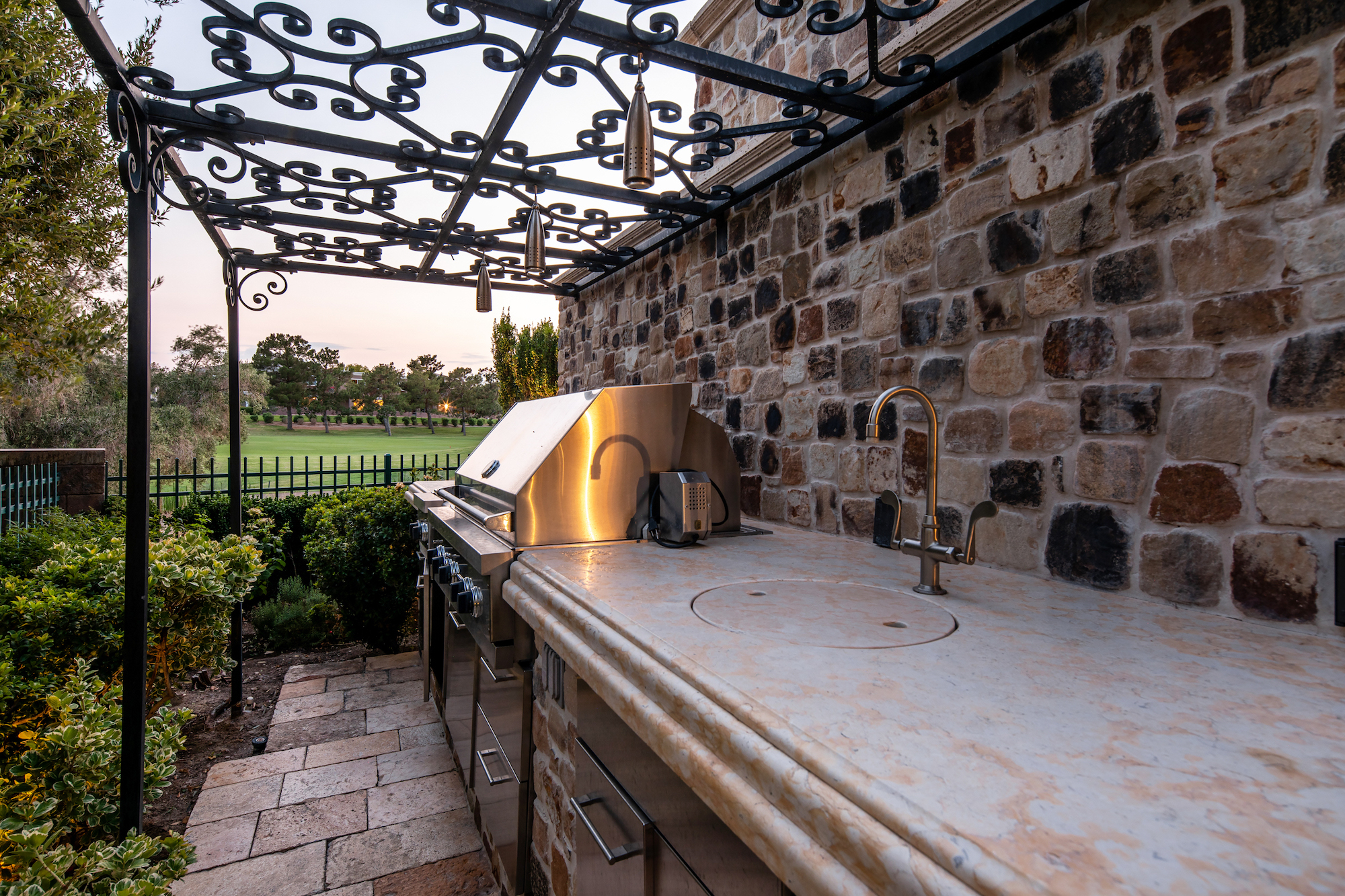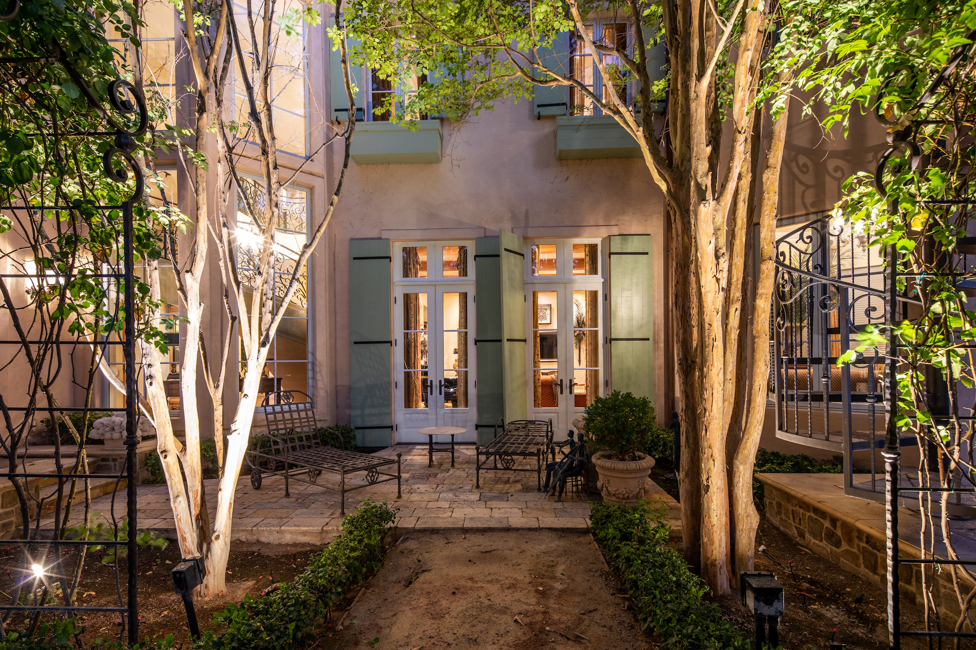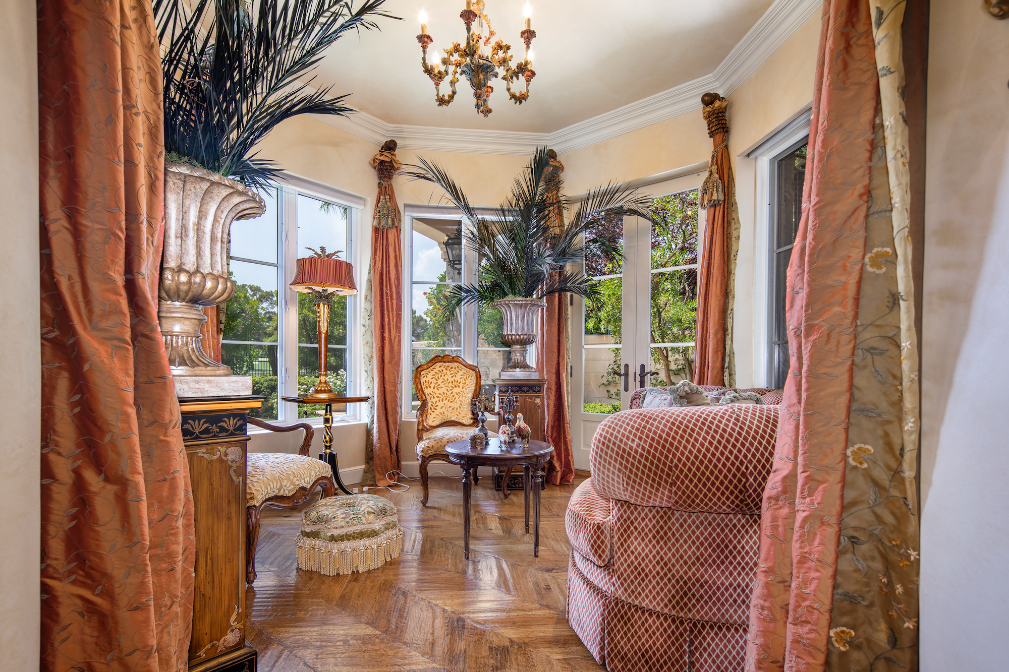Not only is there an indoor-outdoor ambiance about the home, but despite its decidedly traditional flavor, it has a casual, comfortable appeal, nowhere more evident than in the library/card room with its wrought-iron circular staircase to a mezzanine library, or in an intimate wet bar with chair-height seating rather than barstools. It's this attention to small details that permeate the design.