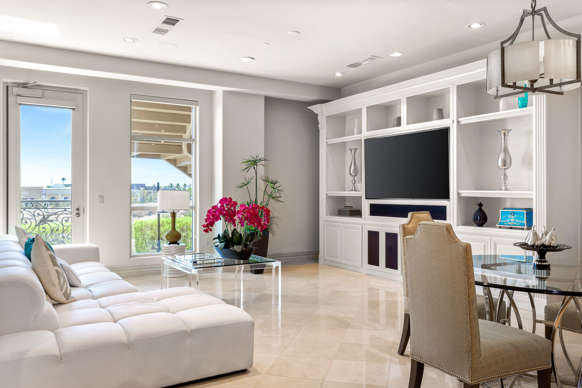 Neutral tones for walls and trim keep the interiors light, but never boring, and the baths are finished with coordinated marble vanity tops and upscale plumbing fixtures and faucets. Interiors also have updated recessed lighting fixtures and ceiling fans. A storage-filled laundry includes an under-counter Bosch washer and dryer for exceptional convenience. The master bath features dual vanities, plus a dressing table, a jetted tub, and a completely glass-enclosed steam shower, and the master suite includes a walk-in closet with custom storage, and a private terrace just outside. The second spacious bedroom suite also features an ensuite bath and French door entry.