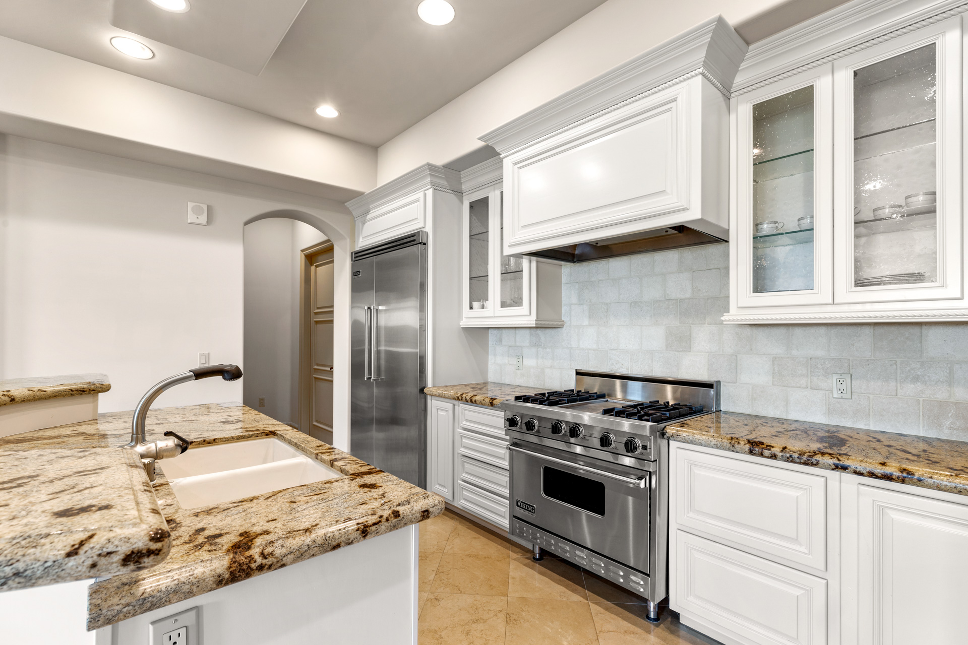 This light and airy open plan has been superbly updated with pleasing contemporary fixtures and finishes. It includes a kitchen with Viking stainless appliances to include a gas range and built-in refrigerator-freezer, as well as a separate wall oven, microwave, and dishwasher. White cabinetry and creamy granite counters compliment the pale ivory marble flooring used throughout the residence.