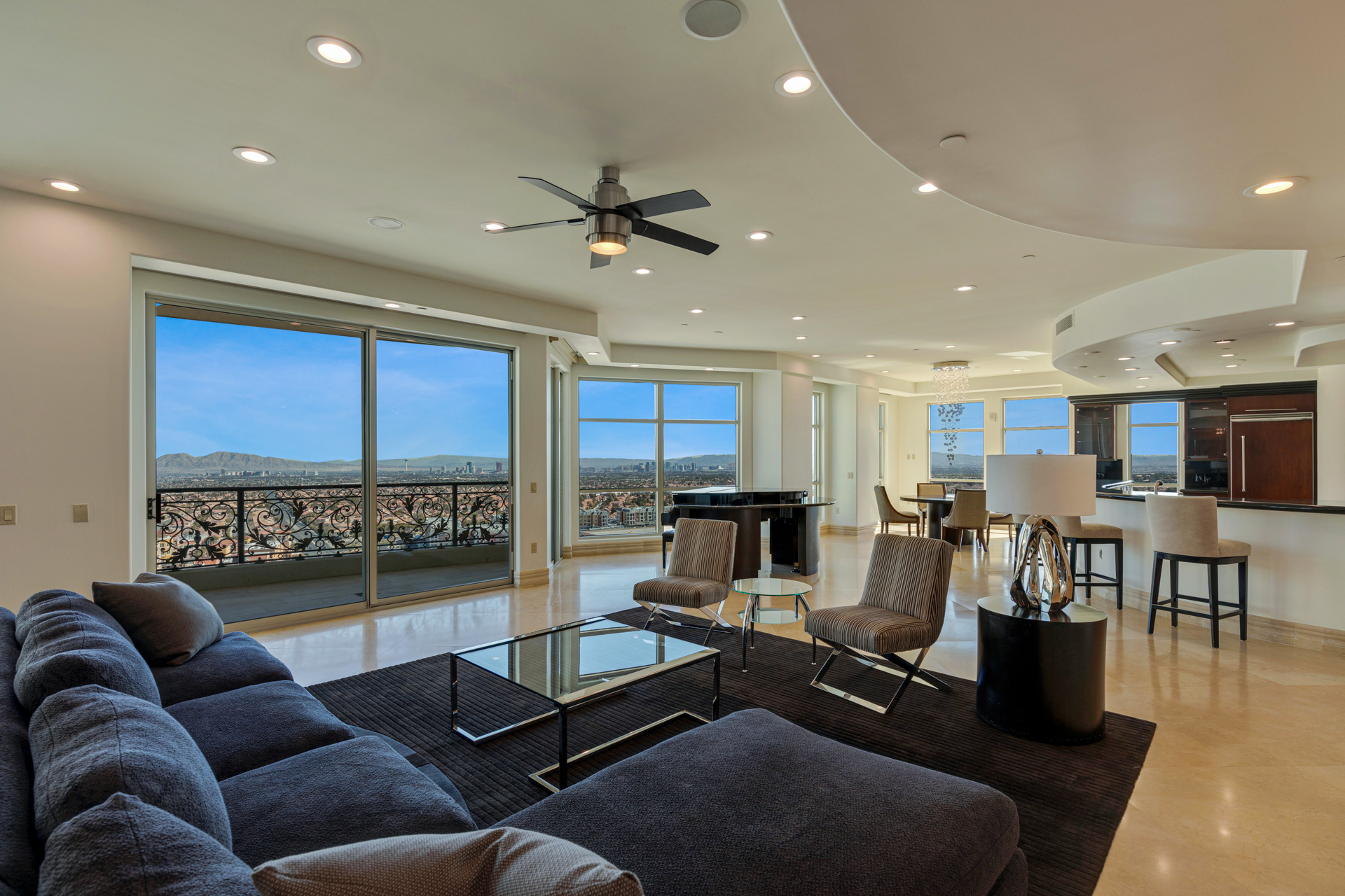 One of the best penthouse units in One Queensridge Place, the most highly amenitized building in Las Vegas. Accessible by an express elevator that only services 6 other units, this 6,400 square foot, 4 bed, 5.5 bath unit with garage space for 5 cars has unparalleled views of the world-famous Las Vegas Strip to the east and the renowned Red Rock Canyon to the west.