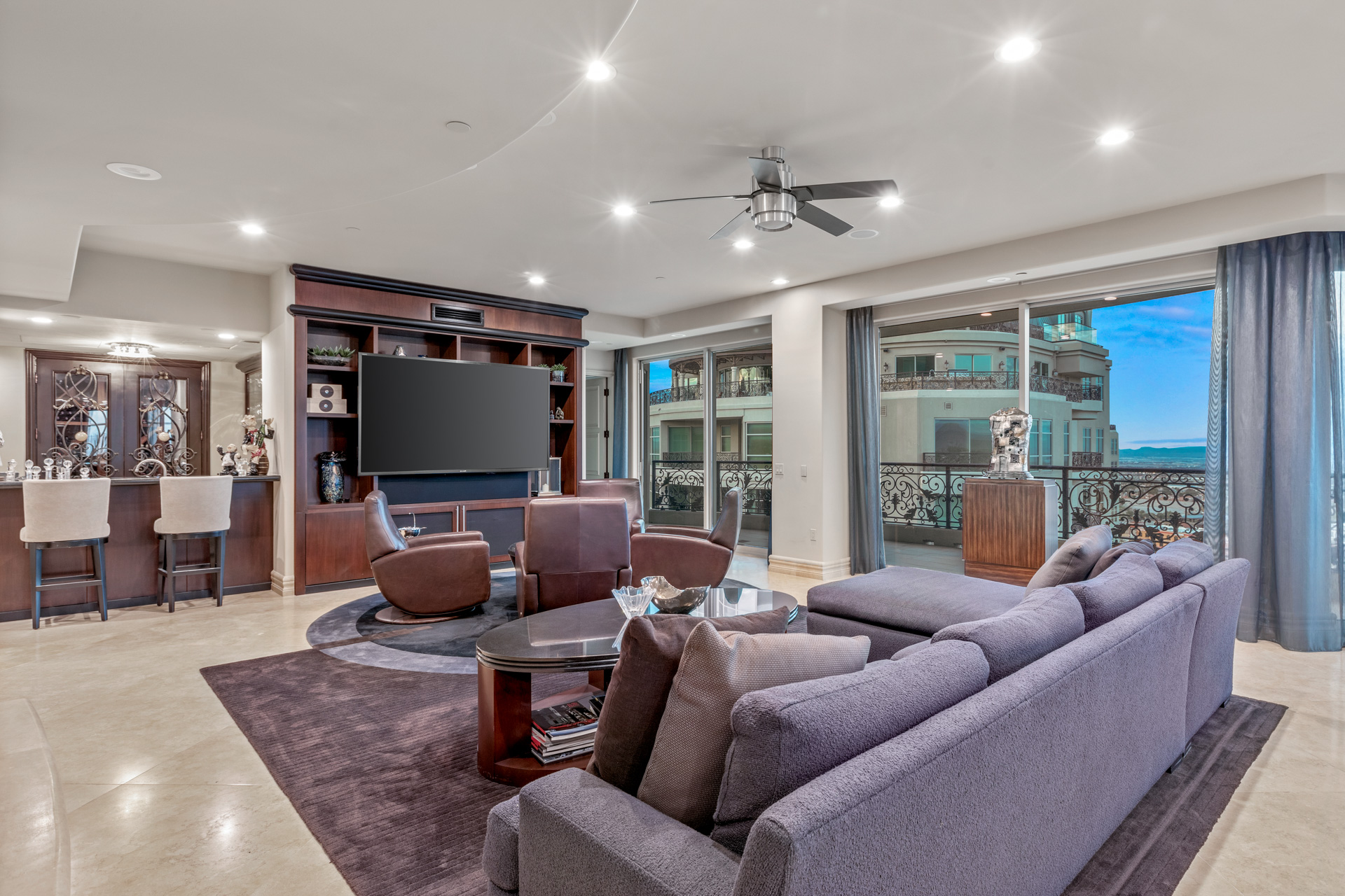 It is a home that is as comfortable as it is sophisticated, with spaces that seem cozy despite the size. An intimate theater room invites at-home viewing, while a family den with a full bath tucks into a quiet corner at another end of the unit. The living room is immense, with a wall of windows to capture vistas of distant mountains as well as the city that stretches out below.