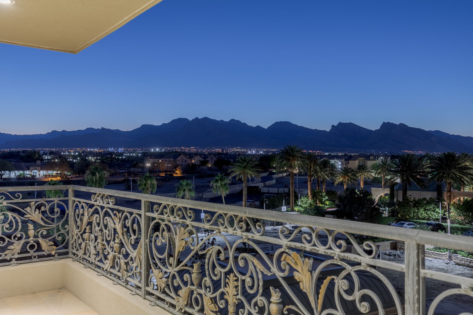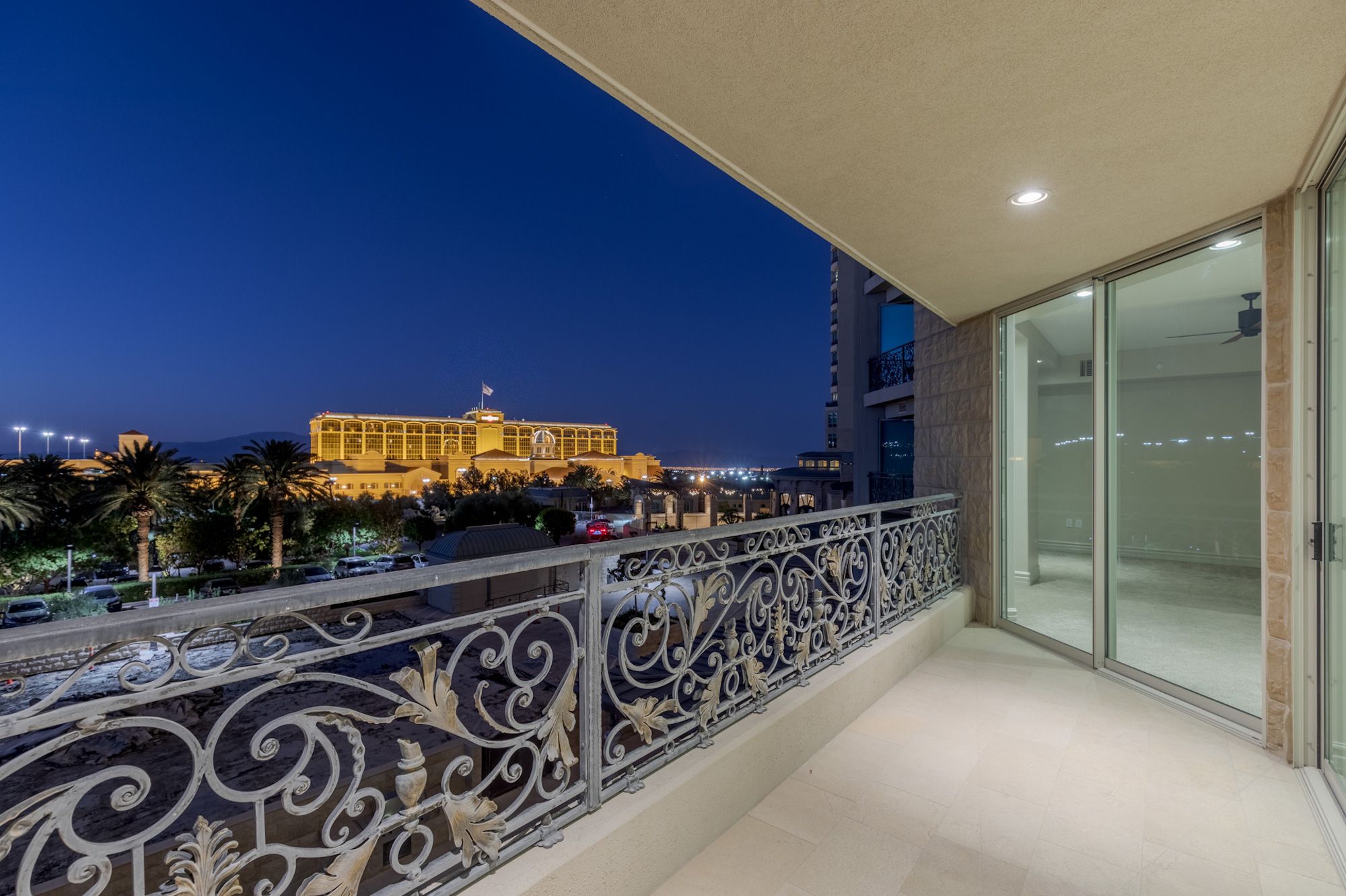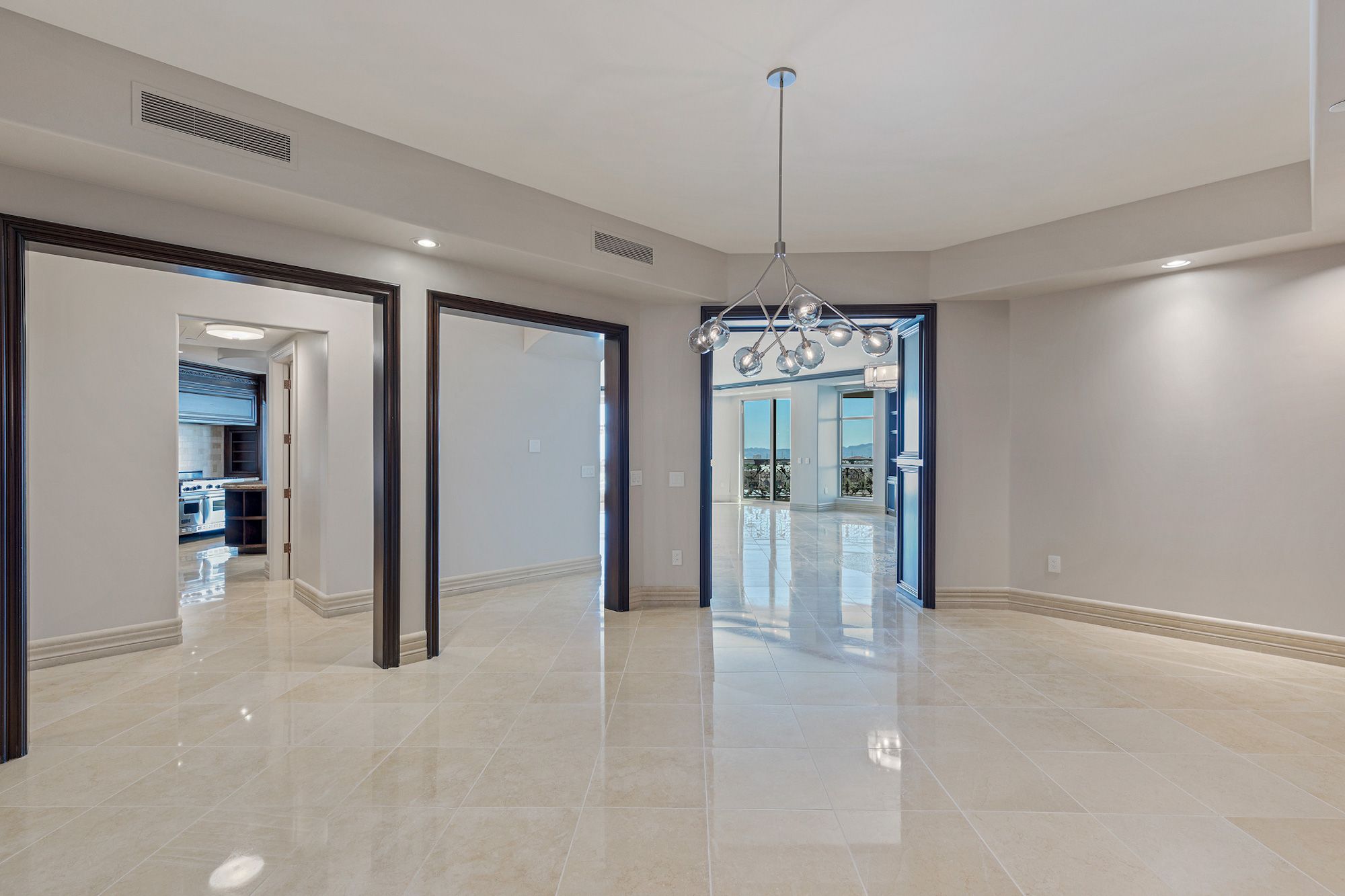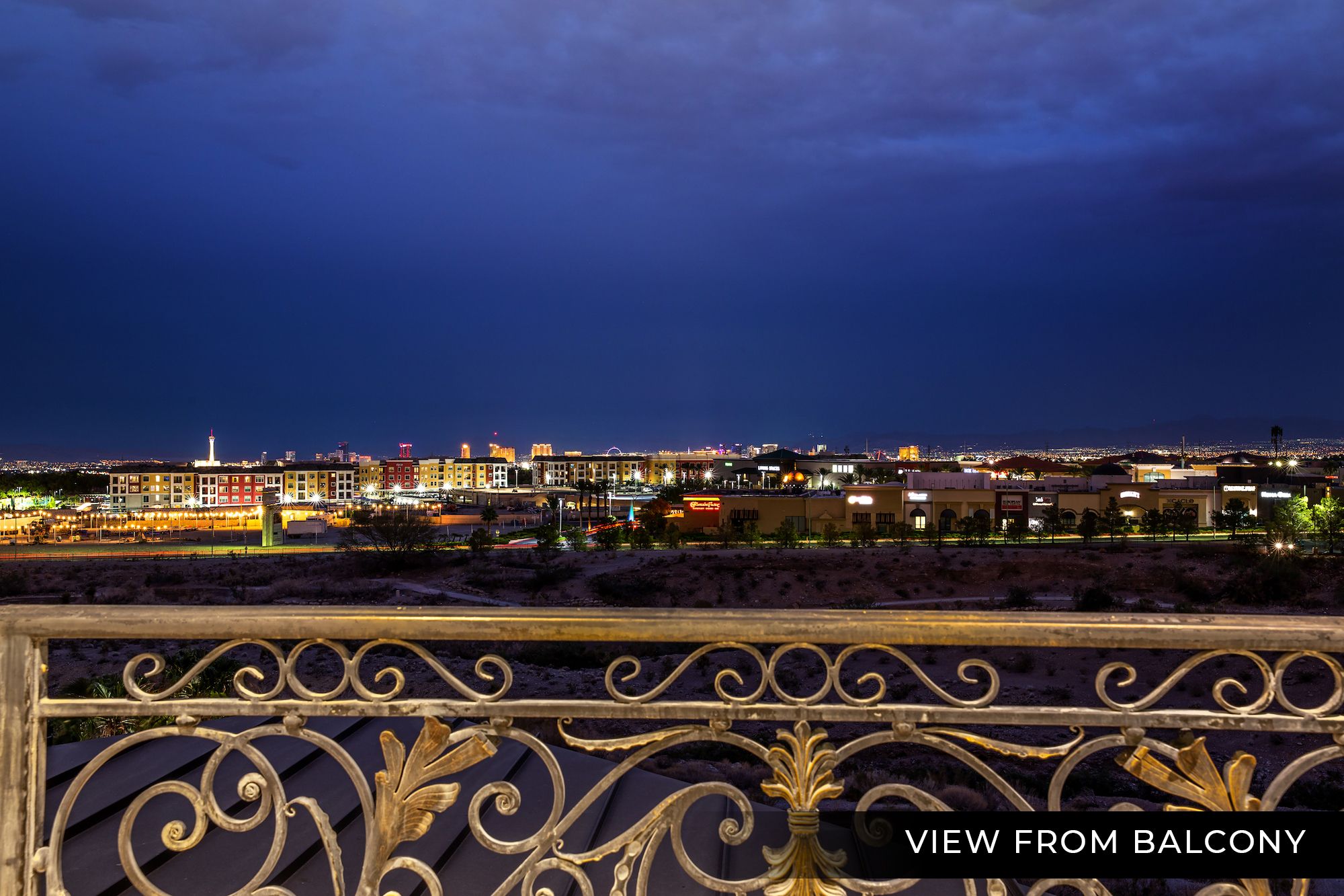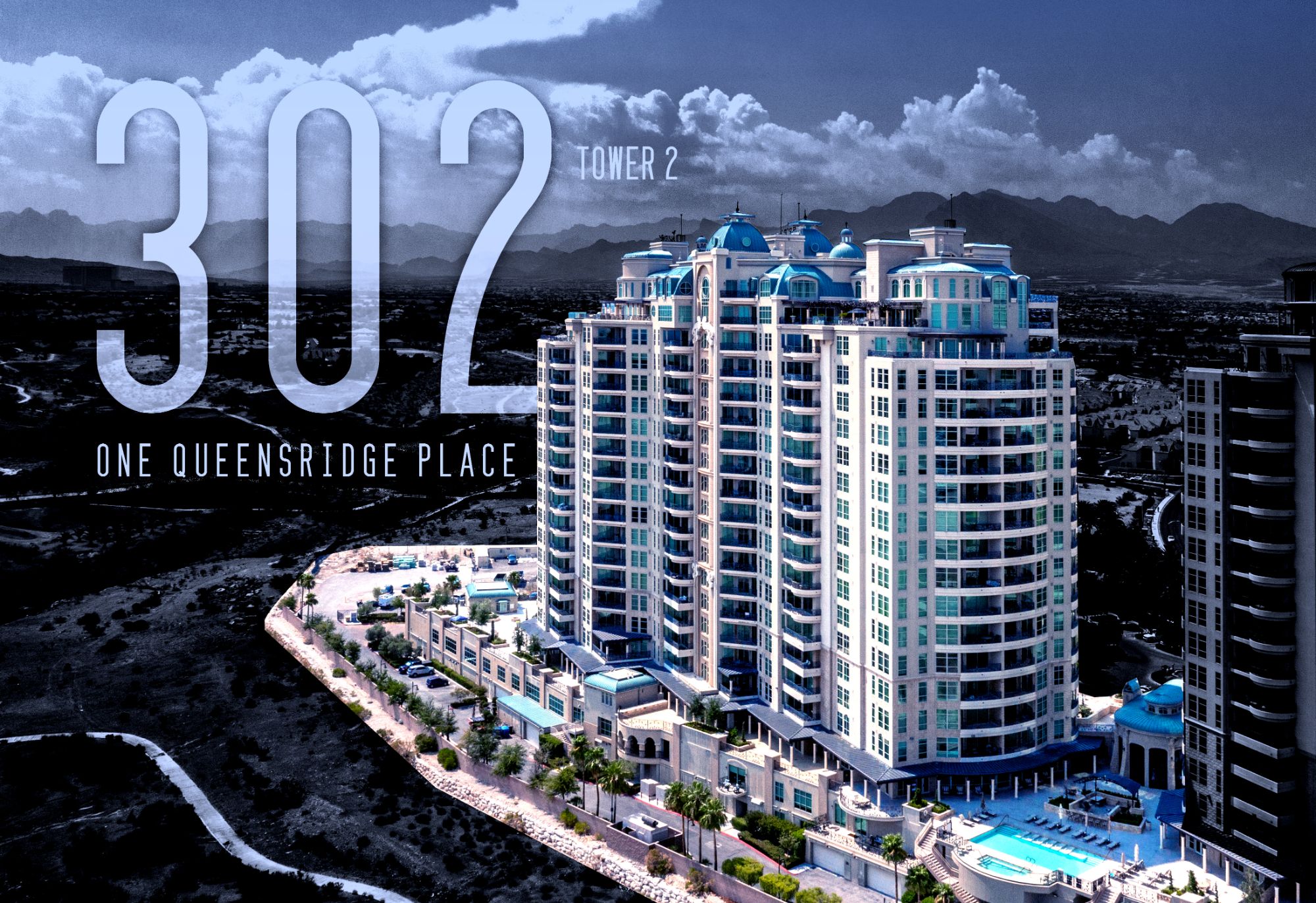 A gourmet kitchen, with abundant prep surfaces and storage, is open to the living area and has not only a massive central island but a raised-counter serving area and an adjacent wet bar for cocktail service. Stainless steel Viking appliances include a six-burner gas range in addition to a separate wall oven and microwave. Views of the Las Vegas Strip and Red Rock Mountains are highlighted from two terraces that expand the living space of this 3,800 square foot, three-bedroom plus office floor plan. The unit also boasts three full baths and a guest powder room. Attention to specific details is obvious in the renovation. A mosaic floor medallion is a focal point of the foyer, while a graceful chandelier echoes the motif from above. Another artistic medallion graces the wall over a soaking tub in the primary bath, while fluted molding frames large mirrors over the dual vanities and makeup counter. Rich wood bookshelves are featured in the office and a paneled wall accents the dining room. Custom closet systems are featured throughout. Choose to come home to One Queenridge, and embrace a life filled with luxury.