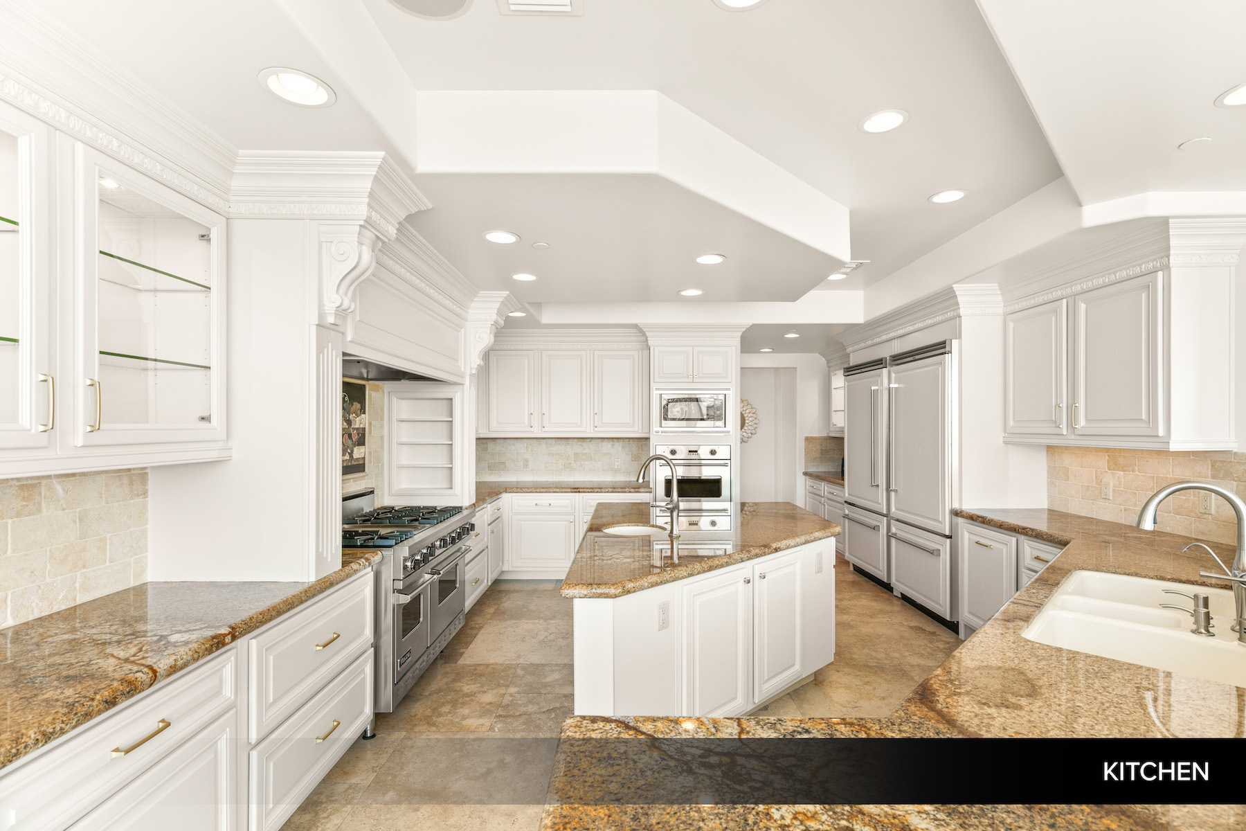The great room includes a fireplace, built-in entertainment cabinet and adjacent wet bar. The kitchen includes double Viking refrigerators and freezers, two sinks, a freestanding Viking gas range, two ovens and two dishwashers.