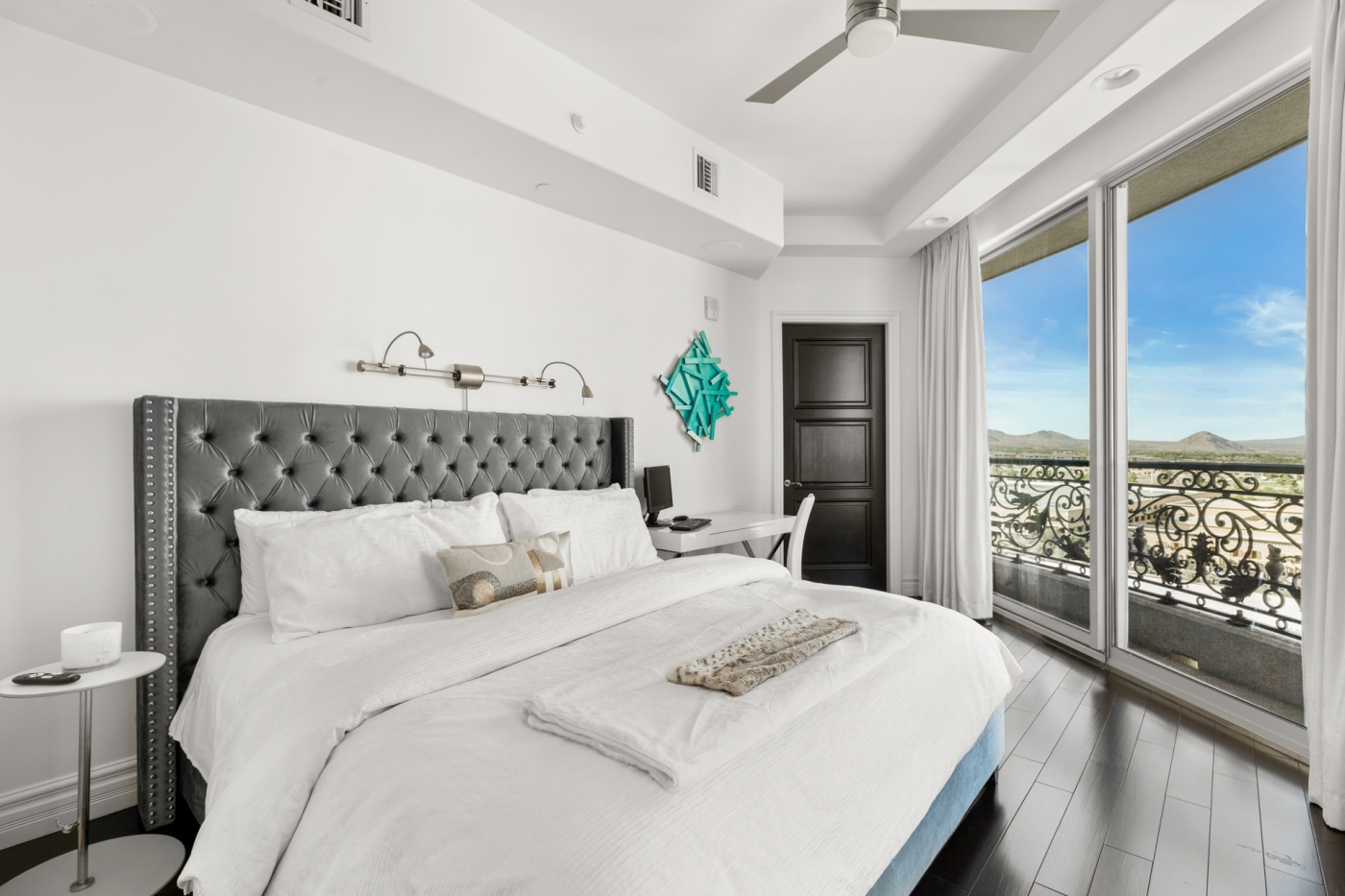 Find both honed and polished natural stone, richly-grained wood, painted kitchen cabinets, and stunning granite slab countertops, as well as exceptional lighting fixtures and ceiling fans that are both artistic and unusually effective. Understated flooring and draperies complement the decor, while bold wallpaper on accent walls and in the powder room supply dramatic impact. Lacy wrought-iron balcony railings add a romantic and whimsical note to this fine example of the Las Vegas luxury lifestyle. A Queensridge Place address provides owners with a wealth of amenities. The guard-gated community offers concierge services, security, private owner and guest parking, a pet park, both indoor and outdoor pools, and spas, and an exercise center and fitness room. In addition, the building has wine lockers, an active residential social calendar, and a dedicated theater, screening room, and private recreation room for resident use.