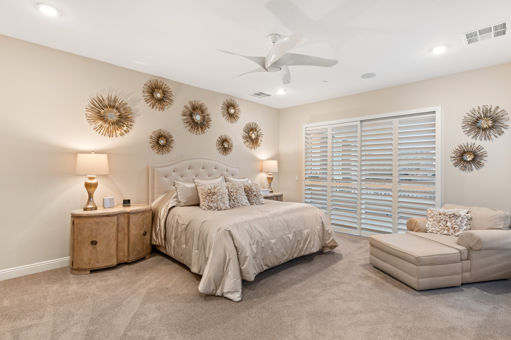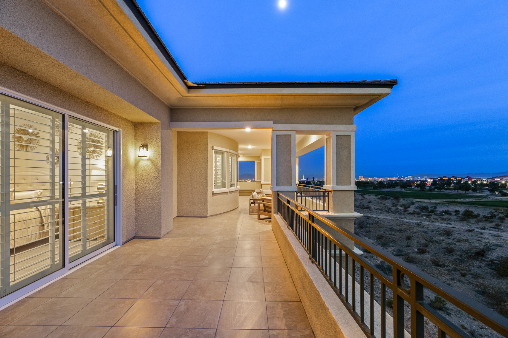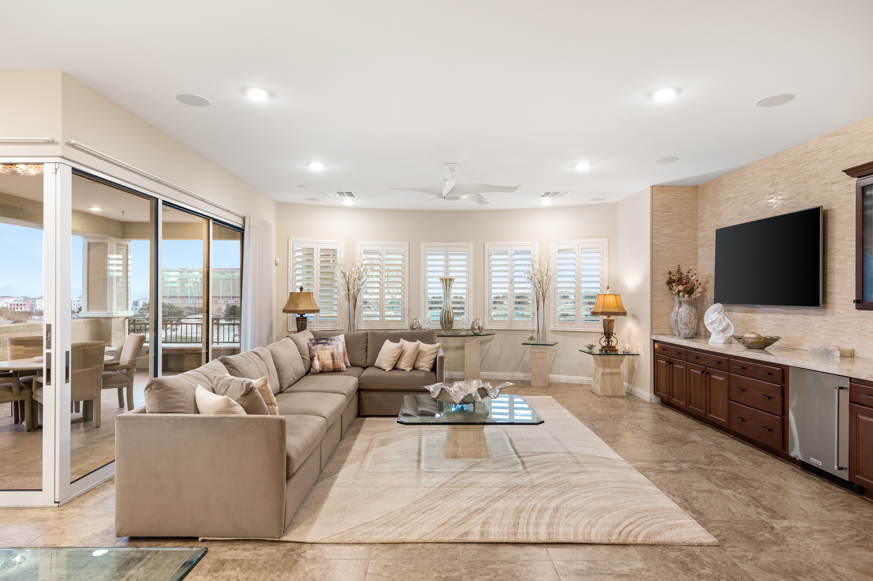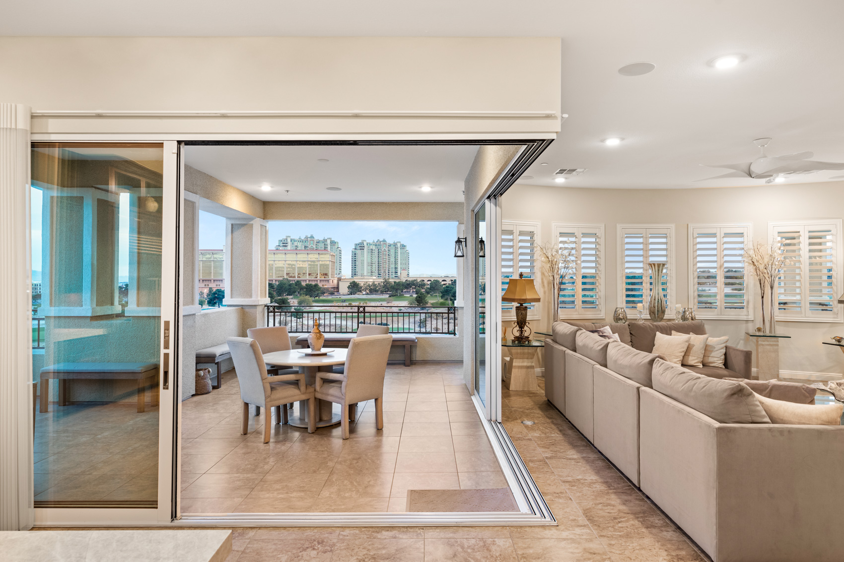 Step inside to discover an open, light-filled layout adorned with modern elegance. Expansive windows and corner stacking sliders in the living room seamlessly blend indoor and outdoor living, filling the home with natural light and showcasing panoramic views of the Las Vegas Strip, the golf course, and the surrounding mountains. Plantation shutters throughout add a touch of timeless refinement, allowing for complete control over light and privacy.