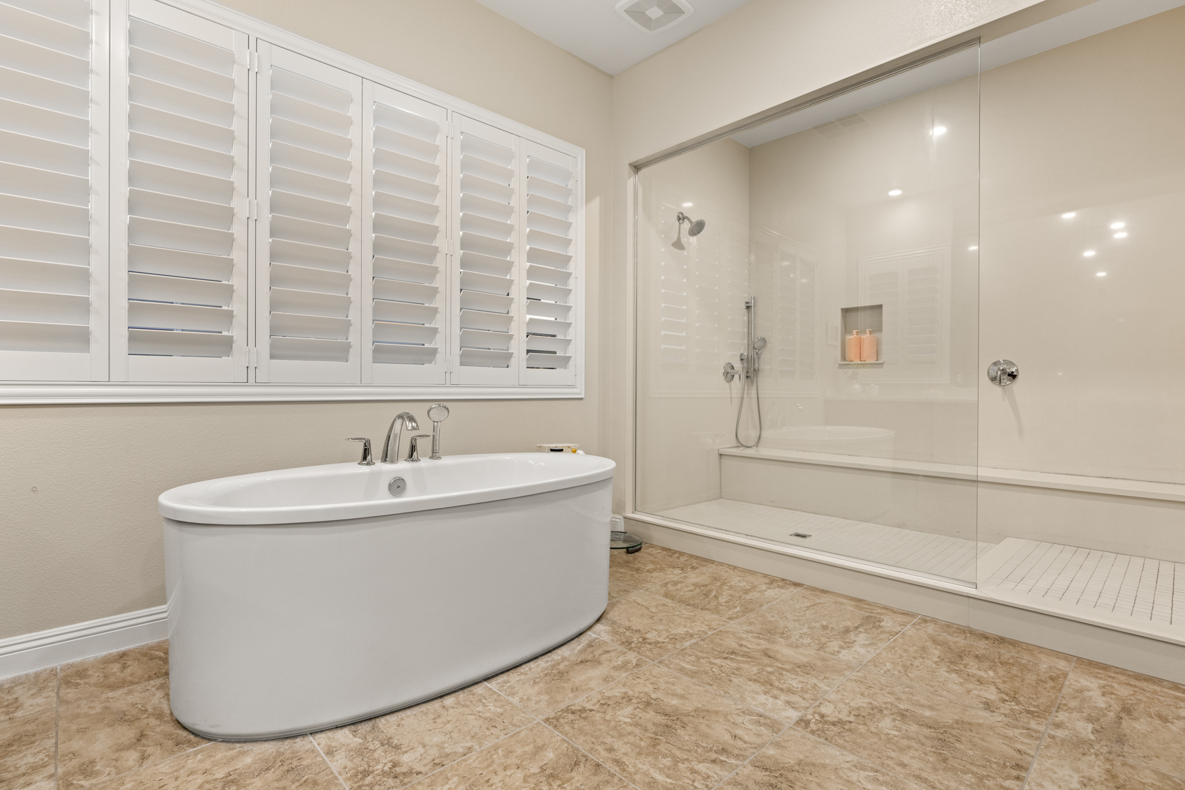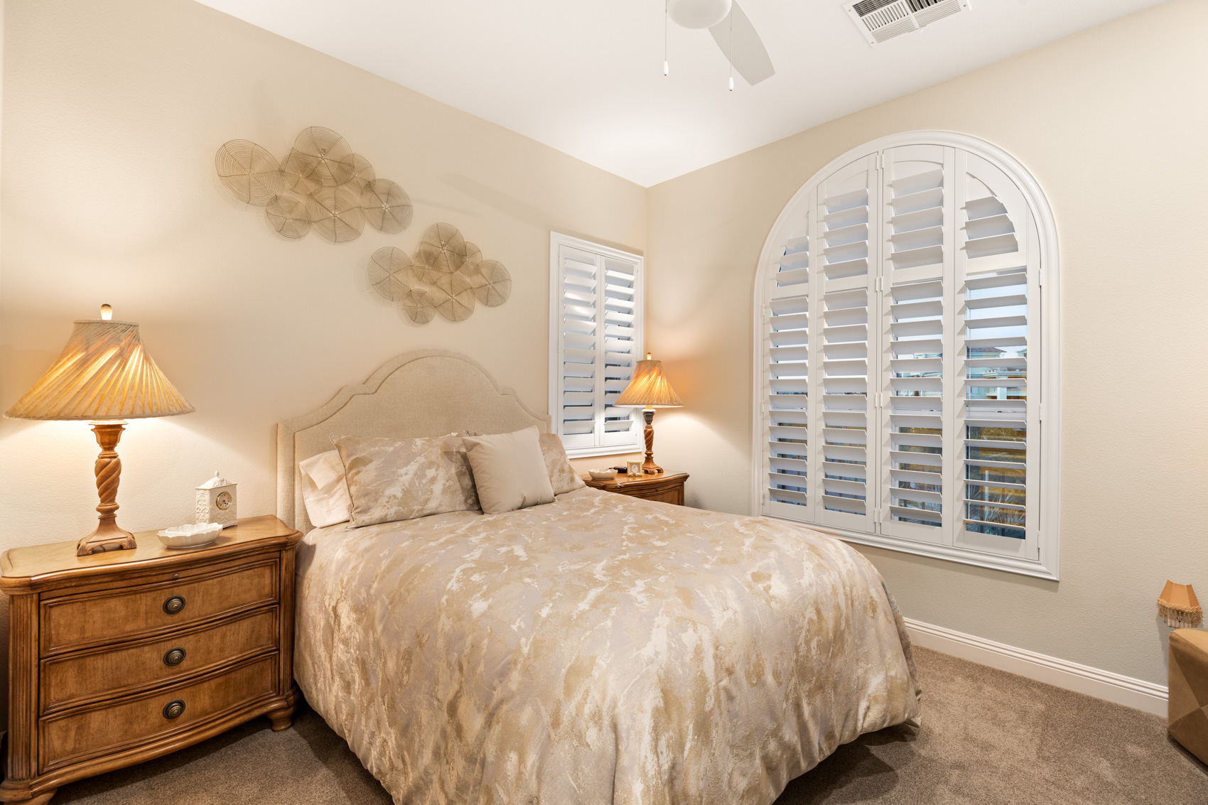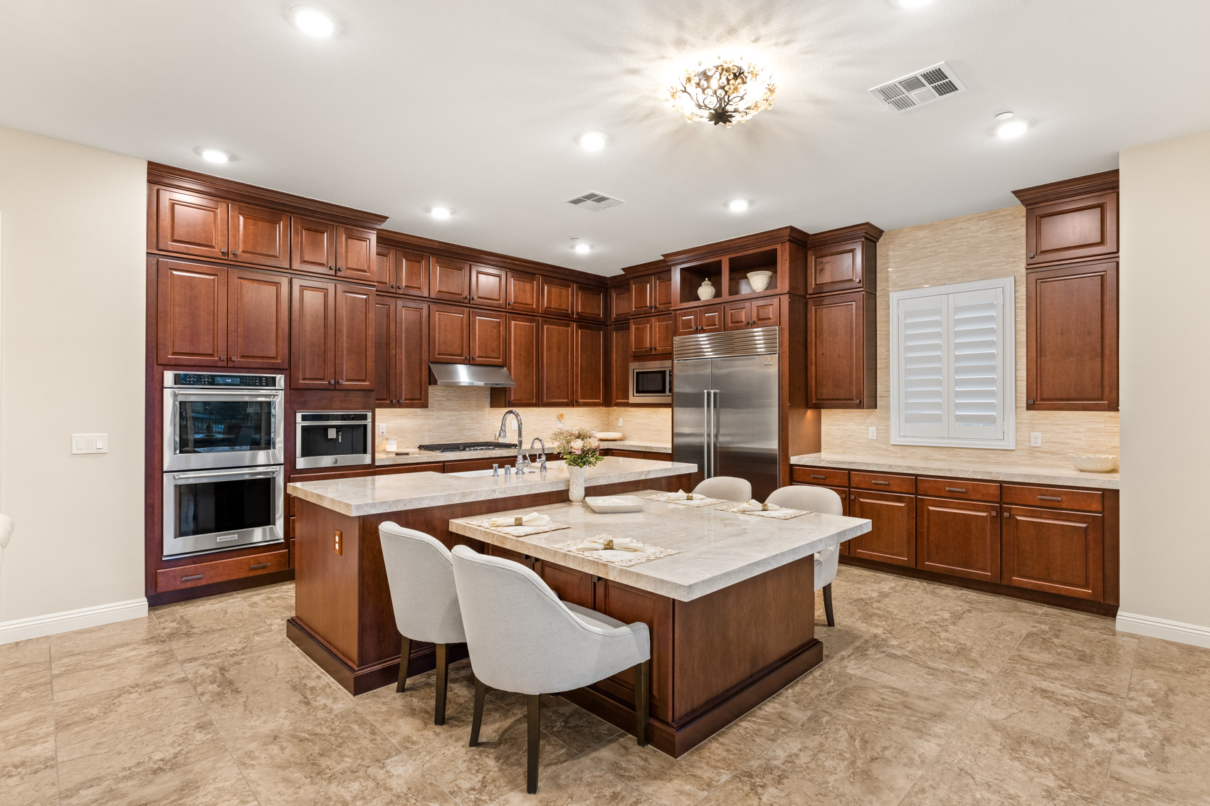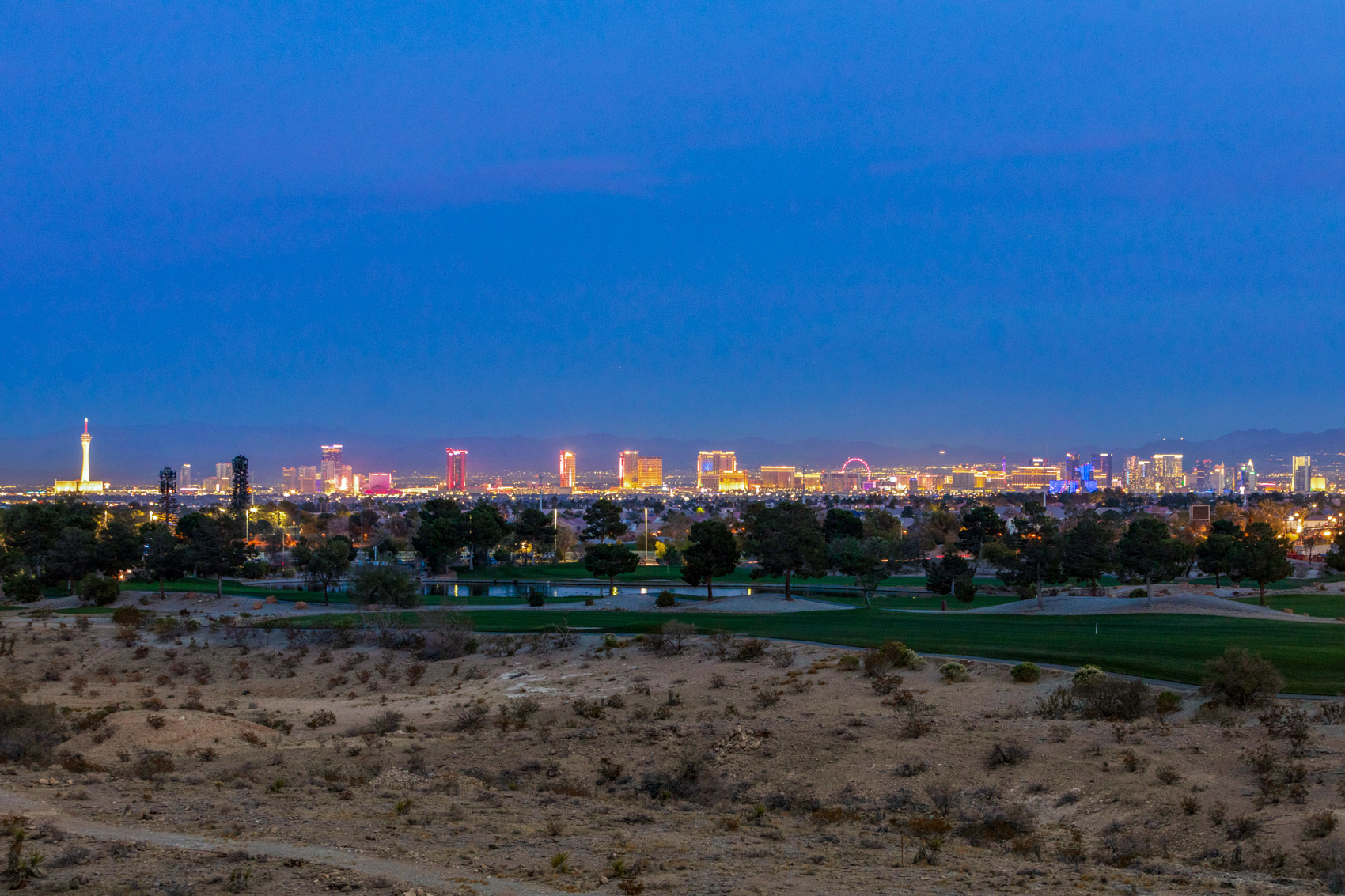 Step inside to discover an open, light-filled layout adorned with modern elegance. Expansive windows and corner stacking sliders in the living room seamlessly blend indoor and outdoor living, filling the home with natural light and showcasing panoramic views of the Las Vegas Strip, the golf course, and the surrounding mountains. Plantation shutters throughout add a touch of timeless refinement, allowing for complete control over light and privacy.