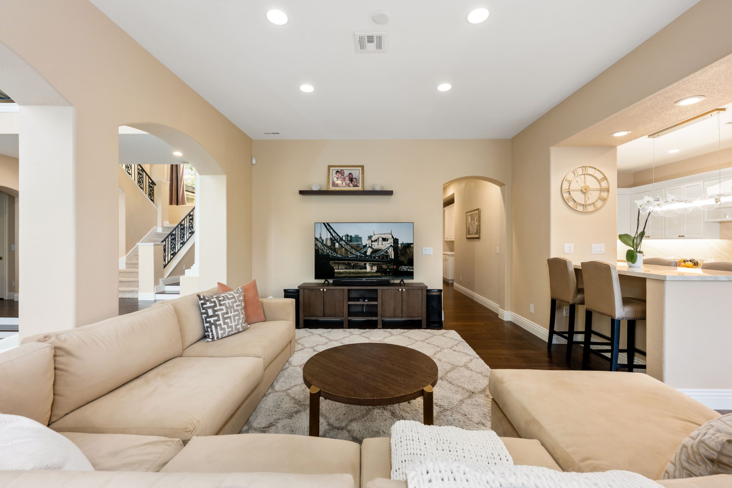 Beautifully maintained, the home features a highly functional layout with a spacious downstairs primary suite, five additional well-sized guest bedrooms, and multiple versatile flex spaces ideal for offices, gyms, playrooms, or media lounges. Inside, warm wood flooring flows throughout the home, complemented by soaring double-height vaulted ceilings in the living room that create a dramatic yet inviting sense of scale.