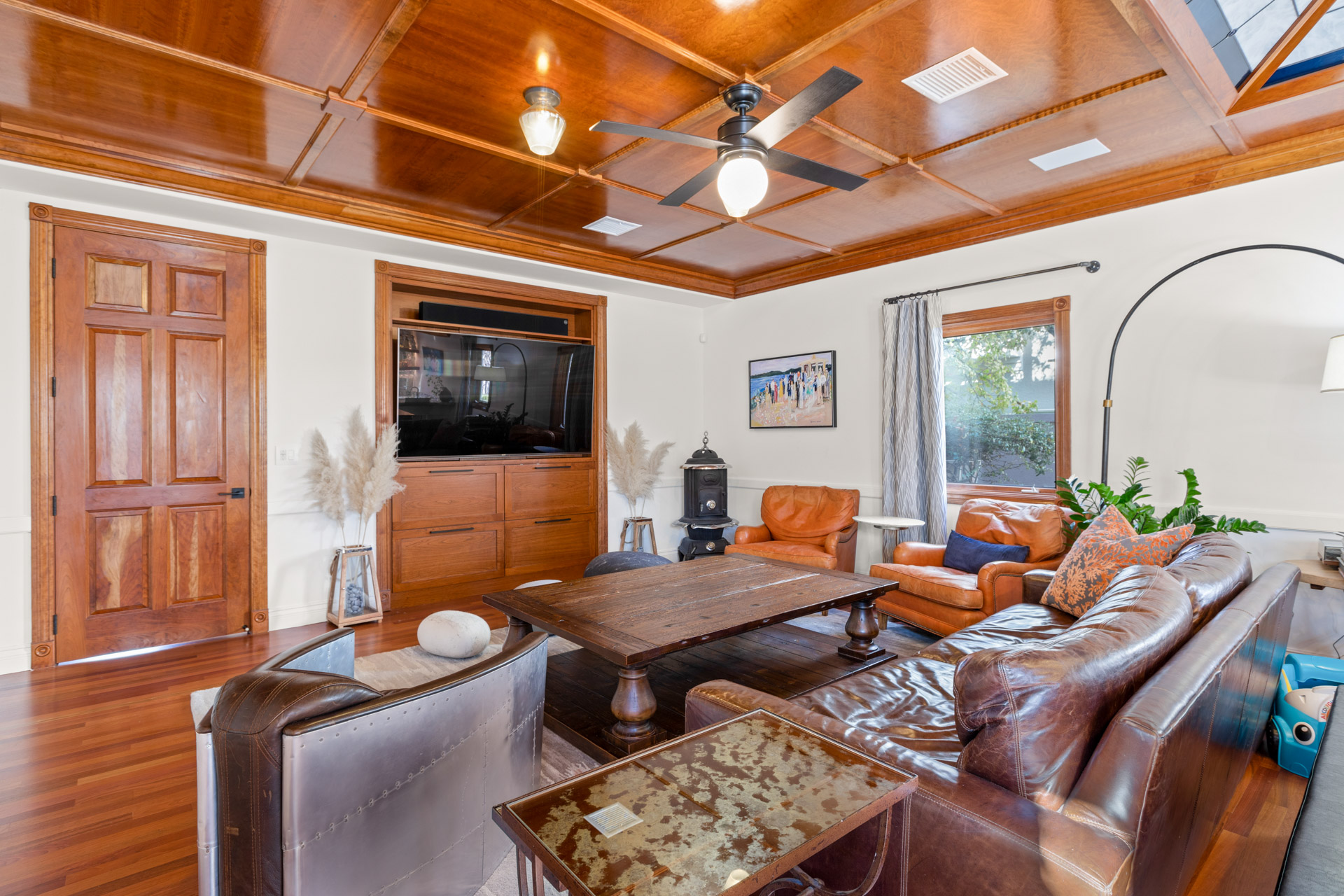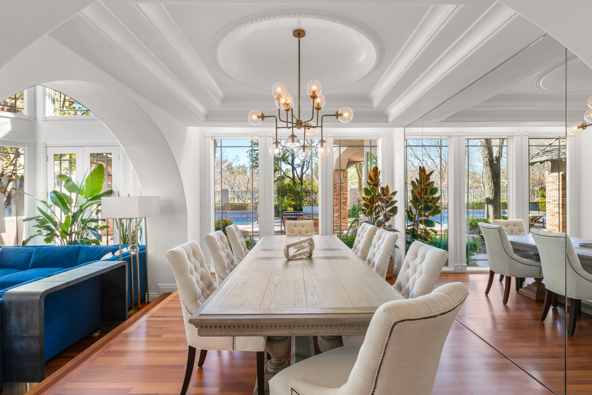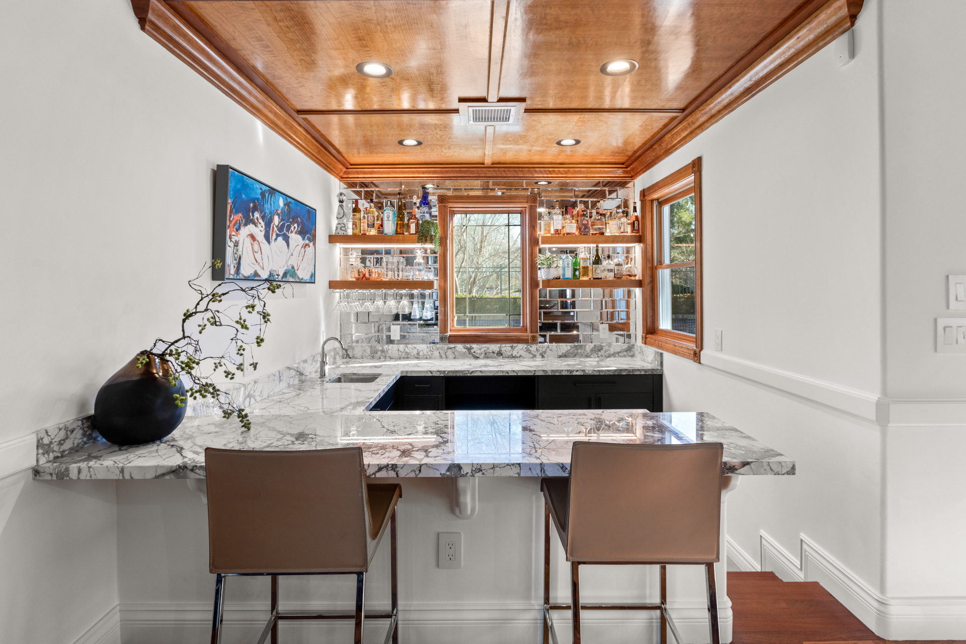 A large wet bar with counter seating is located to serve both formal and informal spaces. It has wood flooring and a unique wood ceiling that complements the decor of a comfortable adjacent den/media room. The master suite features an elegant, minimalist approach, with a soaring ceiling, a built-in window seat, and access to a private outdoor space. The ensuite bath boasts dual lavatories, a freestanding modern soaking tub, and a glass-walled shower. A fully fenced and landscaped rear yard encourages family gatherings and can handle crowds with ease, with a large, covered patio, built-in grill, and serving counter.