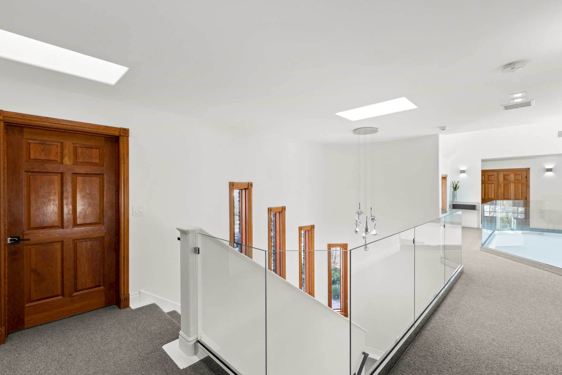 No architectural or design feature shouts for attention in this superbly executed contemporary estate in Eagle Hills. Instead, there is a pleasing harmony that characterizes the whole, enriching every aspect of a highly individualized two-story residence built originally in 1995. With the appearance of a stately manor, the home has a steeply pitched roofline, dormer windows, brick corner quoins, and a brick section with slender window openings reminiscent of a castle turret. A curved drive leads to the entry, with adjacent garage space for three vehicles.