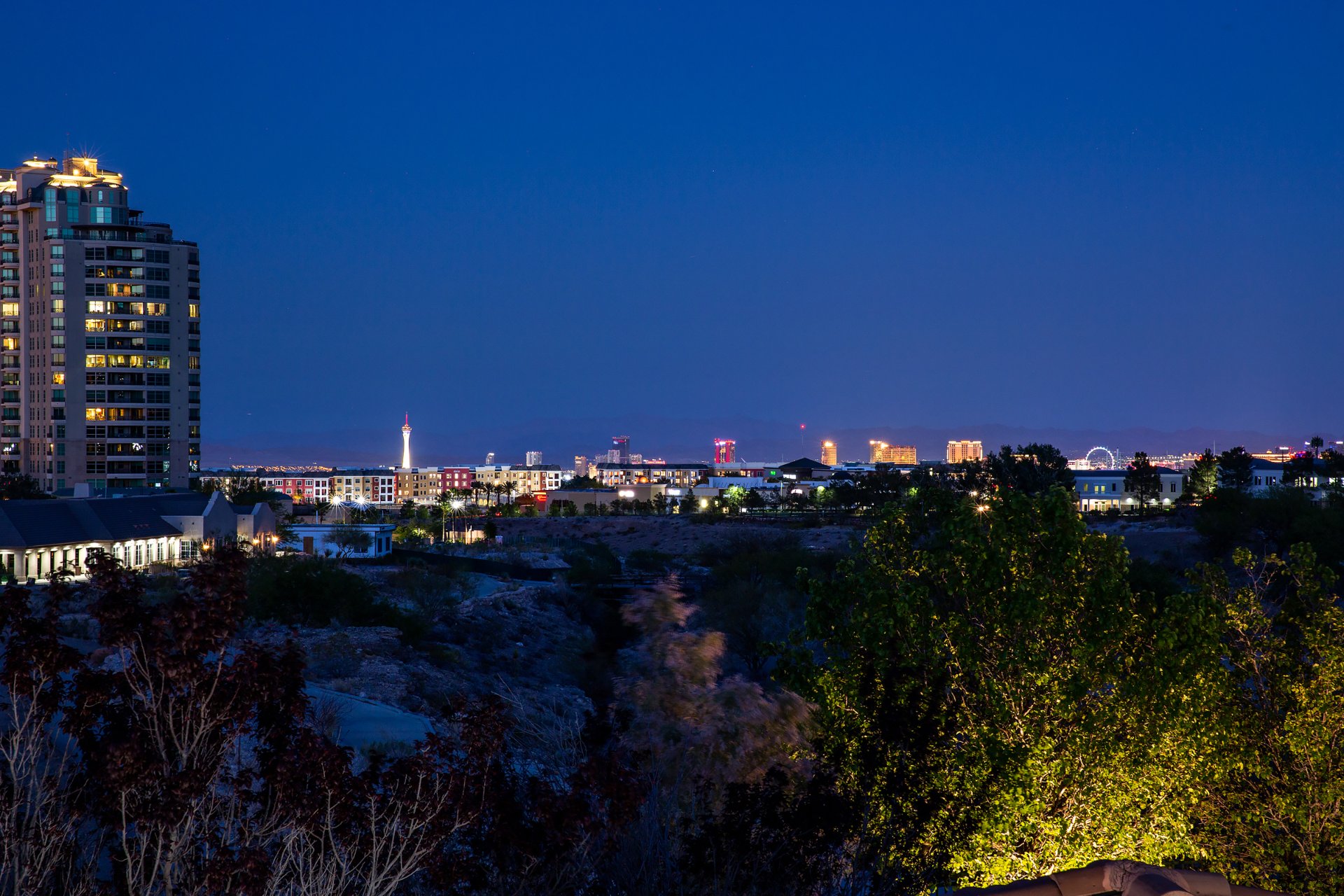 This spectacular estate is located on a half-acre cul de sac lot in the Queensridge community. The home's facade is graced by natural stone and a unique tile accent wall. A dramatic arched entry door is highlighted by repeating arches, with windows on either side. Garage parking for six vehicles enhances the impression of estate living.