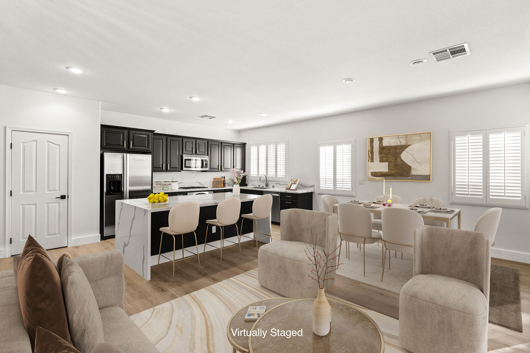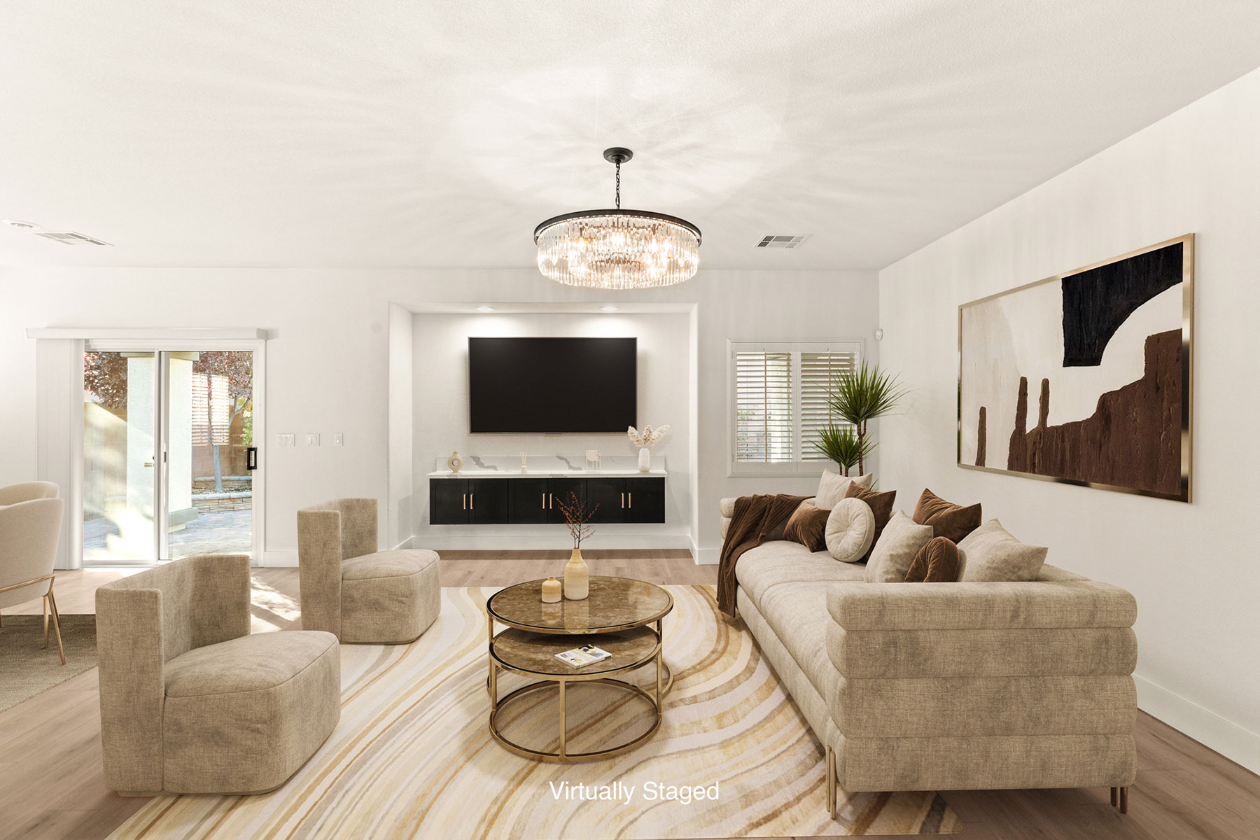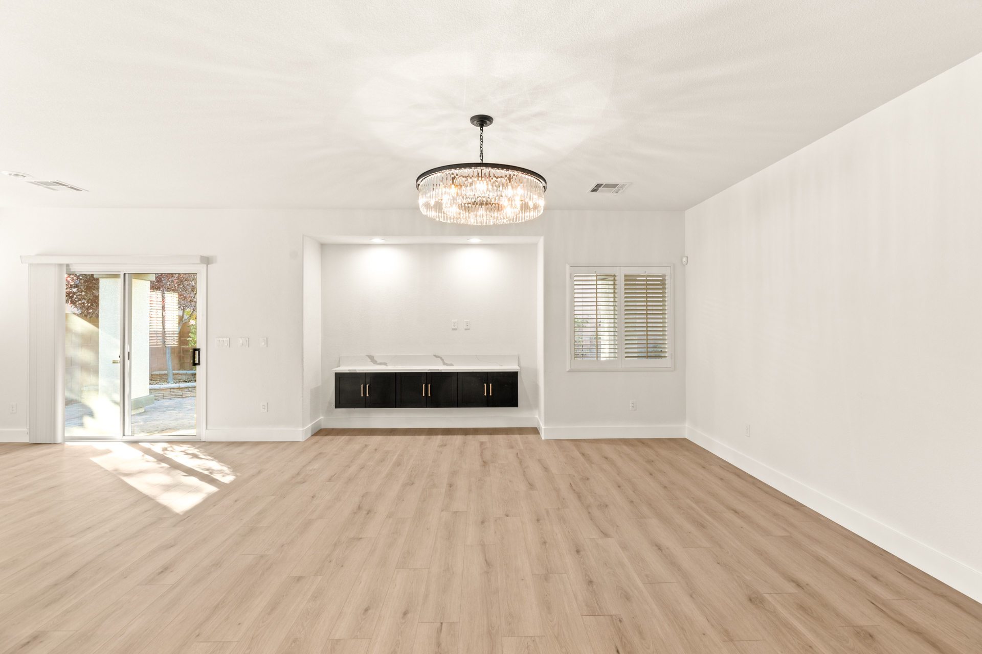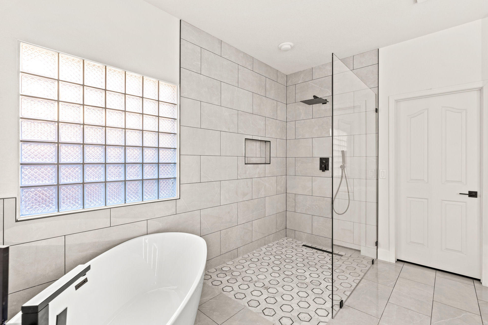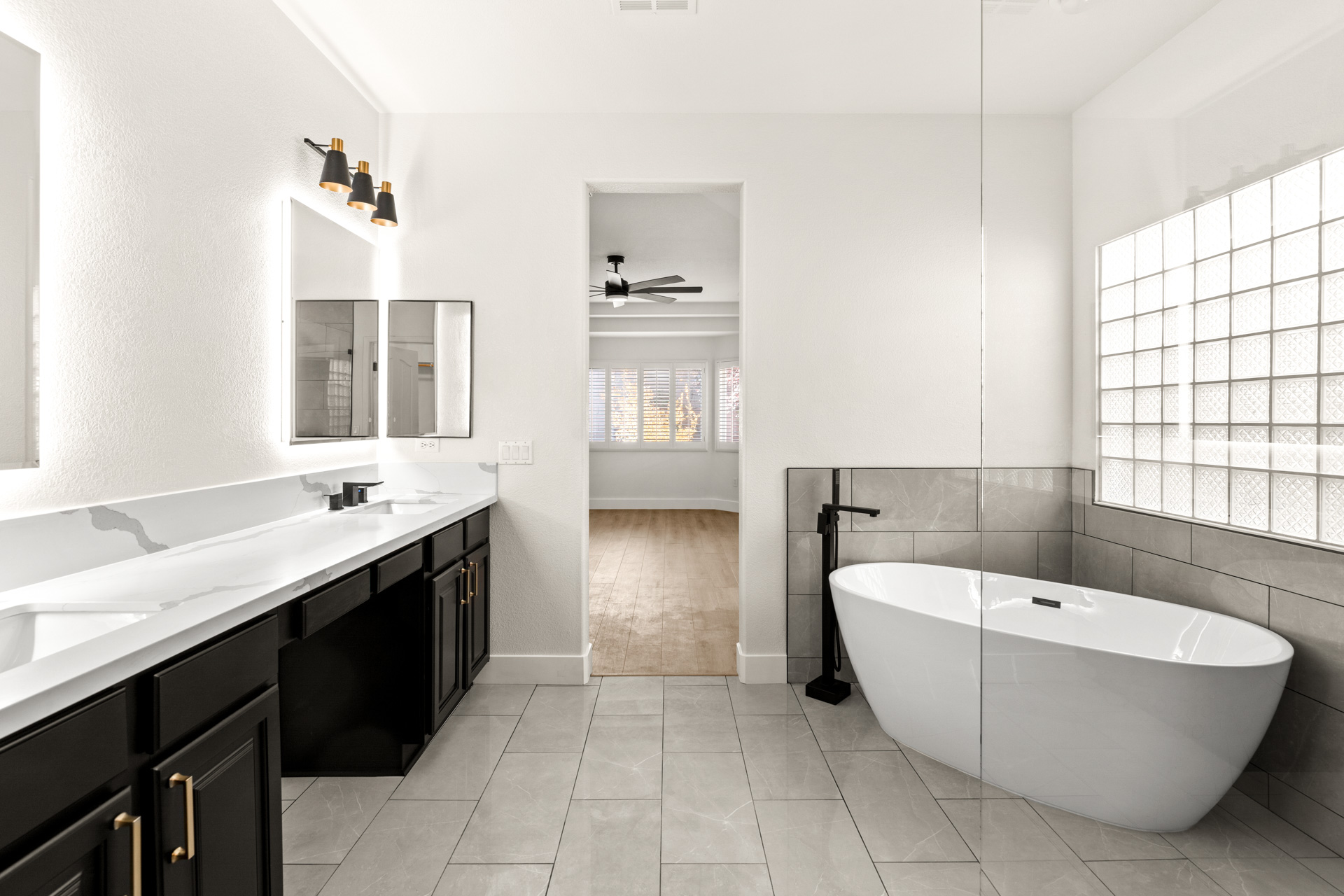 This single story Summerlin home has it all! From the stunning light oak LVP flooring, to the Calacatta Quartz countertops and waterfall island, this home allows entertaining with ease! Chic new lighting fixtures dress up the primary bathroom that has been refitted with new tile, bathtub, walk-in zero threshold shower, LED backlit mirrors with anti-fogging technology, and more!