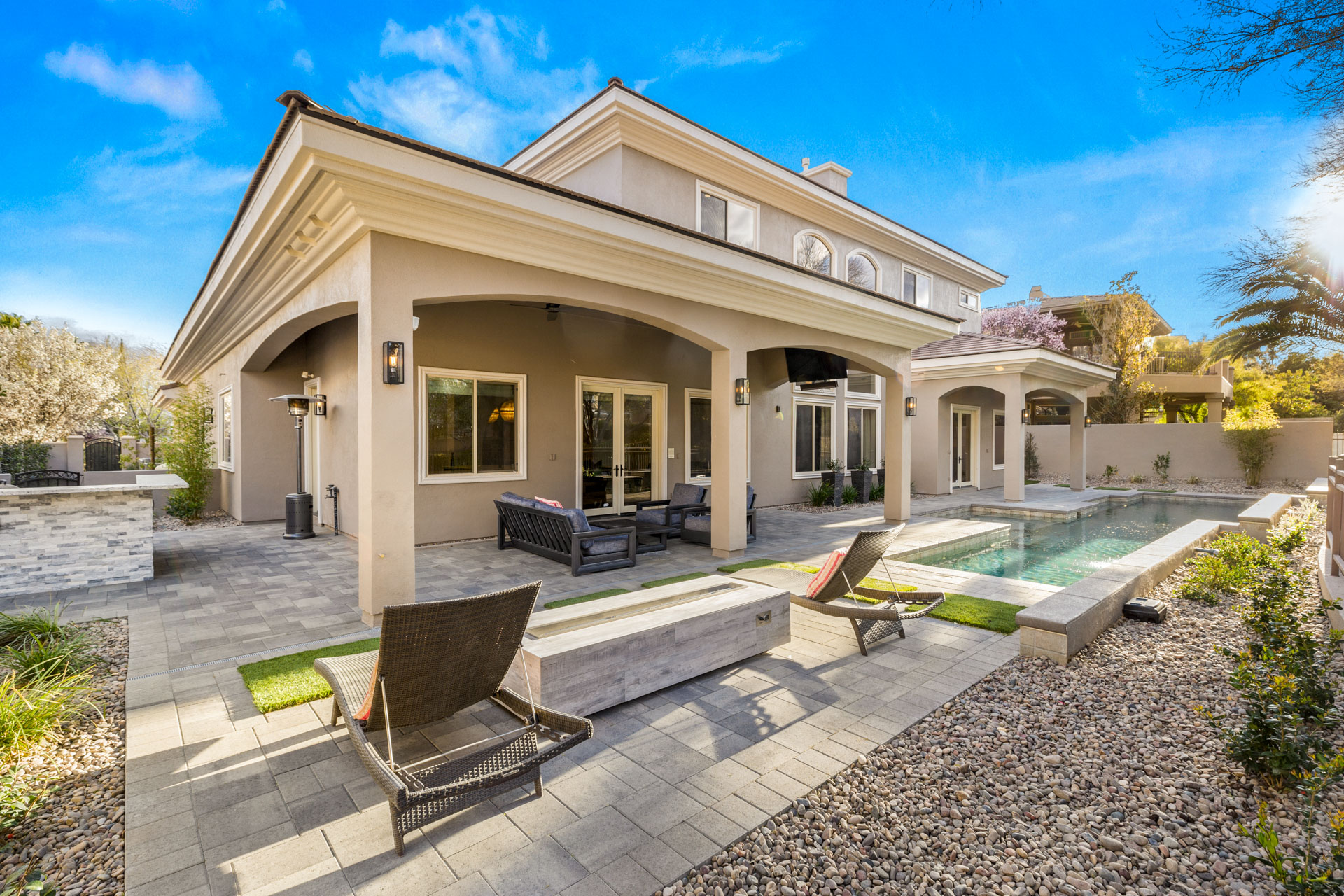 One of the home's most stunning features is the gourmet kitchen, with custom cabinetry, professional-grade appliances, granite countertops, and two spacious kitchen islands. Other notable features throughout the home include a 3-car garage, a custom-build wine cellar, floor-to-ceiling windows, and fully-equipped wet bar off the living room. This home has five bedrooms, six bathrooms, and a media room upstairs. The primary bedroom features its own private entrance to the backyard, a gas fireplace, separate walk-in closets, and a spa bathroom with dual vanities, a walk-in shower, and a soaker tub. Complementing the home's magnificent interior, the outdoor area is truly an entertainer's dream. With all of the echoes of a world-class resort, this property boasts a private courtyard, which integrates into the wrap-around patio with stone pillars, a barbeque area, a fireplace, and a resort-style pool and spa--all surrounded by mature landscaping for added privacy. If you're looking for a classic, luxurious home in one of Summerlin's most prestigious communities--it's all here!