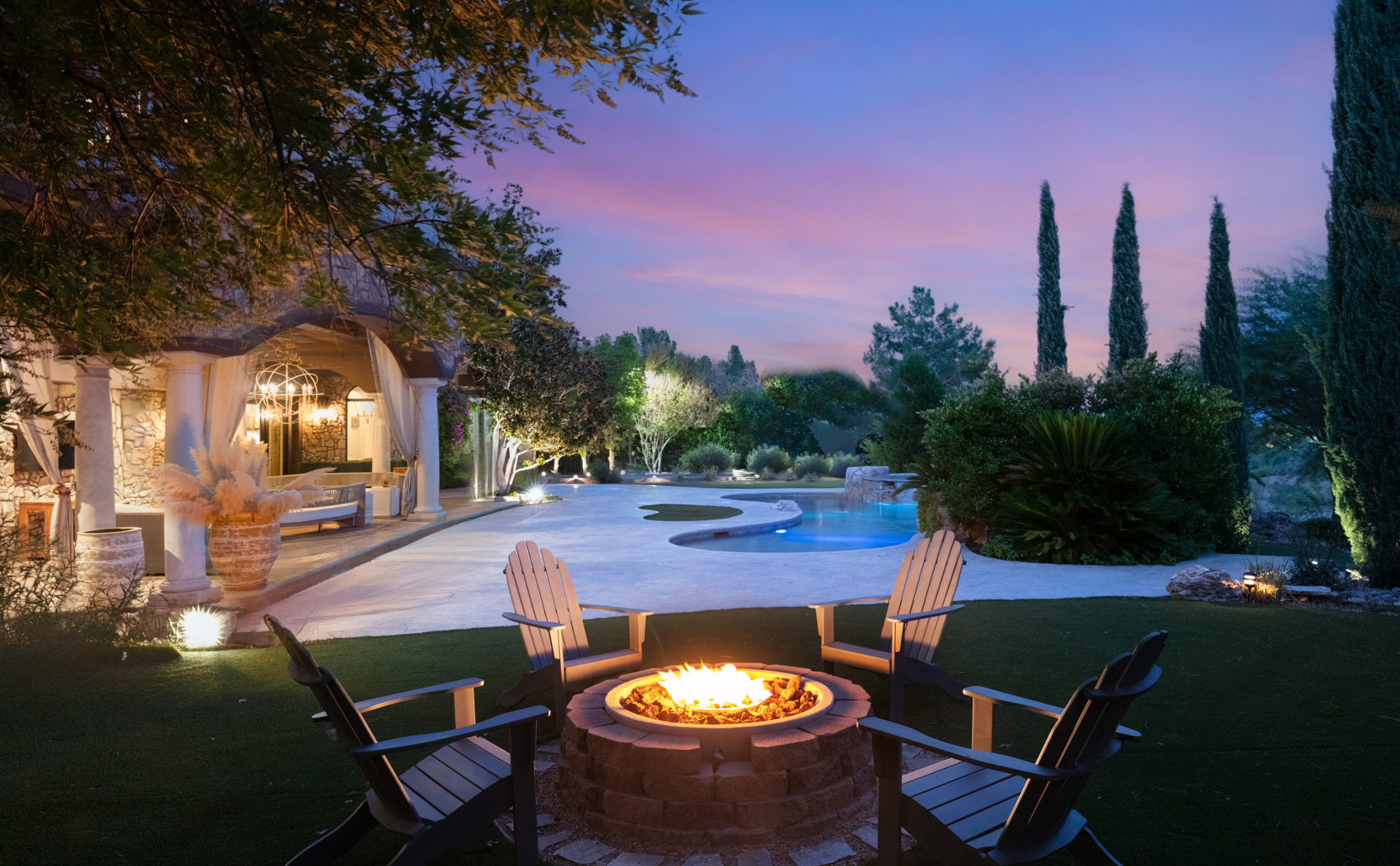 Inside, nearly 10,000 square feet of thoughtfully designed living space unfolds with rich designer finishes and masterful craftsmanship at every turn. Coffered ceilings, custom millwork, and architectural detailing define the main level, where a formal living room with soaring ceilings and dramatic windows flows effortlessly into a full-service bar and temperature-controlled wine cellar—perfect for gatherings of any scale. The adjacent great room and breakfast nook overlook the backyard oasis, while the chef’s kitchen is outfitted with top-of-the-line appliances, custom cabinetry, and a large center island, complemented by a separate catering kitchen tucked discreetly behind. The estate includes 5 spacious bedrooms and 8 luxurious bathrooms, offering comfort and privacy for family and guests alike. A separate junior suite on the main level features its own fireplace and a spa-like bath with an oversized jetted soaking tub. Upstairs, the expansive primary suite is a private sanctuary complete with its own fireplace, sitting retreat, oversized walk-in shower, jetted jacuzzi tub, and an enormous walk-in closet with custom built-ins. Multiple balconies throughout the home offer tranquil views of the lush grounds and Las Vegas skyline. Additional highlights include a separate office, acoustically treated home theater, elevator, and four-car garage. Outdoors, the resort-style backyard is a showpiece, with two dramatic pools enhanced by rock formations and cascading water features, a spa, oversized covered patio, outdoor kitchen, bocce ball court, putting green, and panoramic Strip views—creating the ultimate escape without ever leaving home. Surrounded by 161 mature trees, the estate offers extraordinary privacy rarely found in Las Vegas. Tucked within the coveted Queensridge community—known for its tree-lined streets, European-inspired architecture, and close proximity to world-class dining, shopping, and golf—this is a rare opportunity to own one of the area’s most iconic homes. Estates of this caliber, with such abundant space, privacy, and architectural integrity, seldom come to market. Villa Firenze, where luxury lives effortlessly.