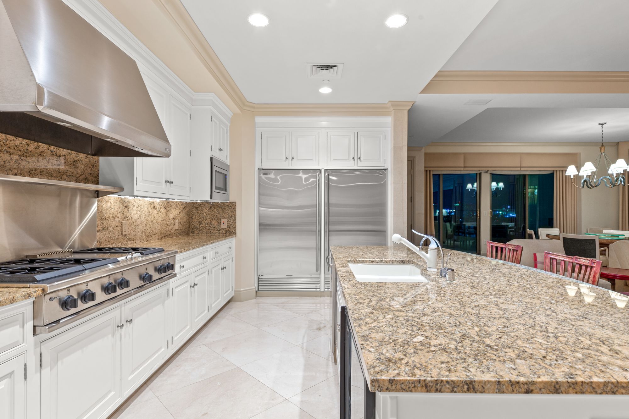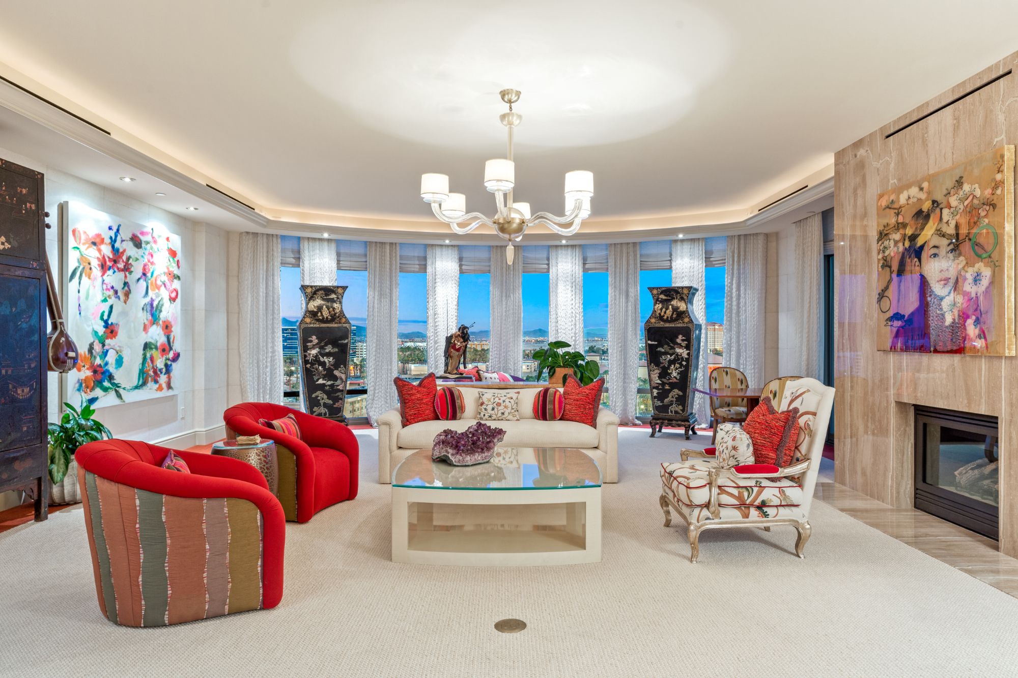 The open-plan interior features floor-to-ceiling windows that capture incredible skyline views from the formal living room with fireplace, a dining "pavilion" that's perfect for an oversize round table and chairs, and a den/ sitting room adjacent to the chef's kitchen that boasts upscale stainless appliances, a swath of granite counters and its own informal island eating bar.