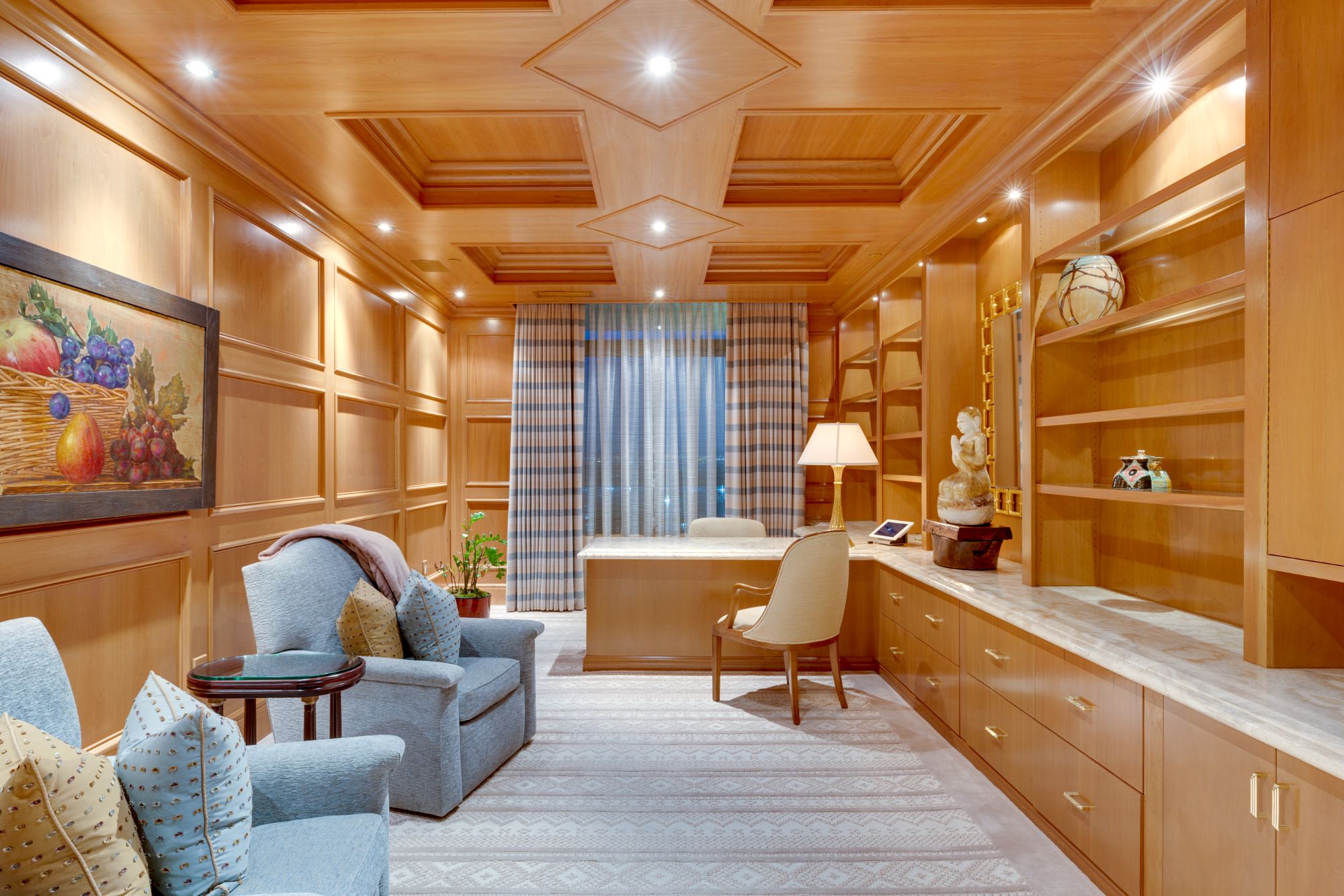 Step out onto surrounding high-rise decks from most rooms in the condo to enjoy the natural beauty all around you. A large sitting room with its own fireplace is situated just off the main living space, and it features additional space for al fresco dining. Caramel-toned paneling envelops an efficient home office/den in luxury, with a built-in desk, storage cabinets and bookcases, while the primary bedroom is a private retreat with a sumptuous bath that includes dual lavatories, an oversize glass-walled shower and separate tub, and a room-size closet/dressing room with custom storage. The condo includes three additional bedrooms and a total of five baths, with full building amenities available for owner use.
