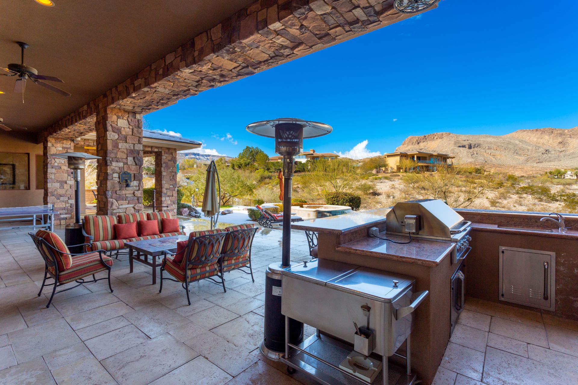 The dream backyard comes with a built-in fire pit, sports court, outdoor kitchen, tons of covered patio space with ceiling fans and misters, pool/spa, and unobstructed natural views.