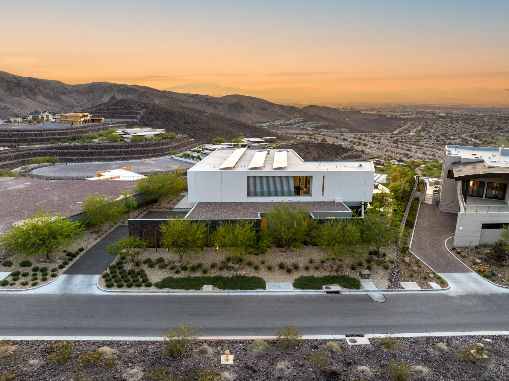 Step through a grand entryway into a soaring open-concept living space framed by 22-foot ceilings and floor-to-ceiling glass walls that dissolve the boundary between indoors and out. A custom sculptural staircase adds an artistic centerpiece, while expansive glass panels capture panoramic views from nearly every room, turning the skyline into living art. The chef’s kitchen is a vision of both form and function. Outfitted with an integrated Wolf and Sub-Zero appliance package, dual dishwashers, and a spacious prep pantry, it is designed to accommodate everything from everyday meals to grand-scale entertaining. A sleek Dacor wine station and adjacent glass wine cellar enhance the dining experience, while an oversized island anchors the space with seamless flow into the great room and dining area. This home was designed for entertaining and relaxation alike, with flexible spaces including a media/game room and a second-floor lounge, both featuring full wet bars. Step outside to the upper-level balcony fire lounge, where you’ll find one of the most mesmerizing views in the valley—a front-row seat to the glittering lights of Las Vegas, perfect for evening cocktails or quiet reflection. The main-level primary retreat is a private sanctuary, complete with spa-inspired amenities including an indoor-outdoor shower, luxurious finishes, and direct access to the backyard oasis. Each of the eight bedrooms offers generous proportions and en-suite bathrooms, ensuring comfort and privacy for all residents and guests. Throughout the home, no detail has been overlooked. Neolith stone fireplace walls bring a natural yet modern elegance to the living areas. Custom wall treatments, Control4 whole-home automation, and sustainable solar energy integration bring elevated convenience and efficiency to everyday living. Outdoors, the resort-style backyard continues the experience of curated luxury. A zero-edge pool and spa invite you to unwind in style, while two sleek fire features and a built-in barbecue area set the stage for unforgettable evenings under the desert sky. With a four-car garage and ample space for guests and storage, this residence offers both practicality and polish in every corner. Living in Ascaya is more than a lifestyle—it is a privilege. Located in the heart of Henderson, Ascaya is one of the most sought-after luxury communities in Southern Nevada. Residents enjoy 24/7 guard-gated security, breathtaking desert architecture, and an elevated sense of privacy and exclusivity. The award-winning Ascaya Clubhouse offers resort-style amenities including a state-of-the-art fitness center, private cabanas, tennis and pickleball courts, a yoga studio, and a social lounge. Community events and curated experiences foster a sense of connection while preserving tranquility. Just minutes from world-class golf courses, fine dining, The District at Green Valley Ranch, and top-rated schools, Ascaya offers the perfect balance of seclusion and accessibility. And with the Las Vegas Strip and Harry Reid International Airport only a short drive away, convenience is never compromised. 13 Rockstream Drive is more than a home—it is a statement of modern luxury, thoughtfully positioned in one of the most desirable enclaves in the country.